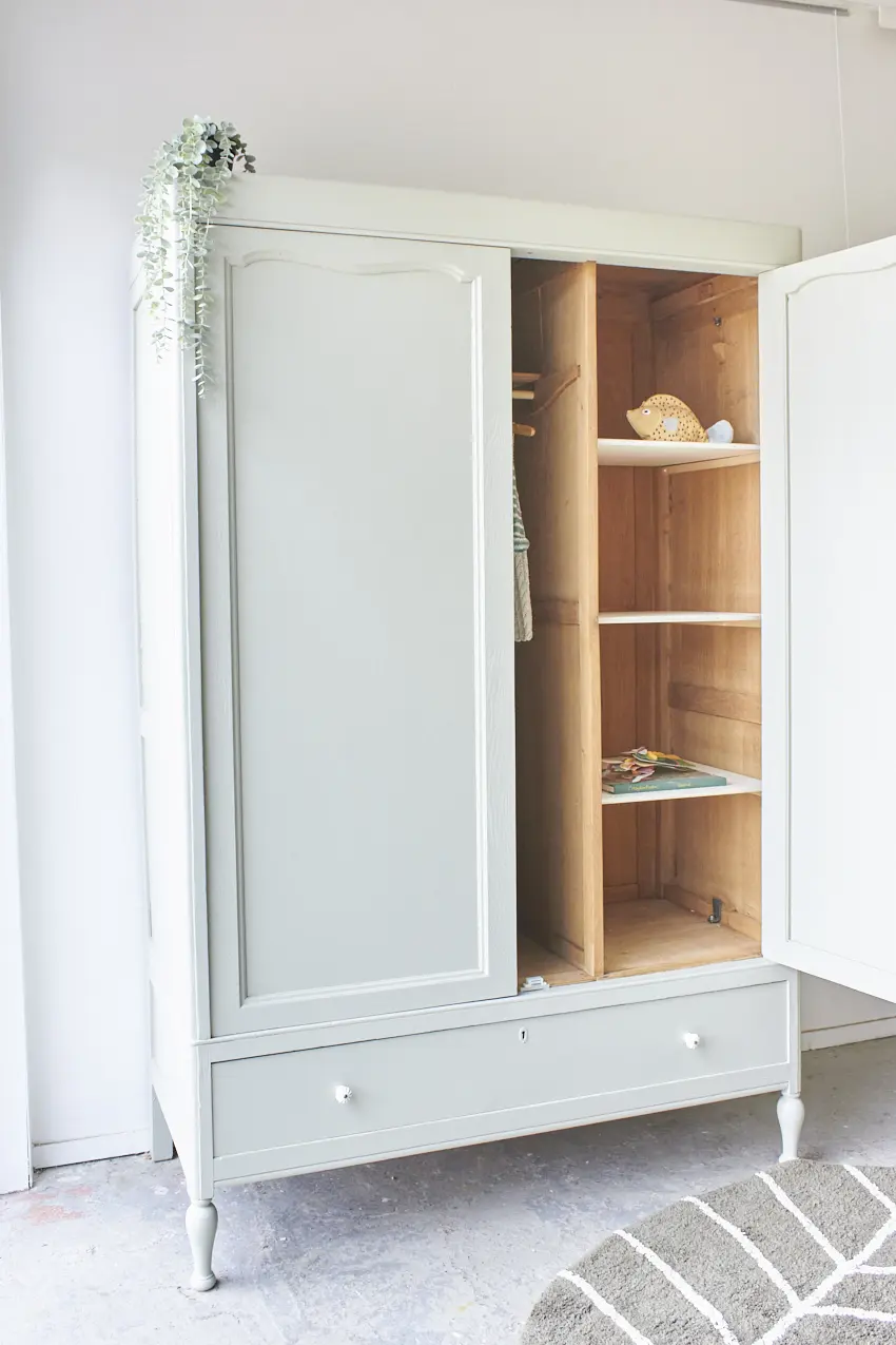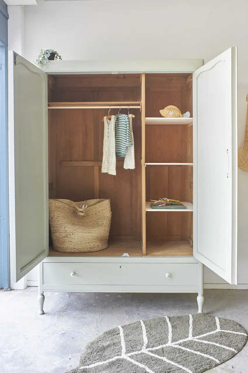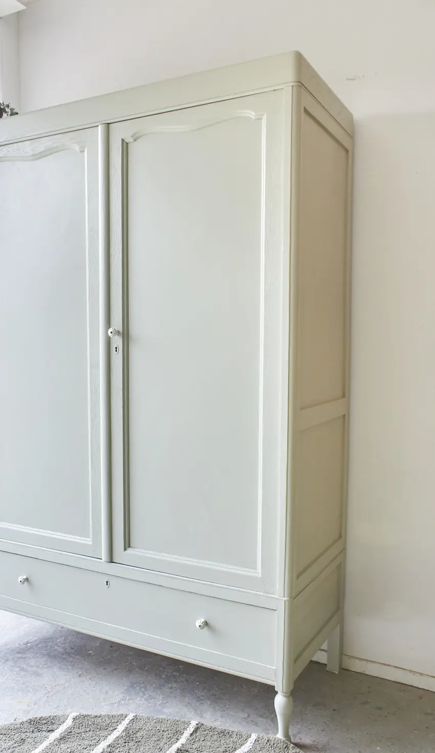 We hebben weer een demontabele tweedeurs kast, deze keer in onze kleur Voorjaar. Deze kast had eigenlijk 2 grote spiegels in de deuren, maar deze hebben we vervangen voor houten panelen. De spiegels waren erg groot, oud en gaven de kast een erg grof uiterlijk. En wat een verschil zeg, de kast heeft hierdoor een zacht toegankelijke uitstraling gekregen, zo fijn! En hoe leuk zijn de bolle pootjes. Na het zandstralen hebben we deze kast onze gebruikelijke poetsbeurt en anti houtworm behandeling gegeven. De originele indeling was niet compleet, op een tussenschot en een smalle plank na. Rechts van het tussenschot plaatsten we daarom 3 nieuwe planken en links een nieuwe roede. Tegen meerprijs kunnen we eventueel ook een extra plank links onderin plaatsen. De lades gaan weer soepel open en dicht en ook de deuren hangen weer recht. De linkerdeur sluit met een schuifje en de rechterdeur met een magneetje. We hebben deze kast geschilderd in onze kleur Voorjaar, een frisse zachte groene kleur. Voorjaar geeft deze grote kast een zacht uiterlijk, een perfecte kleur vonden wij. Op de lades en rechterdeur hebben we tenslotte porseleinen knopjes geplaatst. Wat een mooi resultaat!