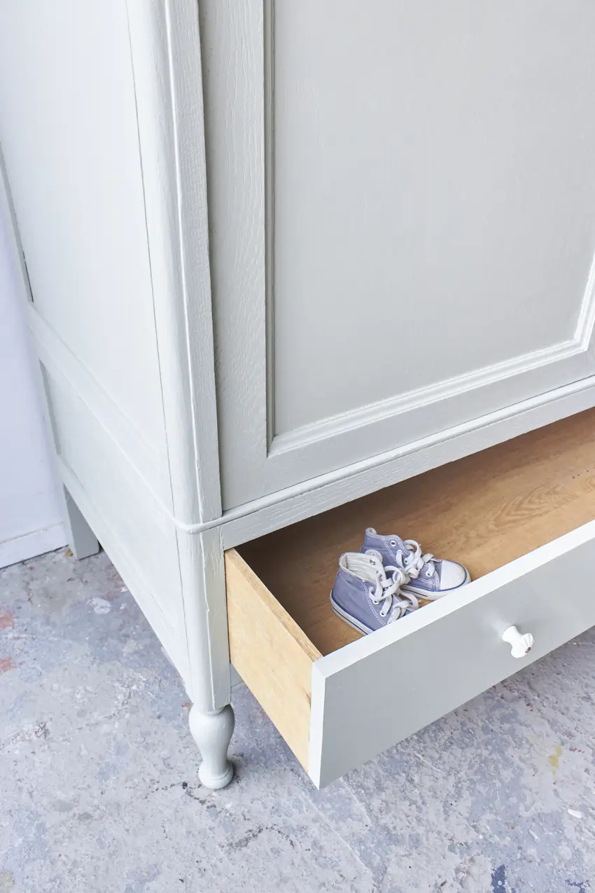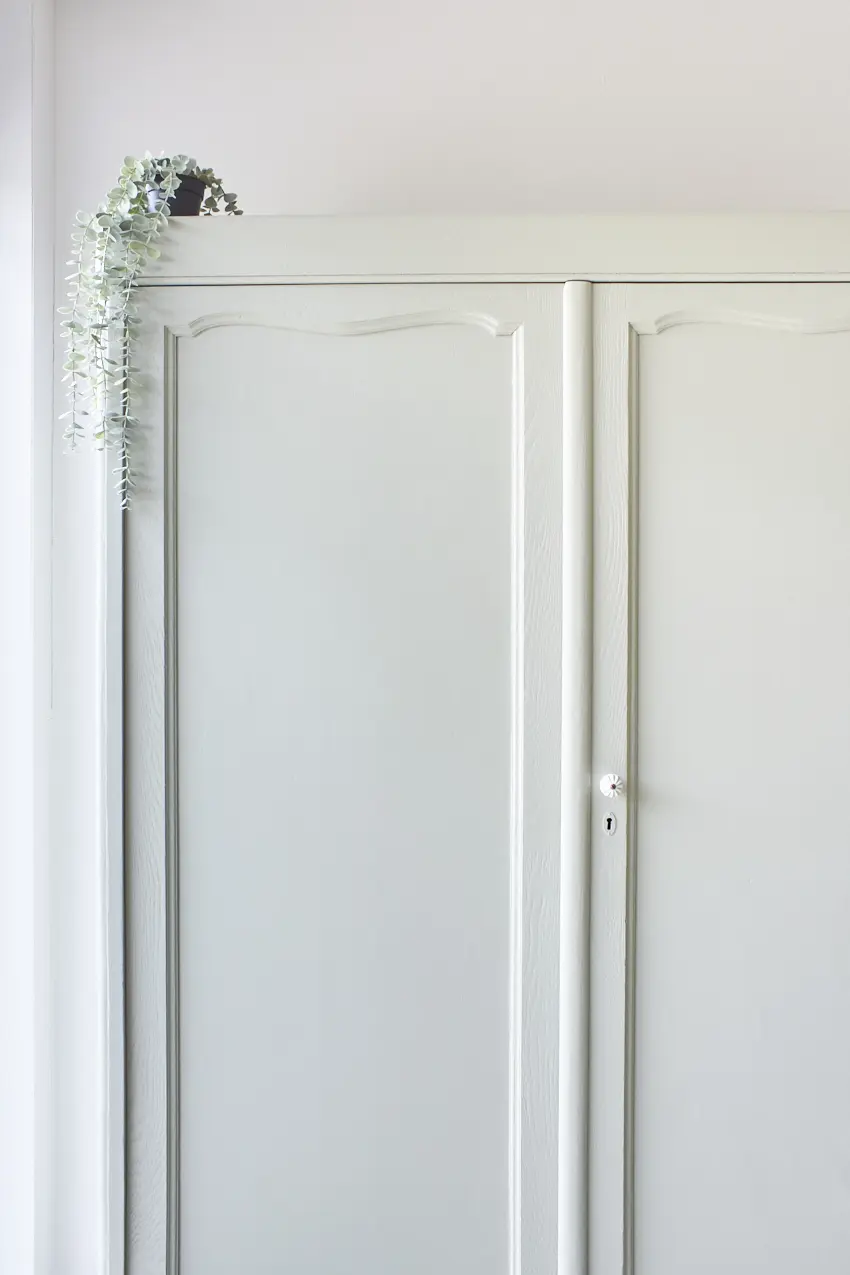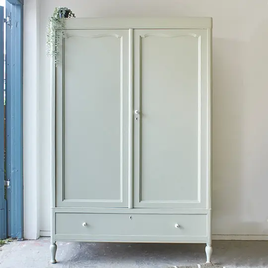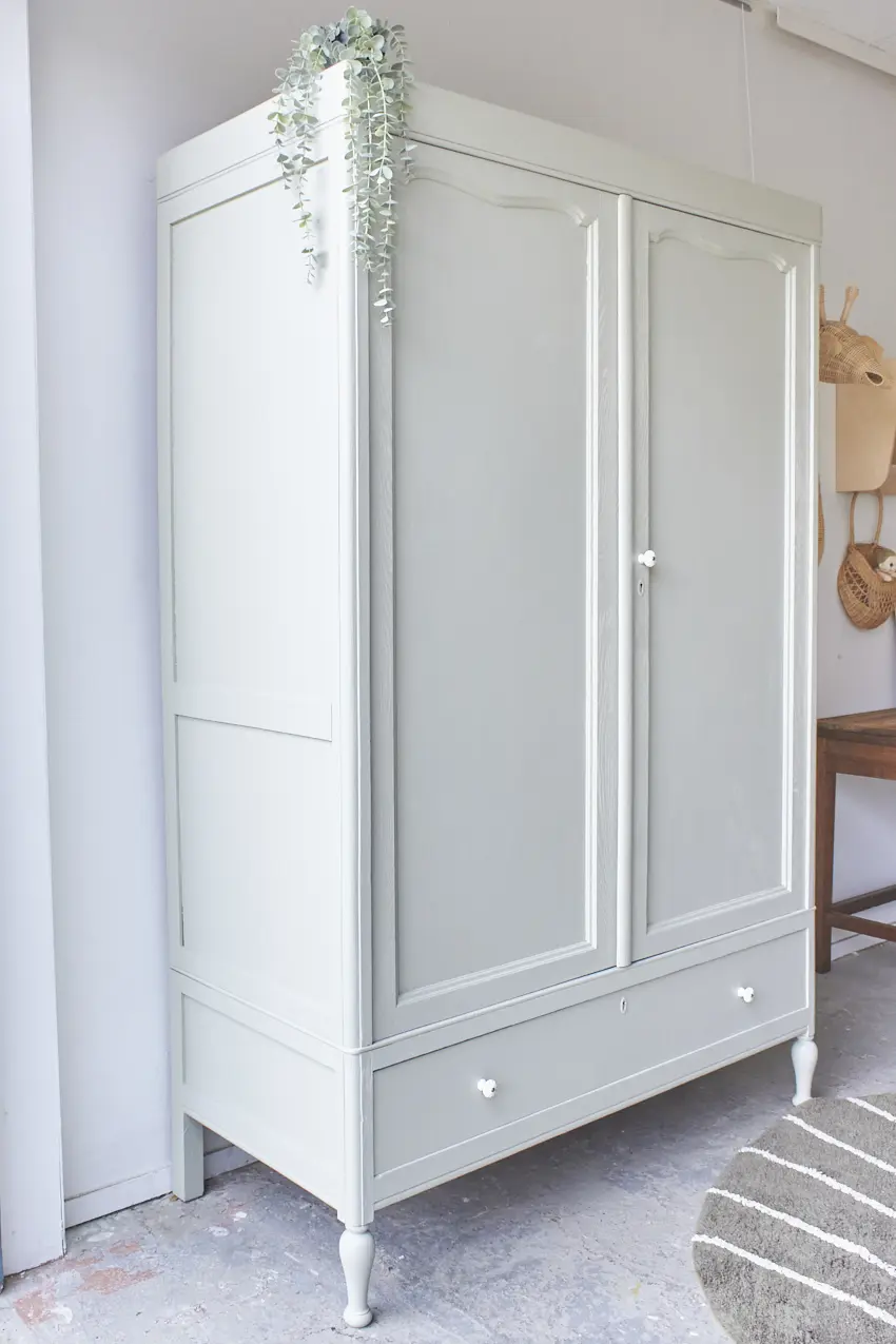 We hebben weer een demontabele tweedeurs kast, deze keer in onze kleur Voorjaar. Deze kast had eigenlijk 2 grote spiegels in de deuren, maar deze hebben we vervangen voor houten panelen. De spiegels waren erg groot, oud en gaven de kast een erg grof uiterlijk. En wat een verschil zeg, de kast heeft hierdoor een zacht toegankelijke uitstraling gekregen, zo fijn! En hoe leuk zijn de bolle pootjes. Na het zandstralen hebben we deze kast onze gebruikelijke poetsbeurt en anti houtworm behandeling gegeven. De originele indeling was niet compleet, op een tussenschot en een smalle plank na. Rechts van het tussenschot plaatsten we daarom 3 nieuwe planken en links een nieuwe roede. Tegen meerprijs kunnen we eventueel ook een extra plank links onderin plaatsen. De lades gaan weer soepel open en dicht en ook de deuren hangen weer recht. De linkerdeur sluit met een schuifje en de rechterdeur met een magneetje. We hebben deze kast geschilderd in onze kleur Voorjaar, een frisse zachte groene kleur. Voorjaar geeft deze grote kast een zacht uiterlijk, een perfecte kleur vonden wij. Op de lades en rechterdeur hebben we tenslotte porseleinen knopjes geplaatst. Wat een mooi resultaat!