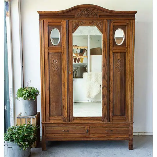 Deze mooie demontabele kledingkast, met prachtig houtsnijwerk, komt uit Frankrijk. Nadat we de kast in onze werkplaats in elkaar hadden gezet, besloten we hem niet te schilderen, maar in zijn originele staat te houden. Want wat is hij mooi! De kast is grondig schoongemaakt en heeft een aantal reparaties ondergaan. De buitenkant van de kast is behandeld met een voedende en beschermende olie. We hebben de kast vervolgens een nieuwe indeling gegeven. Bovenin hangt over de gehele breedte een roede. Aan de rechterkant van de kast zijn twee kleine plankjes geplaatst, met onderin weer een brede plank. Dus ruimte voor zowel hangkleding als legkleding. Ideaal! De spiegeldeur kan geopend en gesloten worden met de originele sleutel. Het smalle linker deurtje kan gesloten worden met een schuifje. En zo is deze ruime, bijzondere kledingkast weer helemaal klaar voor gebruik!