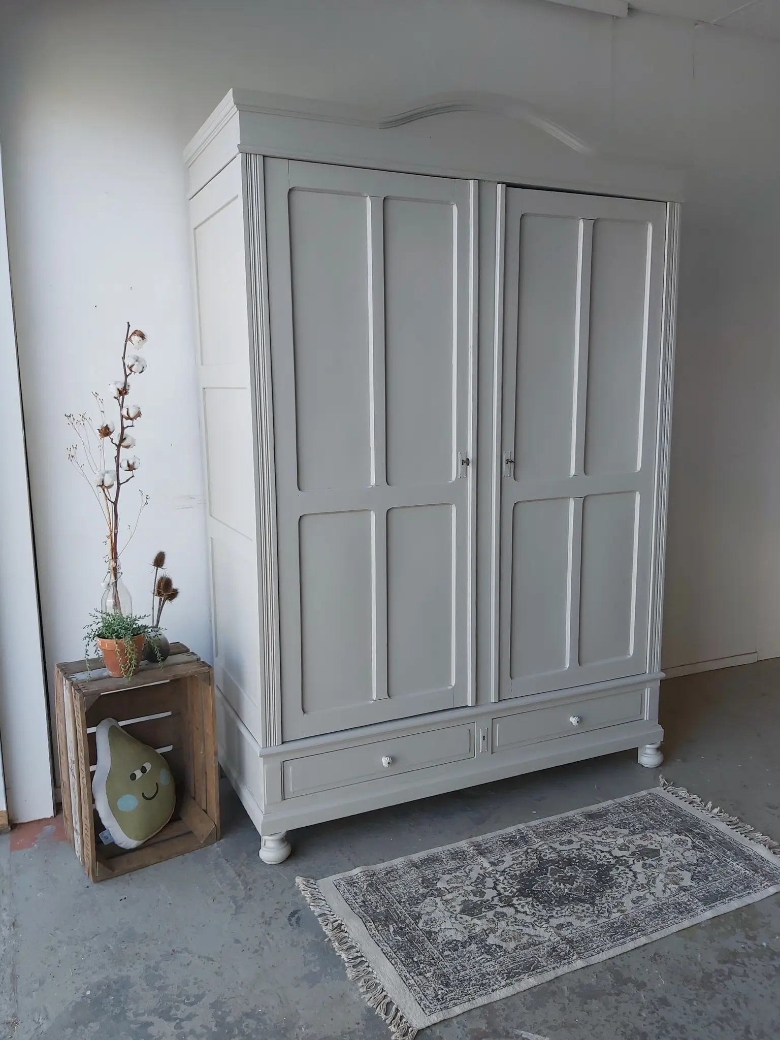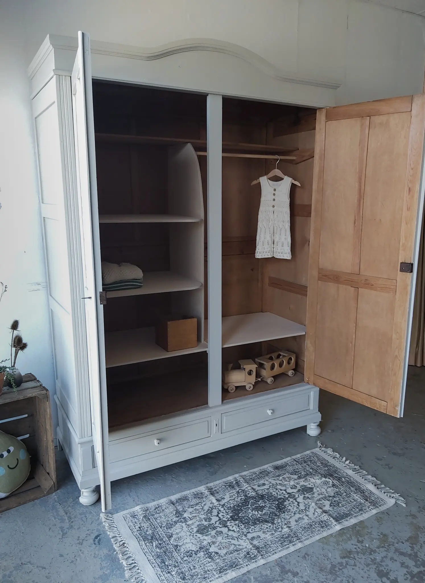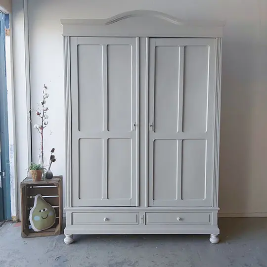 Wat een prachtige demontabele kast uit Frankrijk! De vier panelen per deur vinden wij heel mooi, helemaal in combinatie met de boog in de kroon. Toen we deze kast binnen kregen had hij een hele dikke politoerlaag, die we er niet zomaar afkrijgen. Gelukkig werken we samen met een bedrijf dat onze meubels kaalstraalt, dus kregen we hem uiteindelijk helemaal kaal in onze werkplaats. Dit soort kasten lopen we altijd volledig na, de poten, de lades, de deuren, de kroon. Alles zit weer stevig vast en de nodige reparaties zijn gedaan. De deuren hadden specifiek veel aandacht nodig, de scharnieren werkten niet meer optimaal, waardoor de deuren er behoorlijk scheef in zaten. We hebben dat opgelost en nu gaan de deuren weer perfect open en dicht. Ook hebben we de indeling aangepast. Uiteindelijk besloten we hem deze zachte taupe kleur te geven en hem af te werken met twee porseleinen knoppen op de lades. We vonden nog een extra sleutel, waardoor nu beide deuren goed sluiten met een eigen sleutel. Kortom, deze kast is helemaal klaar voor een nieuwe plek!