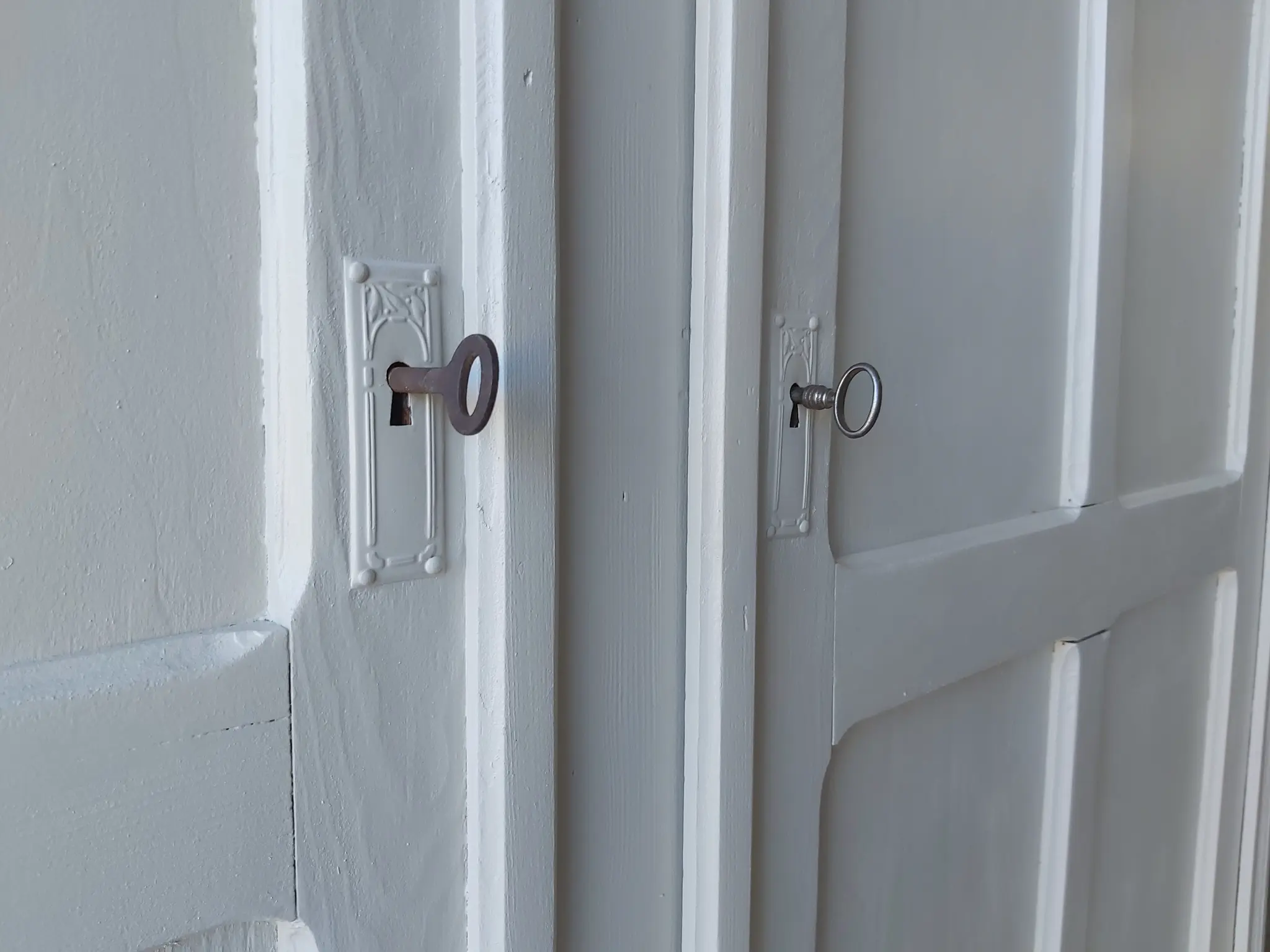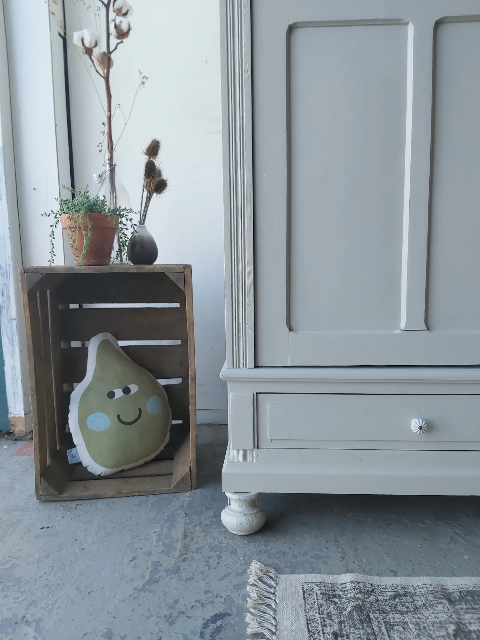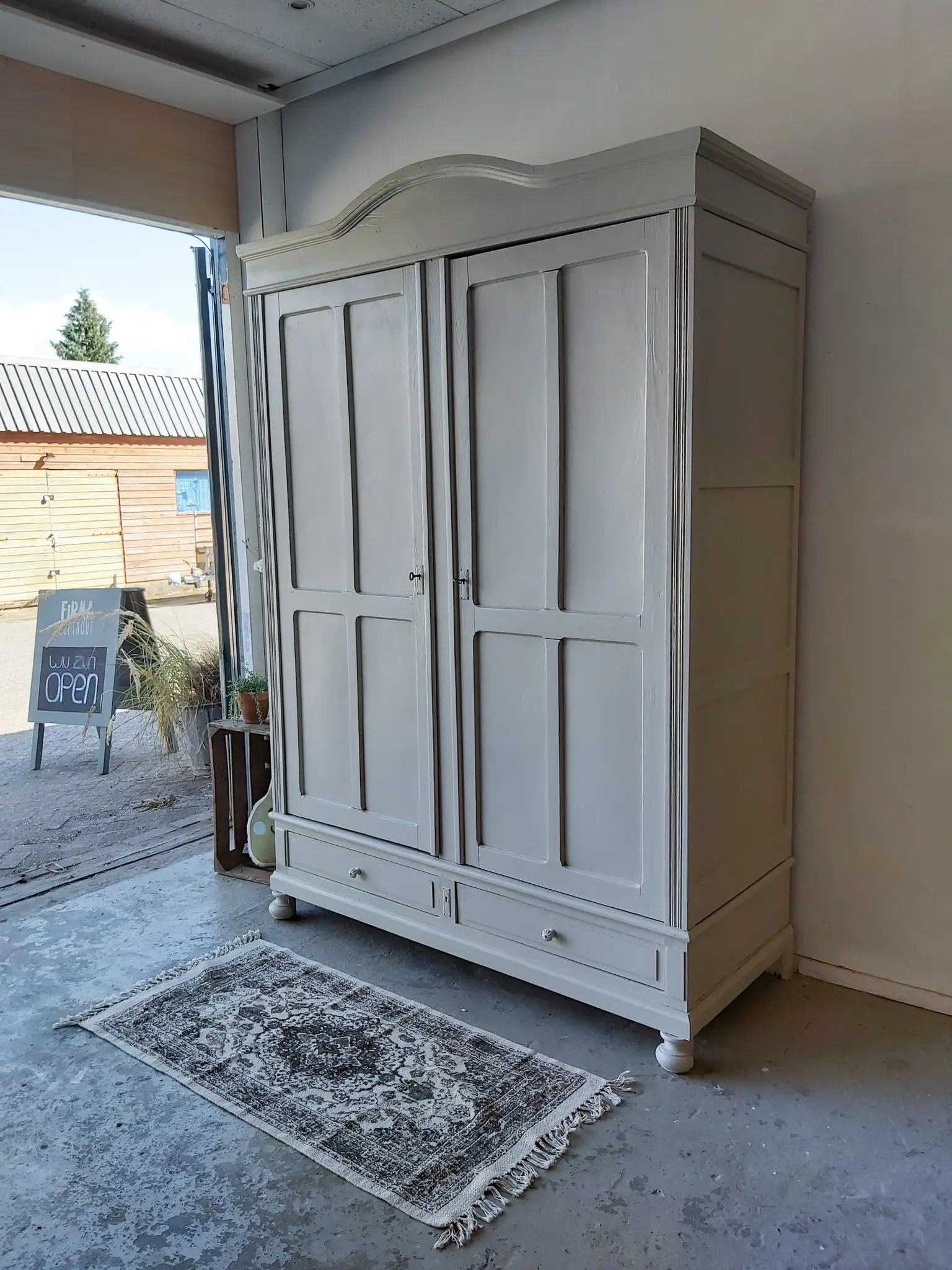 Wat een prachtige demontabele kast uit Frankrijk! De vier panelen per deur vinden wij heel mooi, helemaal in combinatie met de boog in de kroon. Toen we deze kast binnen kregen had hij een hele dikke politoerlaag, die we er niet zomaar afkrijgen. Gelukkig werken we samen met een bedrijf dat onze meubels kaalstraalt, dus kregen we hem uiteindelijk helemaal kaal in onze werkplaats. Dit soort kasten lopen we altijd volledig na, de poten, de lades, de deuren, de kroon. Alles zit weer stevig vast en de nodige reparaties zijn gedaan. De deuren hadden specifiek veel aandacht nodig, de scharnieren werkten niet meer optimaal, waardoor de deuren er behoorlijk scheef in zaten. We hebben dat opgelost en nu gaan de deuren weer perfect open en dicht. Ook hebben we de indeling aangepast. Uiteindelijk besloten we hem deze zachte taupe kleur te geven en hem af te werken met twee porseleinen knoppen op de lades. We vonden nog een extra sleutel, waardoor nu beide deuren goed sluiten met een eigen sleutel. Kortom, deze kast is helemaal klaar voor een nieuwe plek!