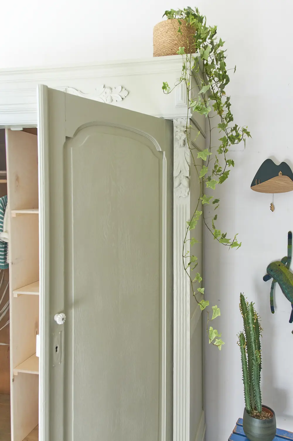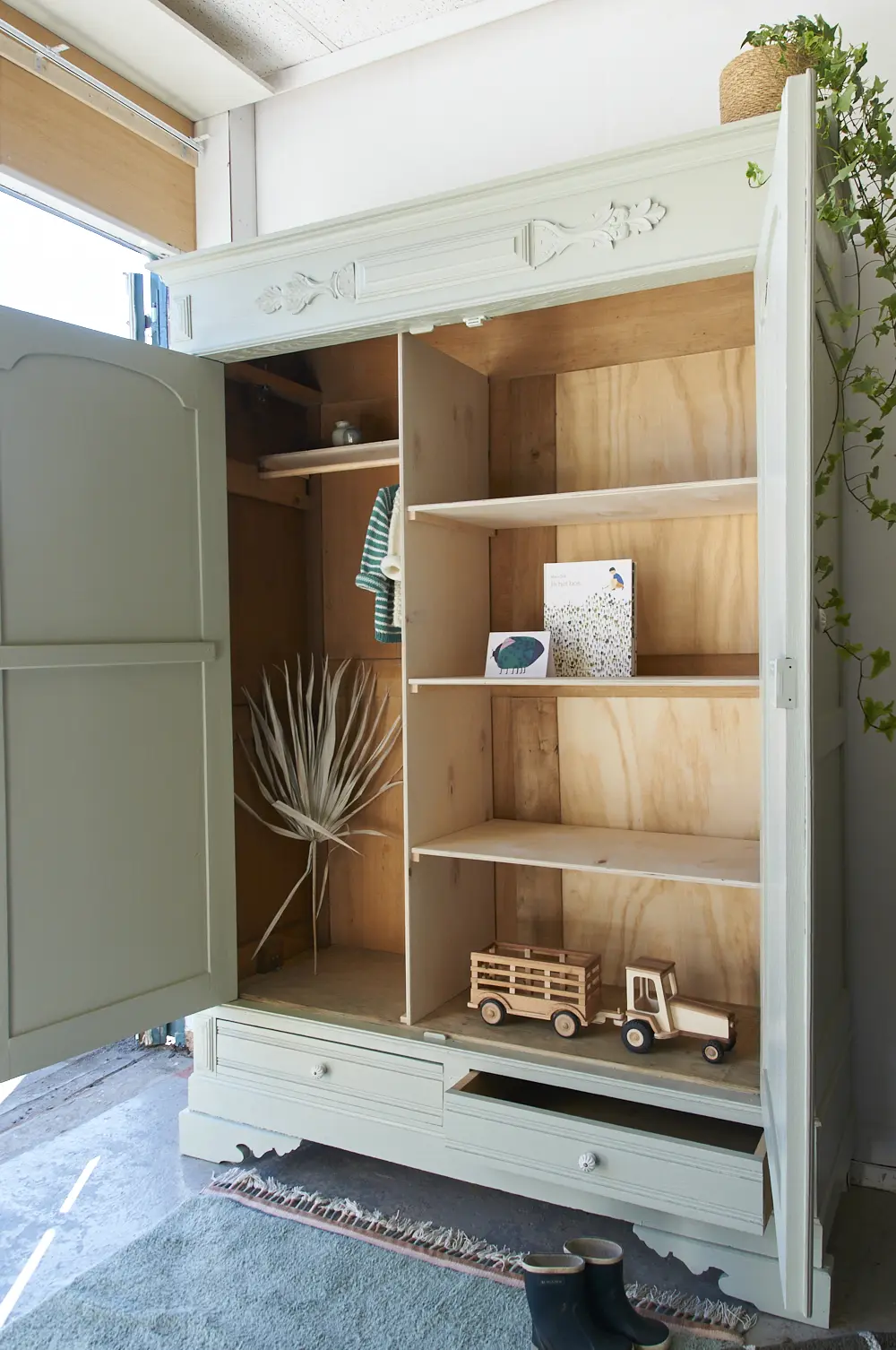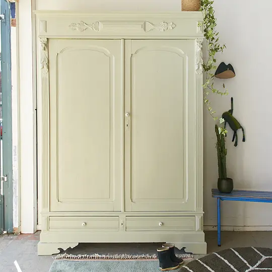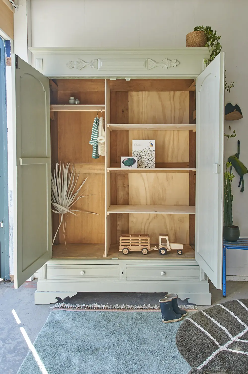 Een prachtige authentieke demontabele kledingkast. We hebben deze kast in de kleur voorjaar geschilderd, een hele subtiele zachte groen. Hoe tof zou deze kast staan in een echte junglekamer? De leeuwenkoppen links en rechts boven maken het helemaal af. De kast is van massief eikenhout gemaakt. We hebben hem grondig schoongemaakt en behandeld tegen houtworm. Toen we de kast monteerden bleken twee achter panelen niet helemaal meer lekker te passen. Beide te klein waardoor er aan de zijkant een behoorlijke kier ontstond. Deze hebben we vervangen en nu is de achterkant weer helemaal sluitend. De indeling hebben we ook nieuw gemaakt. De deuren gaan zonder te klemmen goed open en dicht. De linker deur sluit met een schuifje, de rechterdeur sluit met een magneetje. En nu is deze kast helemaal klaar voor een nieuwe plek!