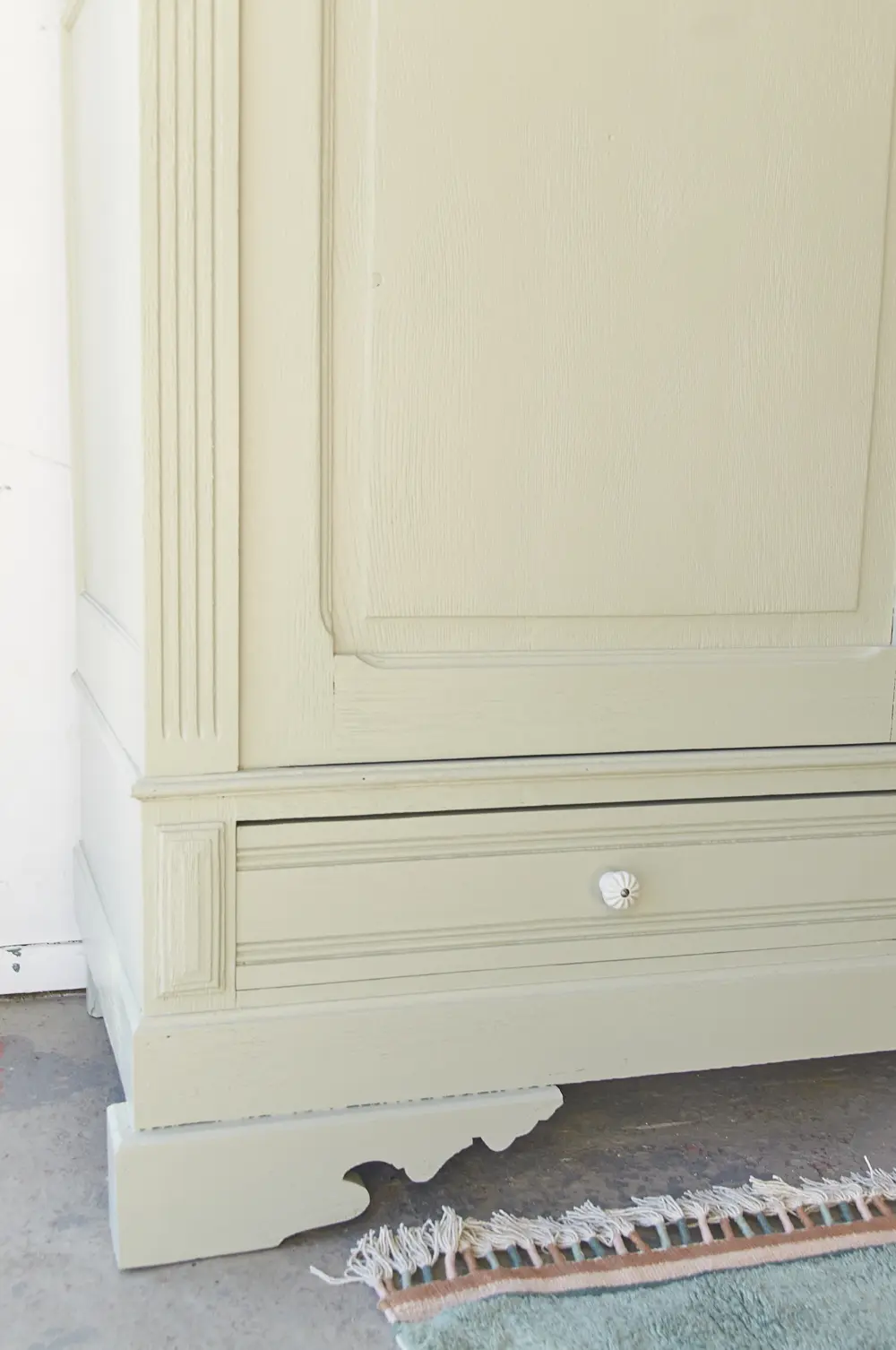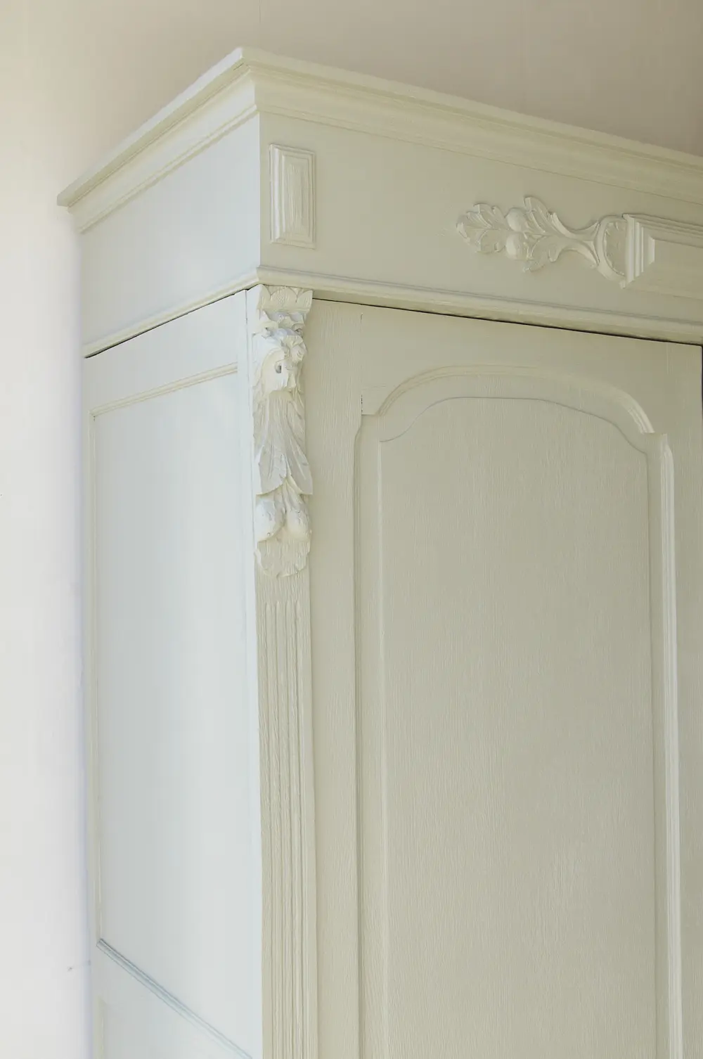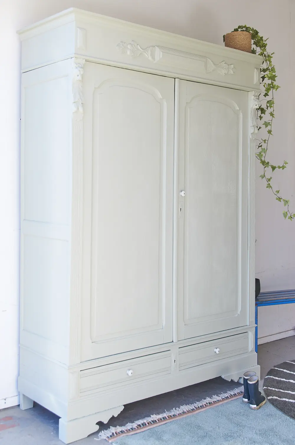 Een prachtige authentieke demontabele kledingkast. We hebben deze kast in de kleur voorjaar geschilderd, een hele subtiele zachte groen. Hoe tof zou deze kast staan in een echte junglekamer? De leeuwenkoppen links en rechts boven maken het helemaal af. De kast is van massief eikenhout gemaakt. We hebben hem grondig schoongemaakt en behandeld tegen houtworm. Toen we de kast monteerden bleken twee achter panelen niet helemaal meer lekker te passen. Beide te klein waardoor er aan de zijkant een behoorlijke kier ontstond. Deze hebben we vervangen en nu is de achterkant weer helemaal sluitend. De indeling hebben we ook nieuw gemaakt. De deuren gaan zonder te klemmen goed open en dicht. De linker deur sluit met een schuifje, de rechterdeur sluit met een magneetje. En nu is deze kast helemaal klaar voor een nieuwe plek!