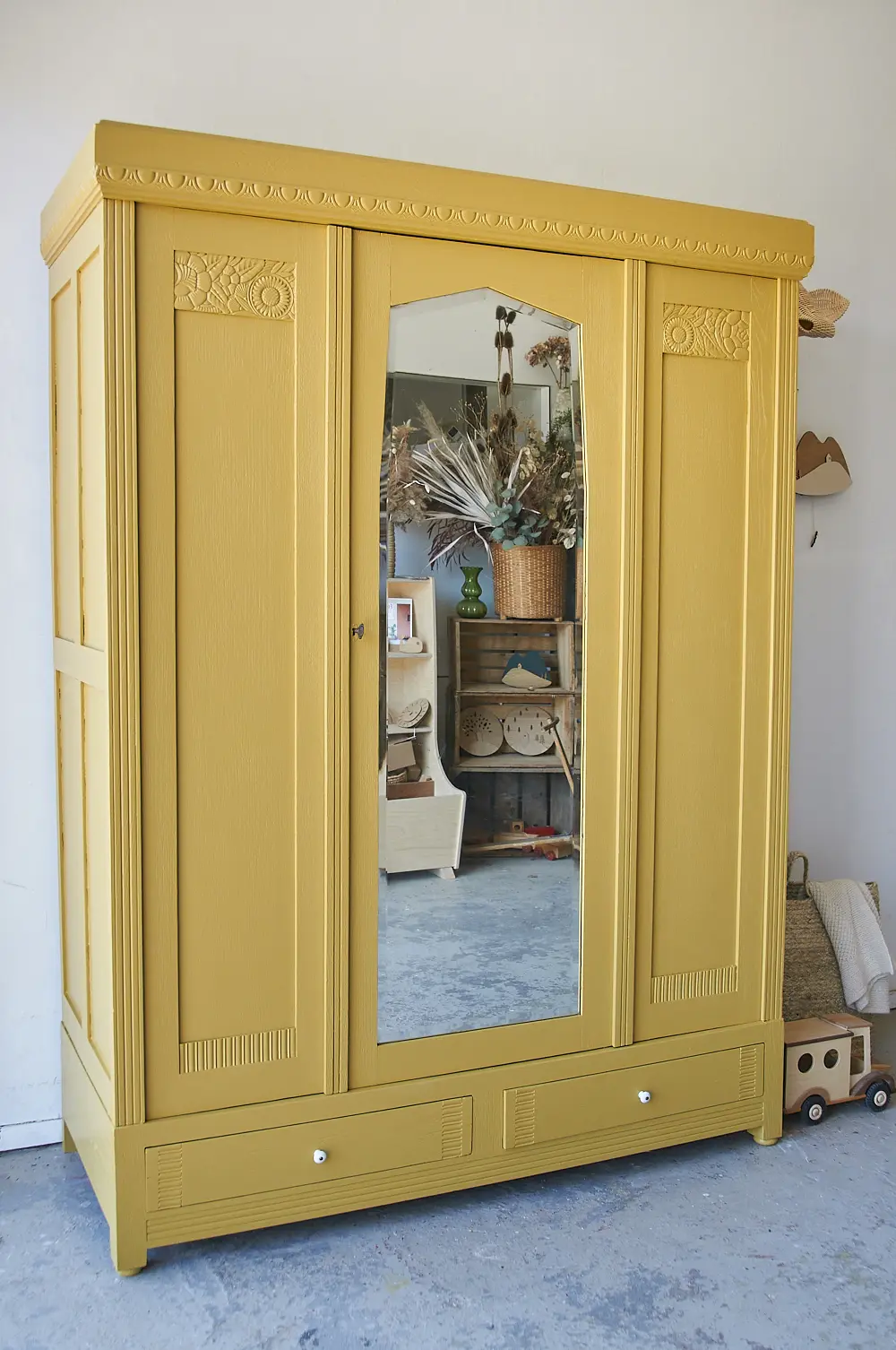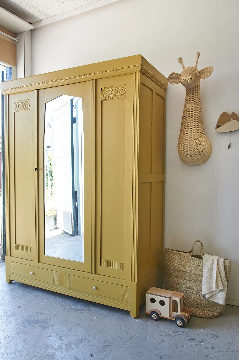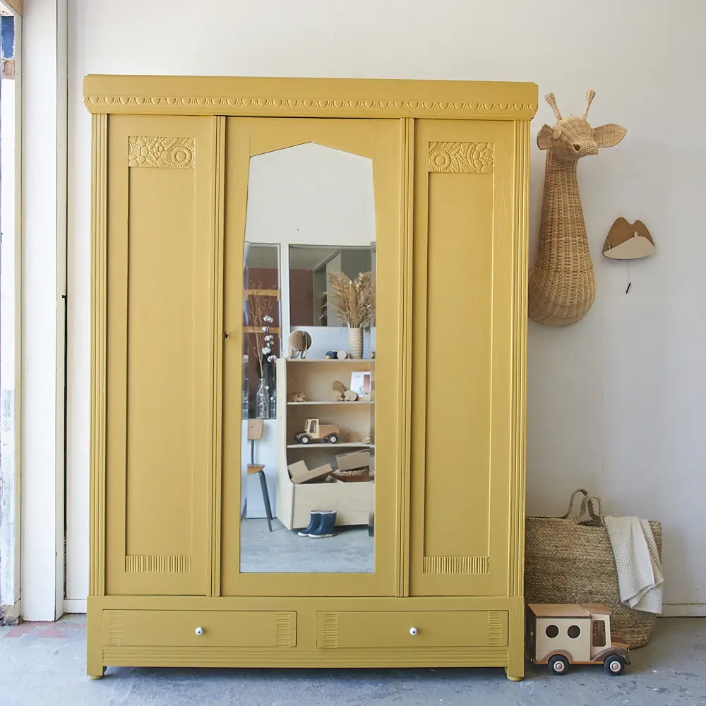 Wat een prachtige kast is dit! We werden helemaal blij van het bloemen houtsnijwerk. Vanwege de zonnebloemen moesten we deze kast natuurlijk in onze prachtige okergele saffraan schilderen. De kast heeft één deur, de spiegeldeur. Aan weerszijden van de spiegeldeur zitten dus geen deurtjes maar vaste panelen. Daarom hebben we ook voor deze indeling gekozen, zo heb je alsnog genoeg hang- en legruimte, en kan je overal goed bij. We hebben de kast grondig schoongemaakt en behandeld tegen houtworm. Vervolgens hebben we deze indeling gemaakt. Hij kreeg een laag grondverf en is twee keer afgelakt in saffraan. De spiegel is teruggeplaatst en de lades zijn voorzien van porseleinen knopjes. De deur sluit perfect met de sleutel. Kortom, deze fantastische kast is weer helemaal klaar voor een nieuwe plek! Voor fijne kinderkamer decoratie, klik HIER.