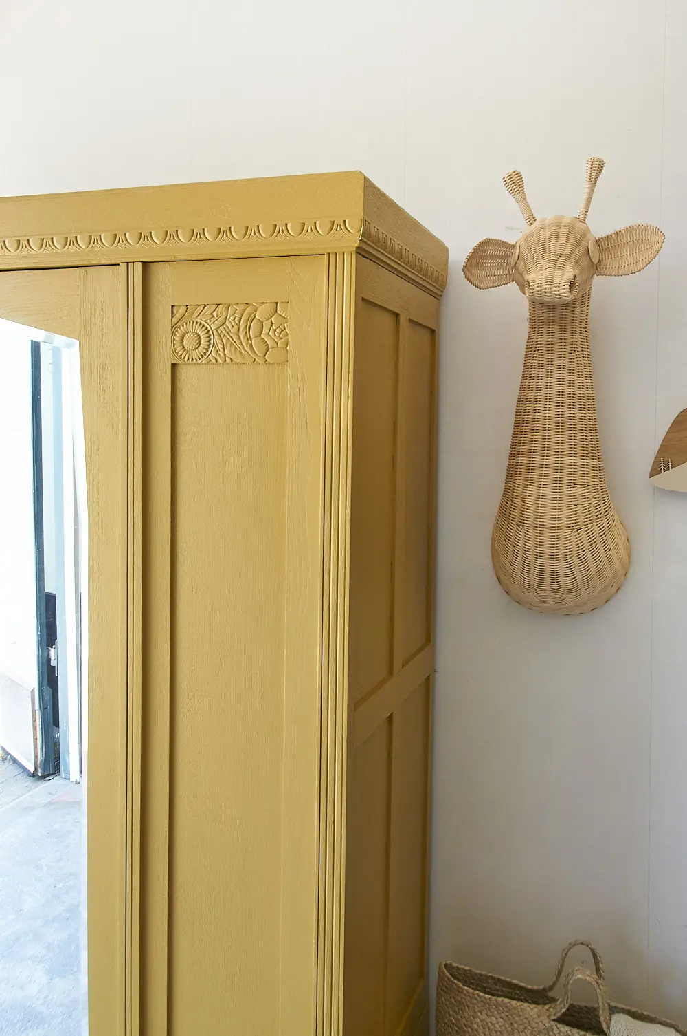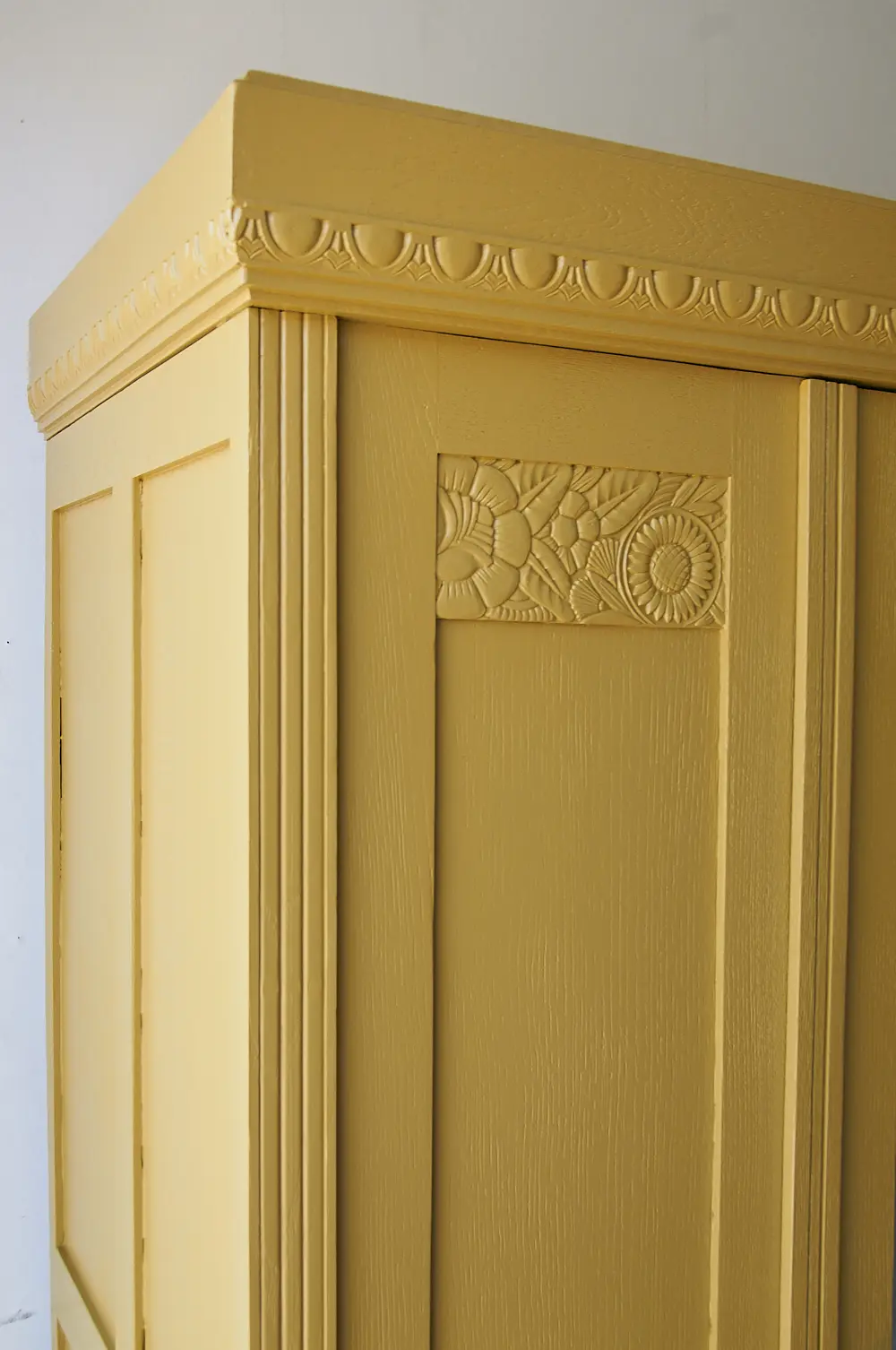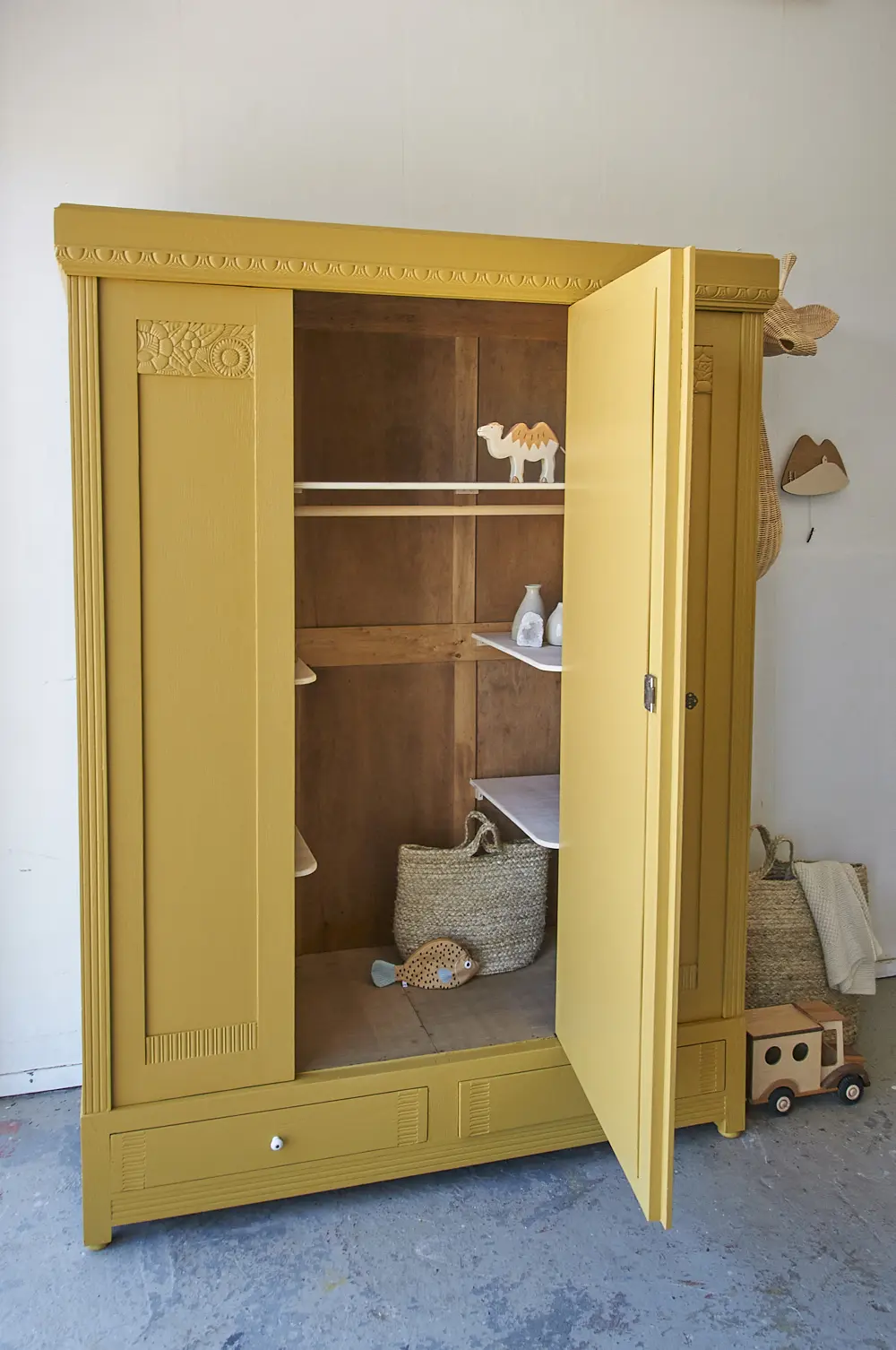 Wat een prachtige kast is dit! We werden helemaal blij van het bloemen houtsnijwerk. Vanwege de zonnebloemen moesten we deze kast natuurlijk in onze prachtige okergele saffraan schilderen. De kast heeft één deur, de spiegeldeur. Aan weerszijden van de spiegeldeur zitten dus geen deurtjes maar vaste panelen. Daarom hebben we ook voor deze indeling gekozen, zo heb je alsnog genoeg hang- en legruimte, en kan je overal goed bij. We hebben de kast grondig schoongemaakt en behandeld tegen houtworm. Vervolgens hebben we deze indeling gemaakt. Hij kreeg een laag grondverf en is twee keer afgelakt in saffraan. De spiegel is teruggeplaatst en de lades zijn voorzien van porseleinen knopjes. De deur sluit perfect met de sleutel. Kortom, deze fantastische kast is weer helemaal klaar voor een nieuwe plek! Voor fijne kinderkamer decoratie, klik HIER.