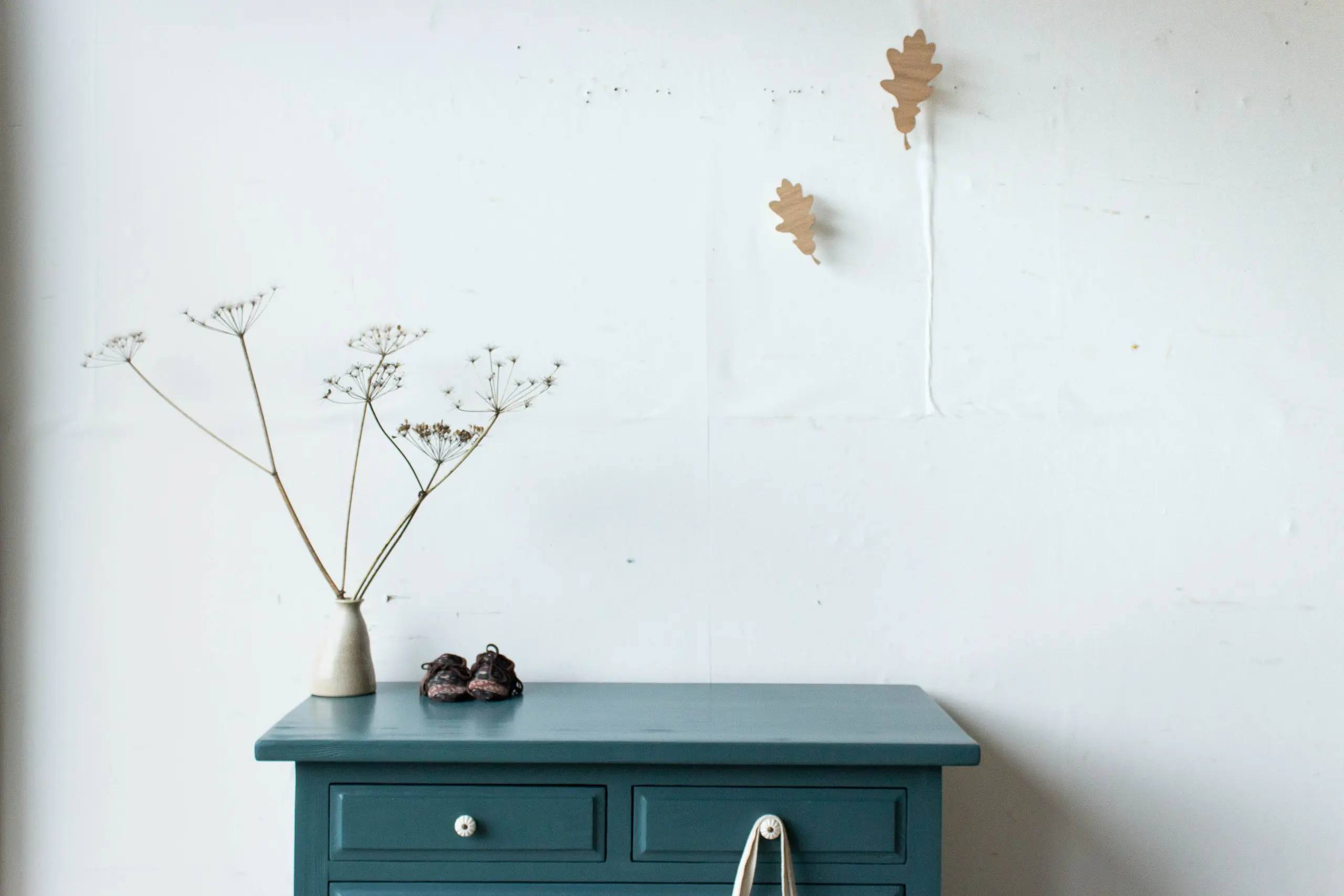 Het vaasje en rieten mandje komen van Meutt. De lieve babyslofjes zijn te koop bij MOX Babyshoes. En de leuke herfstige wandhaken zijn van Ted & Tone en binnenkort bij ons verkrijgbaar.