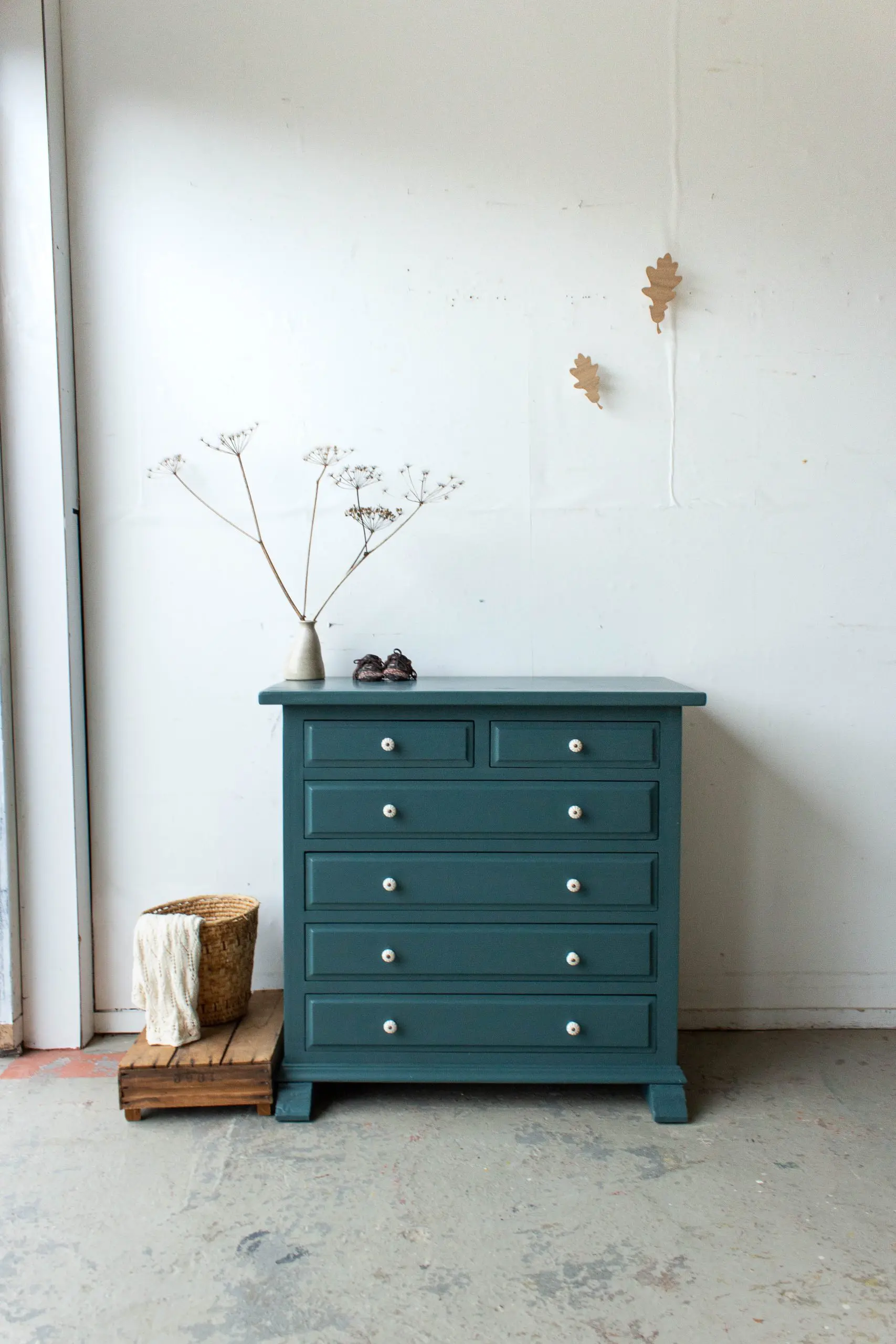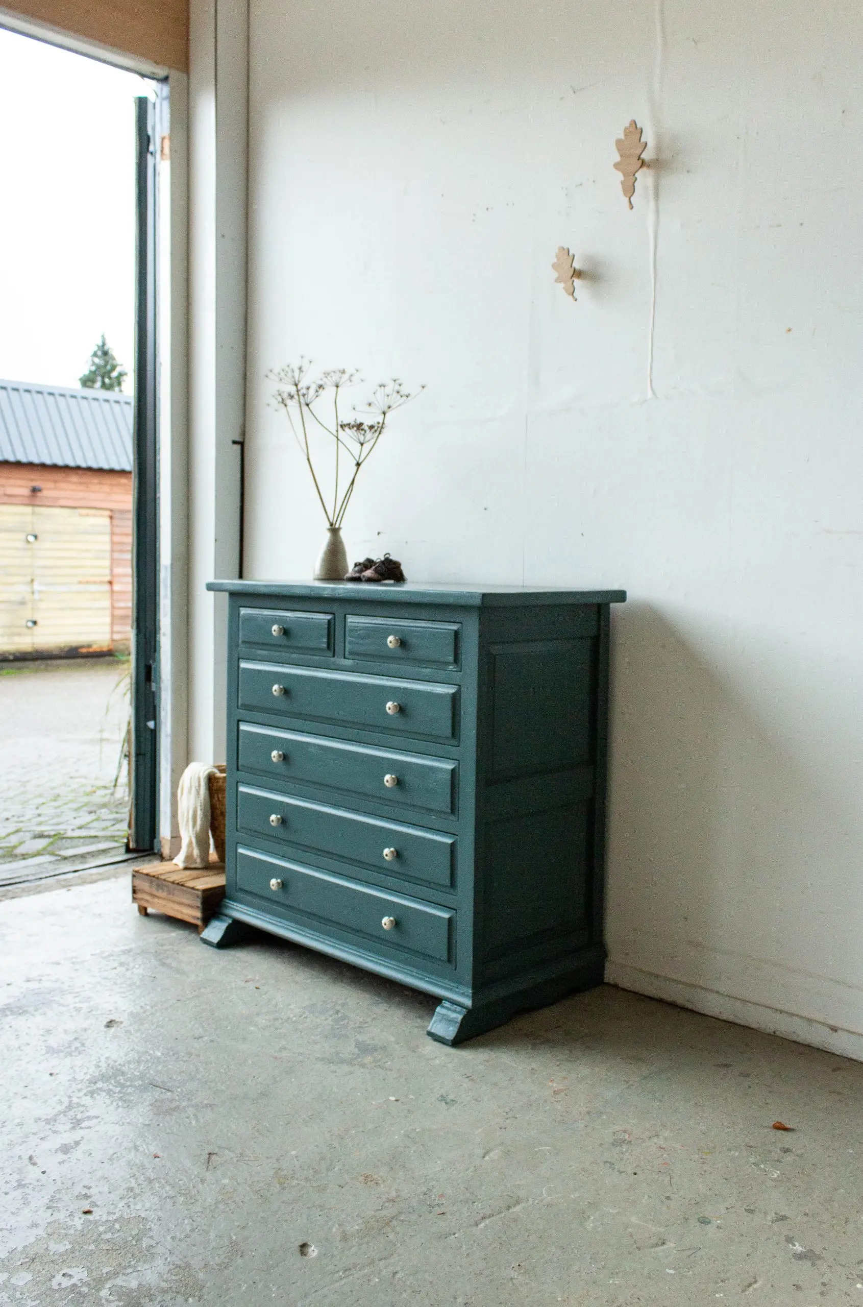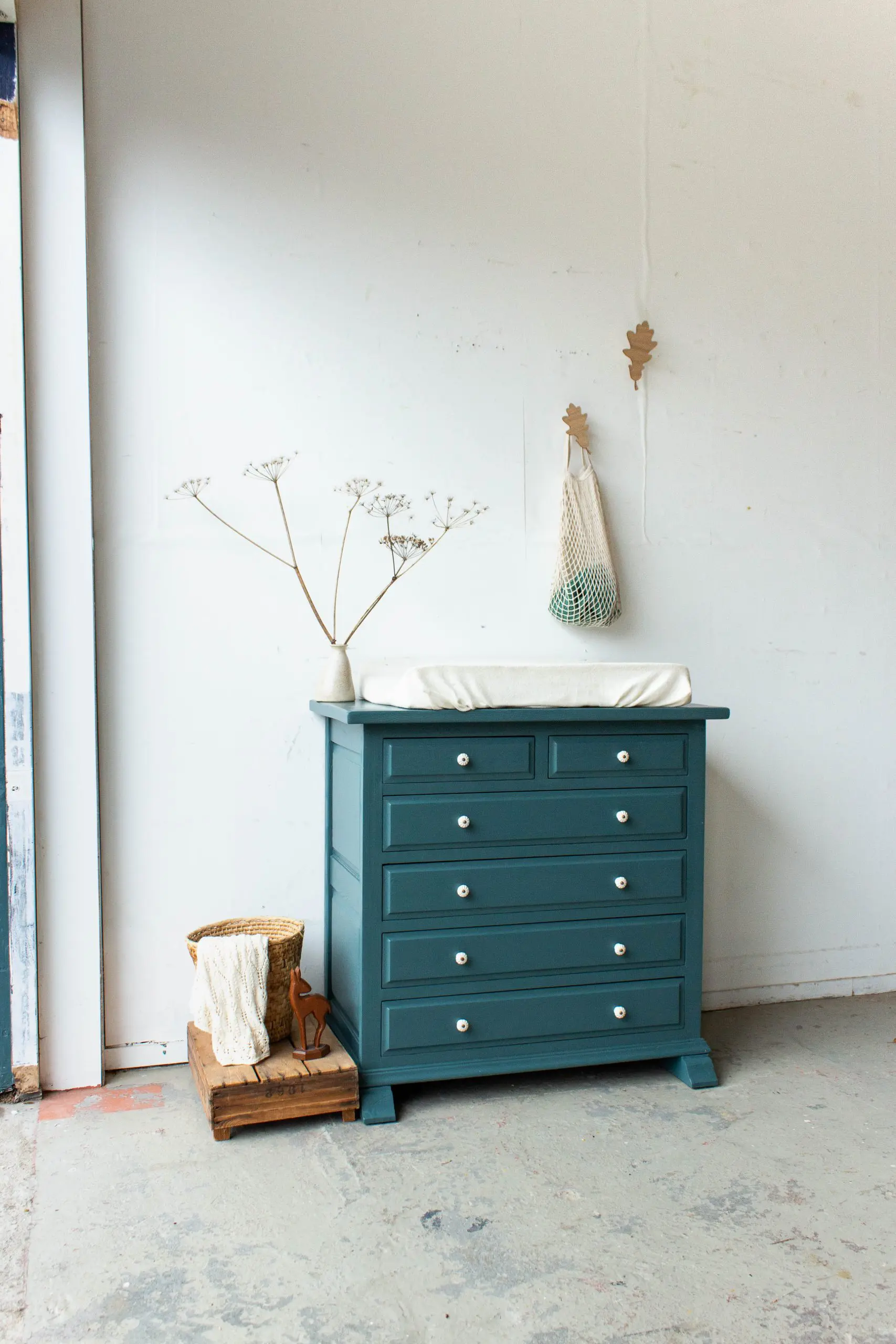 Deze leuke ladencommode komt uit België. Het vintage kastje is lekker compact, ideaal voor een kleine babykamer dus! Wij hebben hem eerst goed schoongemaakt en helemaal nagelopen. De laden gaan nu weer heel soepel open en dicht, en hij staat weer lekker stevig op zijn pootjes. Deze donker zeegroene kleur leek ons erg mooi voor het kastje. En inderdaad! De witte porseleinen knoppen, maken het kastje helemaal af. En nu is ie weer helemaal klaar voor gebruik!