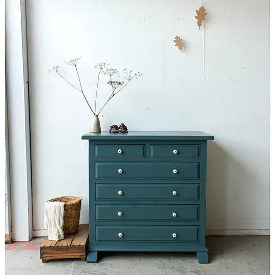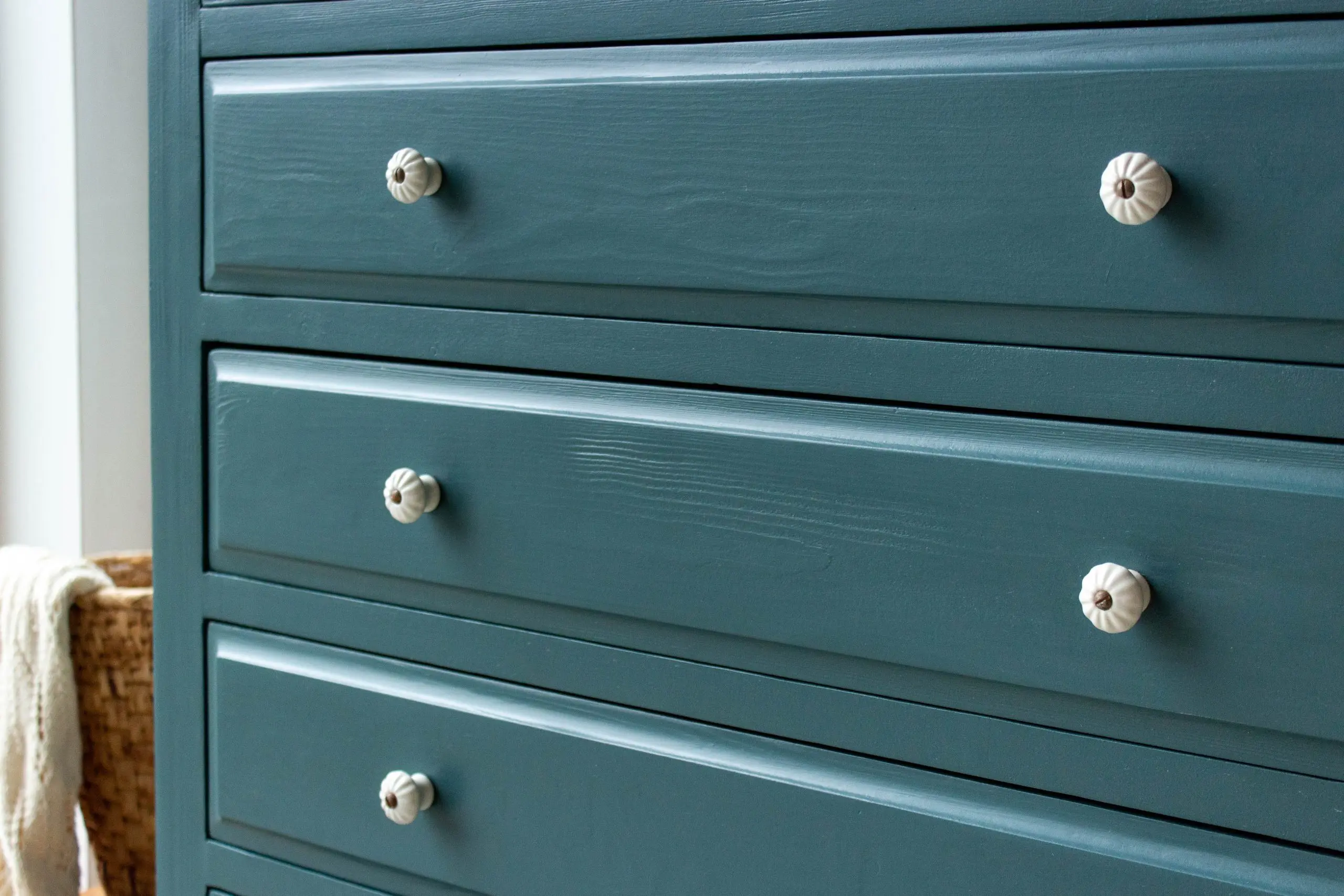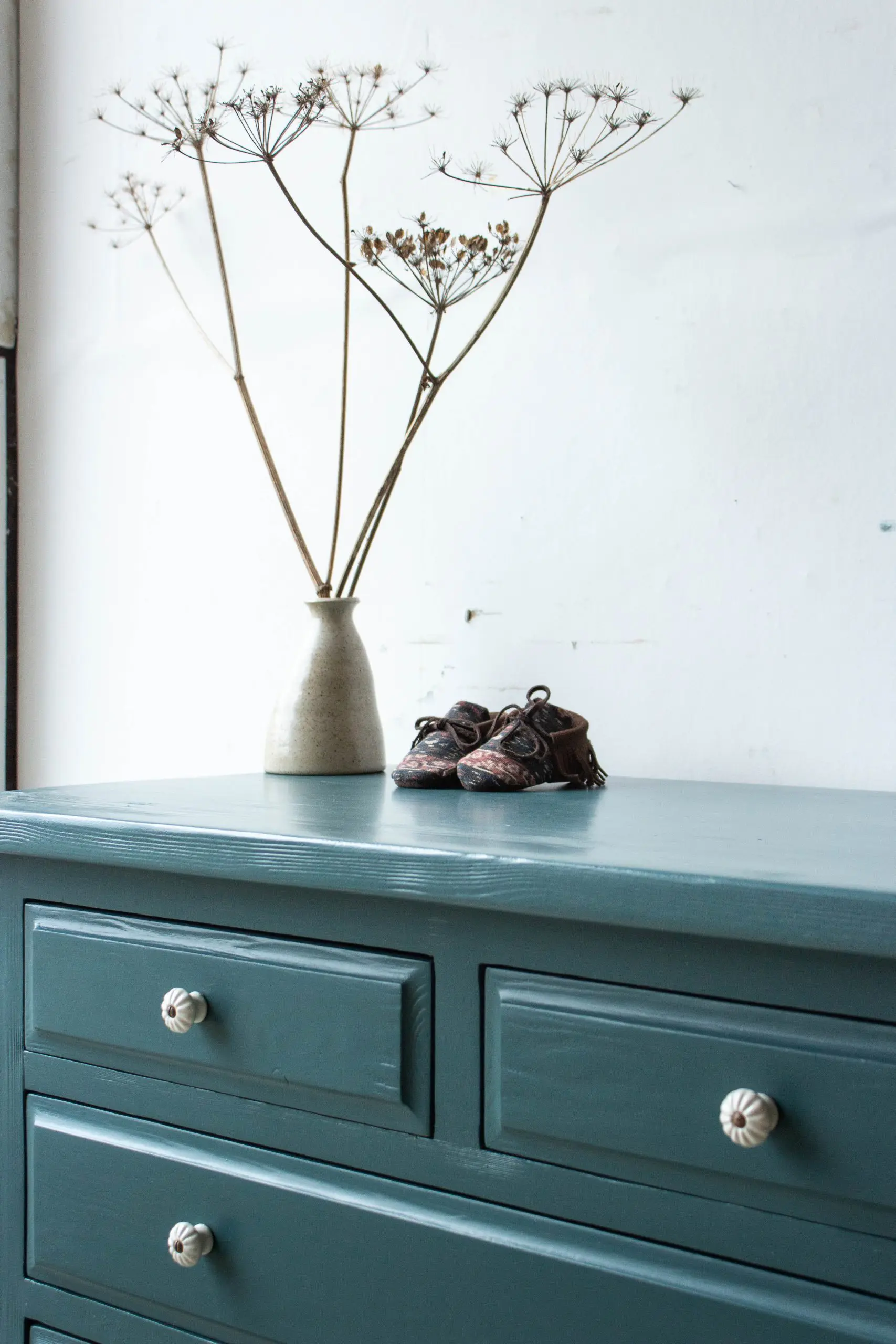 Deze leuke ladencommode komt uit België. Het vintage kastje is lekker compact, ideaal voor een kleine babykamer dus! Wij hebben hem eerst goed schoongemaakt en helemaal nagelopen. De laden gaan nu weer heel soepel open en dicht, en hij staat weer lekker stevig op zijn pootjes. Deze donker zeegroene kleur leek ons erg mooi voor het kastje. En inderdaad! De witte porseleinen knoppen, maken het kastje helemaal af. En nu is ie weer helemaal klaar voor gebruik!