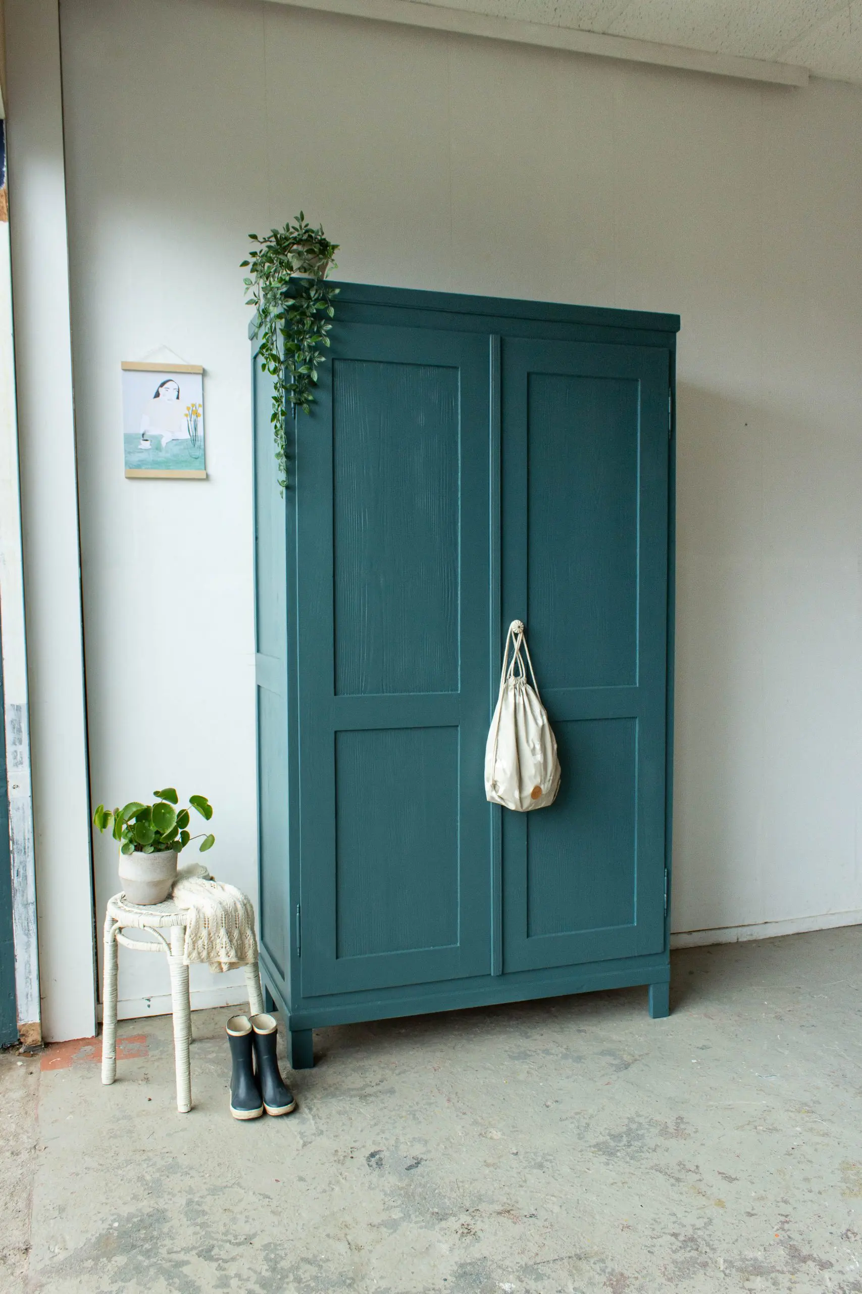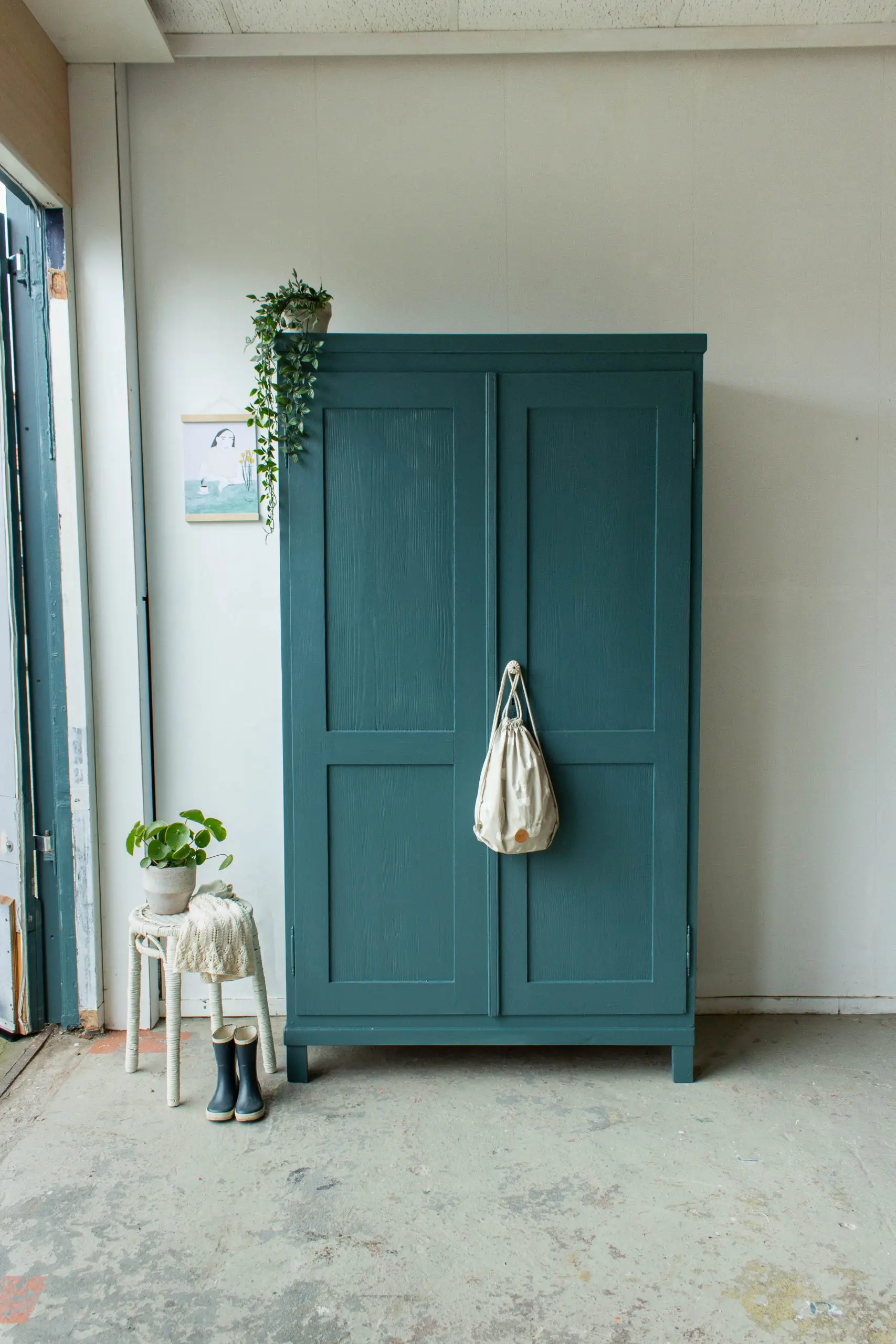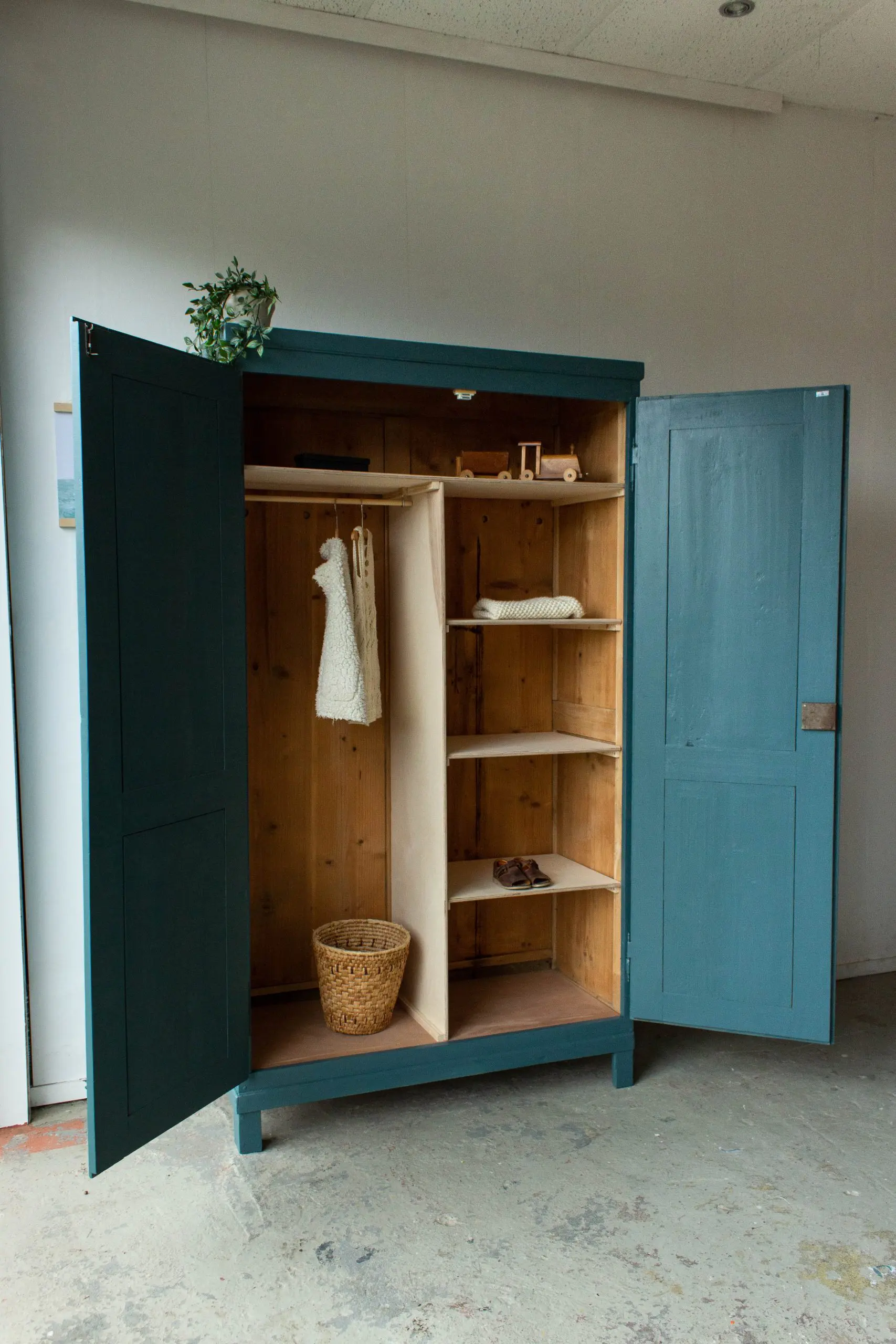 Een mooie, oude kledingkast uit Frankrijk. Deze vintage kast had wel een aantal reparaties nodig. Maar hij was het absoluut waard, want wat is het een toffe kast geworden! We hebben alles goed nagelopen, verstevigd en gerepareerd en nu kan hij weer jaren mee. De kast is grondig schoongemaakt en voorzien van een nieuwe indeling. Nu biedt hij volop ruimte aan zowel hang- als legkleding. Daarna is hij in deze stevige zeegroene kleur geschilderd. Op de rechter deur is tot slot een mooi knopje van porselein gezet. De deuren sluiten door middel van een schuifje en een magneetje. Wat ons betreft een geweldige kast voor op de baby- of kinderkamer. Klaar voor gebruik.