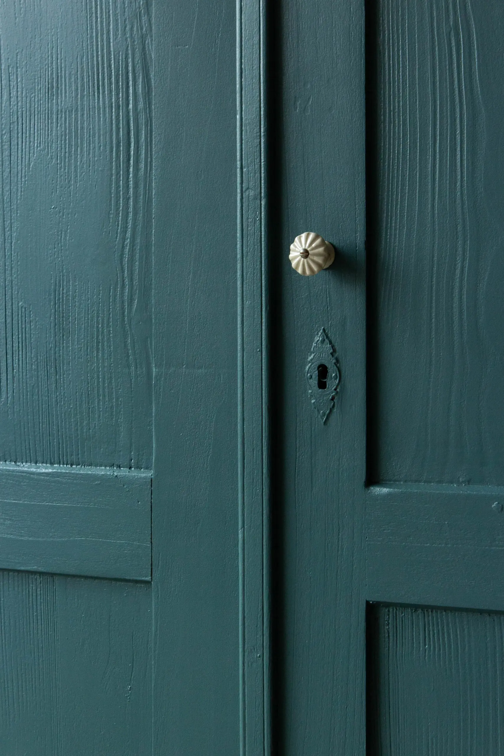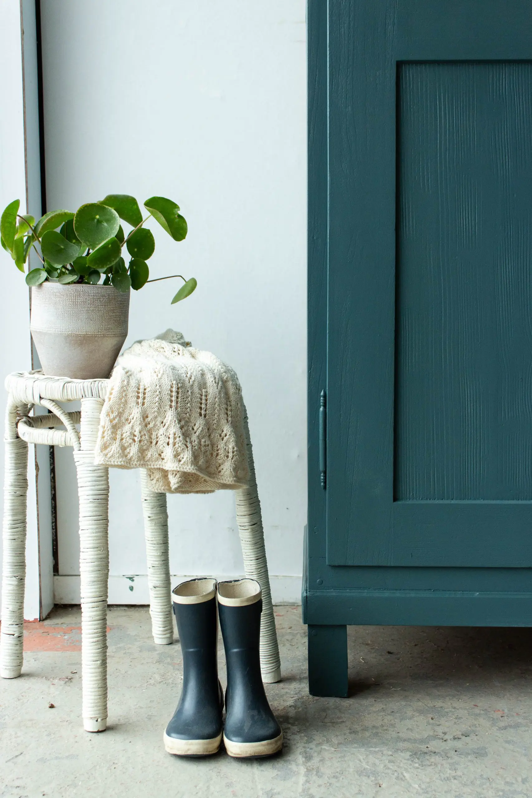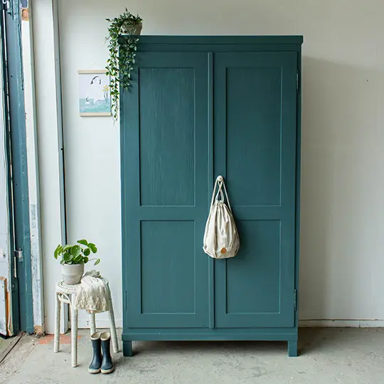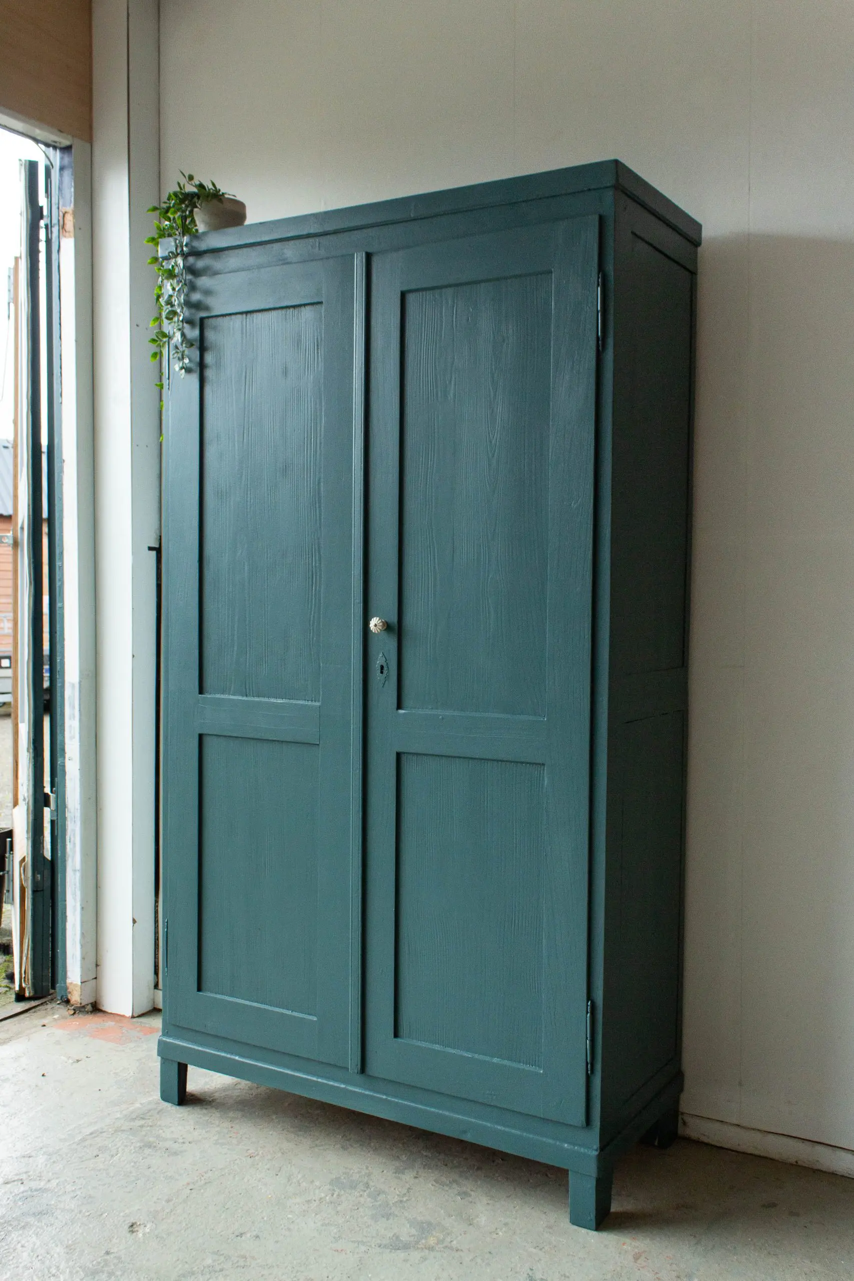 Een mooie, oude kledingkast uit Frankrijk. Deze vintage kast had wel een aantal reparaties nodig. Maar hij was het absoluut waard, want wat is het een toffe kast geworden! We hebben alles goed nagelopen, verstevigd en gerepareerd en nu kan hij weer jaren mee. De kast is grondig schoongemaakt en voorzien van een nieuwe indeling. Nu biedt hij volop ruimte aan zowel hang- als legkleding. Daarna is hij in deze stevige zeegroene kleur geschilderd. Op de rechter deur is tot slot een mooi knopje van porselein gezet. De deuren sluiten door middel van een schuifje en een magneetje. Wat ons betreft een geweldige kast voor op de baby- of kinderkamer. Klaar voor gebruik.