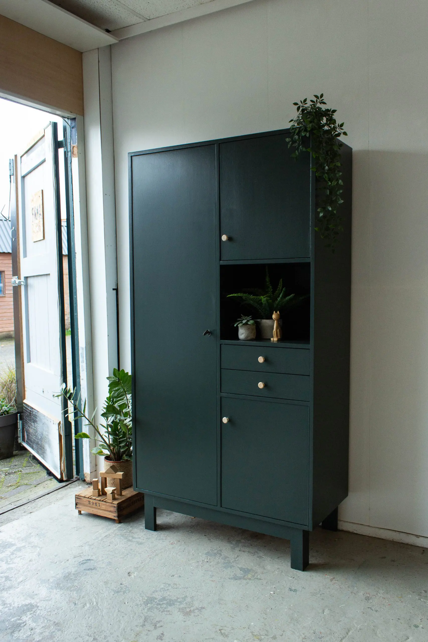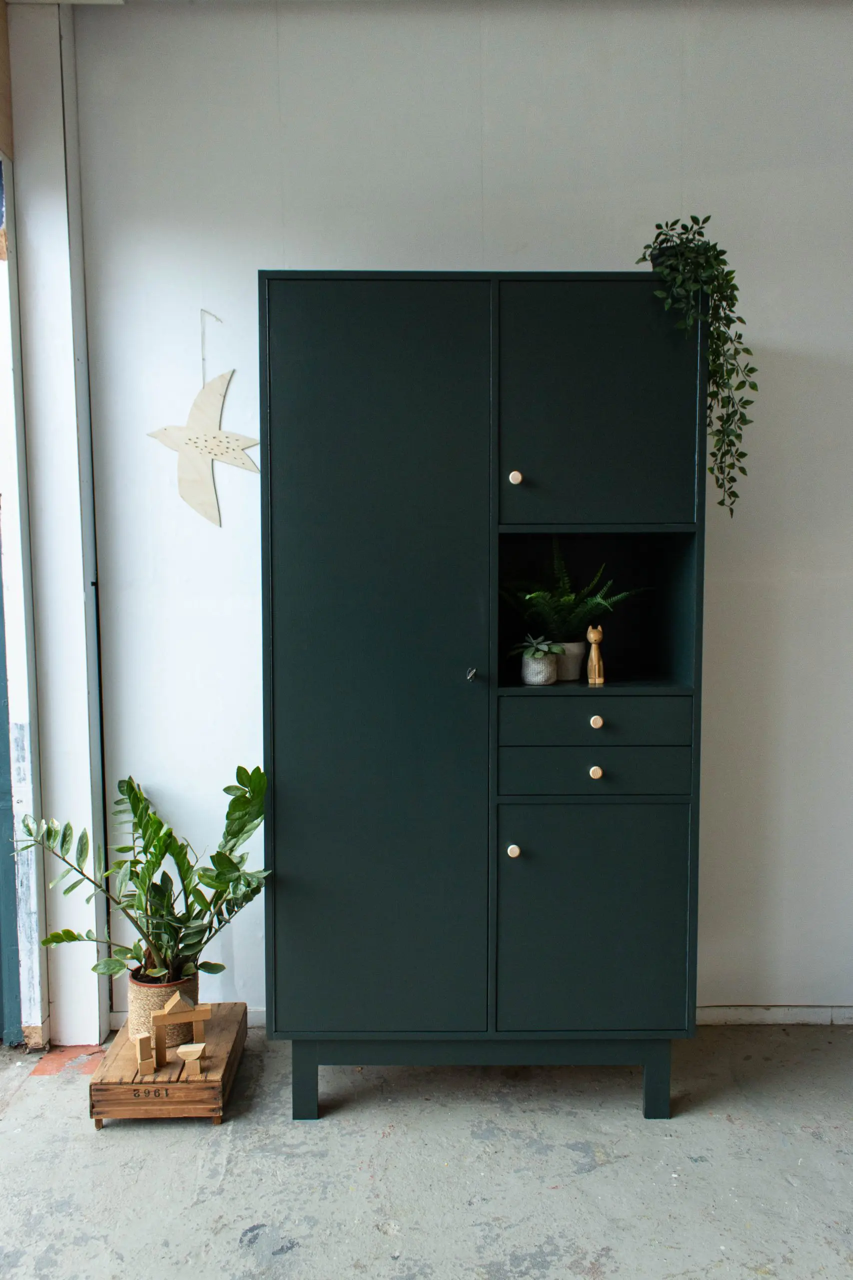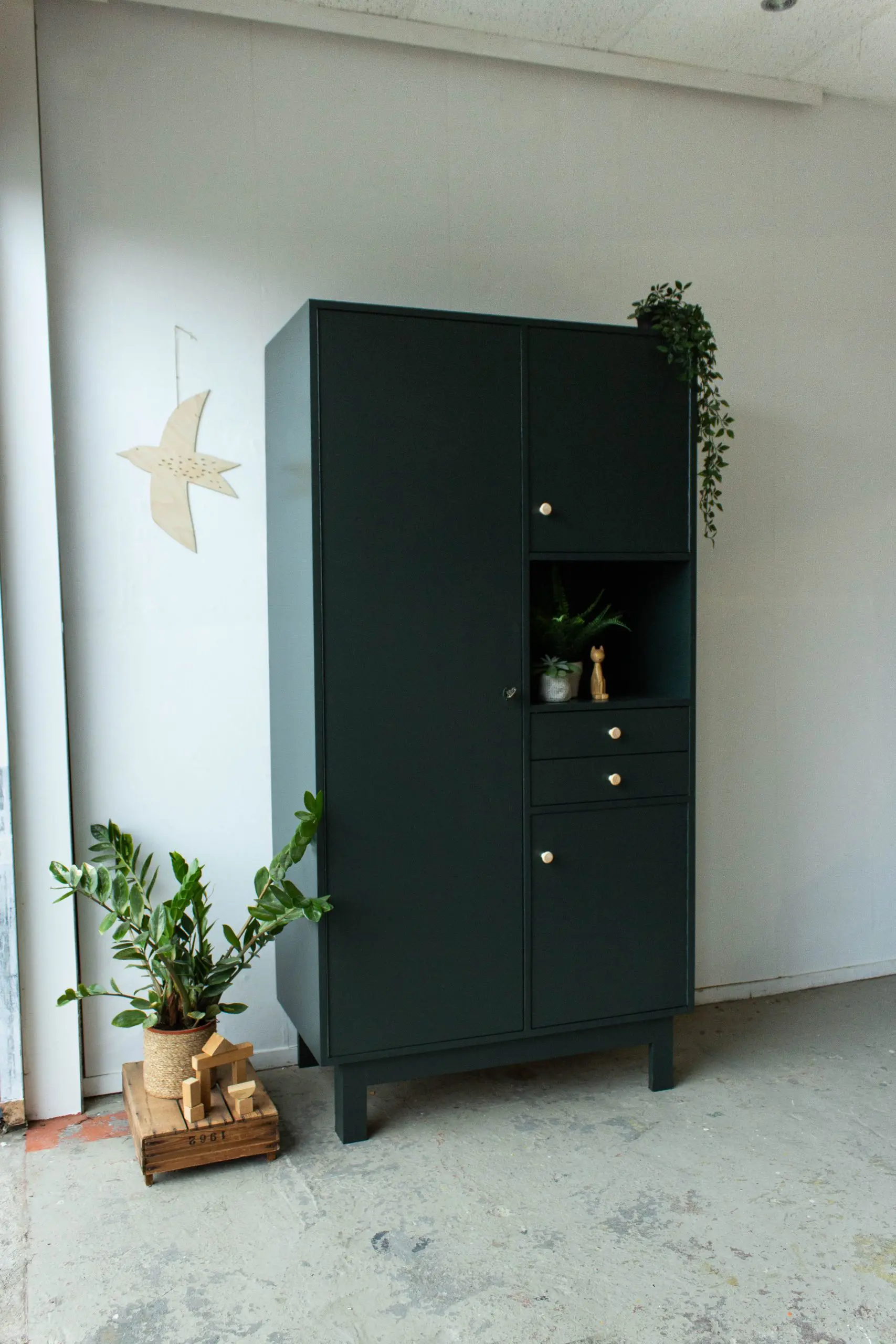 Een prachtige, sobere kledingkast uit een Belgisch voormalig klooster. We hebben deze te gekke vintage kast helemaal nagelopen, verstevigd en grondig schoongemaakt. Daarna is hij in deze donkere ‘woud’ groene kleur geschilderd. Op de deurtjes en laatjes zijn tot slot strakke essenhouten knoppen gezet. De grote deur links opent en sluit door middel van de originele sleutel. En nu is ie klaar om een leuk plekje op een leuke kinderkamer te krijgen! Ontzettend ruim en ontzettend mooi!