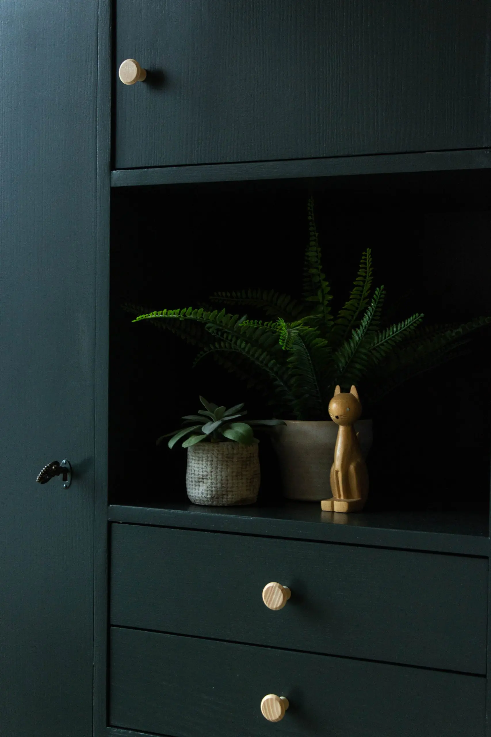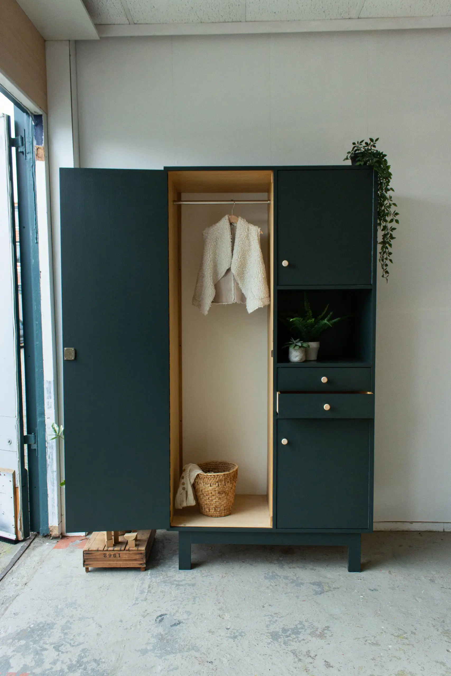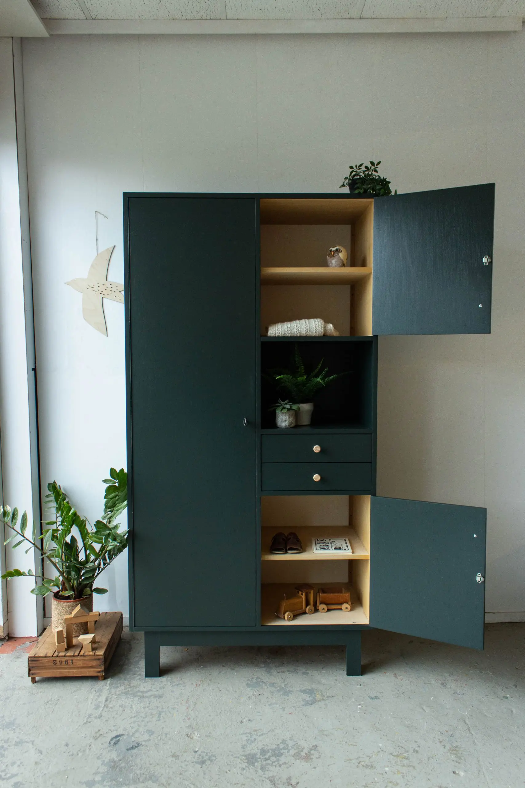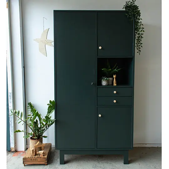 Een prachtige, sobere kledingkast uit een Belgisch voormalig klooster. We hebben deze te gekke vintage kast helemaal nagelopen, verstevigd en grondig schoongemaakt. Daarna is hij in deze donkere ‘woud’ groene kleur geschilderd. Op de deurtjes en laatjes zijn tot slot strakke essenhouten knoppen gezet. De grote deur links opent en sluit door middel van de originele sleutel. En nu is ie klaar om een leuk plekje op een leuke kinderkamer te krijgen! Ontzettend ruim en ontzettend mooi!