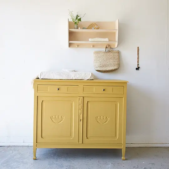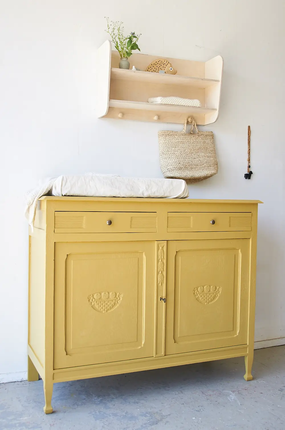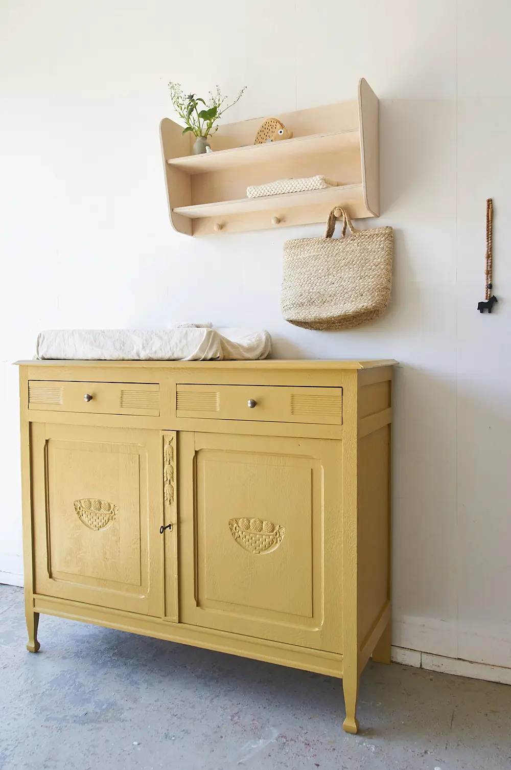 Wat een knapperd! Echt prachtig dit soort kasten, we toveren ze graag om tot commode! Het mooie eikenhout en het leuke houtsnijwerk is zo leuk. Om hem tot de juiste maten van een commode te krijgen hebben we het blad met een kleine twee centimeter aan de achterkant verlengd. Zo past er goed een verschoningskussen op. De commode is grondig schoongemaakt en heeft een behandeling tegen houtworm gehad. We hebben hem geschilderd in onze mooie saffraan en hem afgewerkt met bronzen knoppen. In de rechter lade is een dambord geschilderd, zo leuk om deze commode later te gebruiken voor spelletjesdozen. De linker deur sluit met een schuifje en de rechterdeur met de sleutel. Hij is weer helemaal klaar voor een nieuwe plek! Voor ons mooie wandplankje, klik HIER.