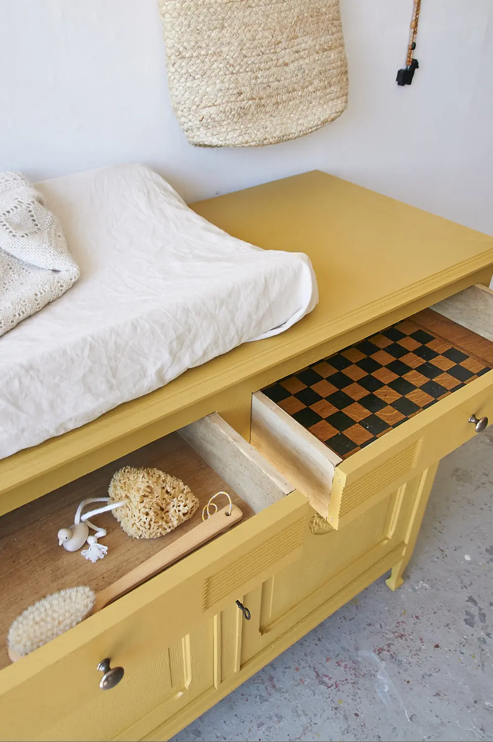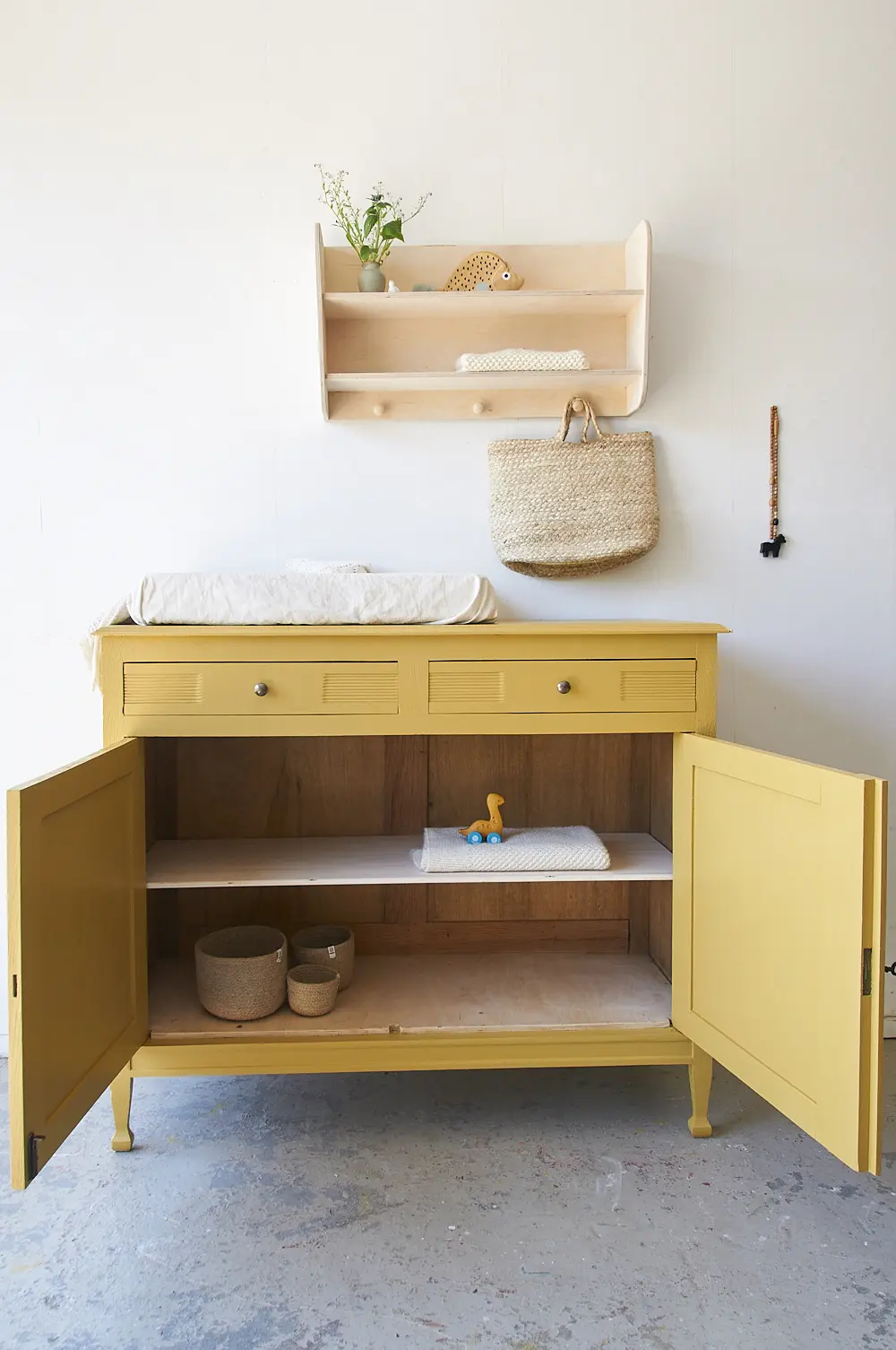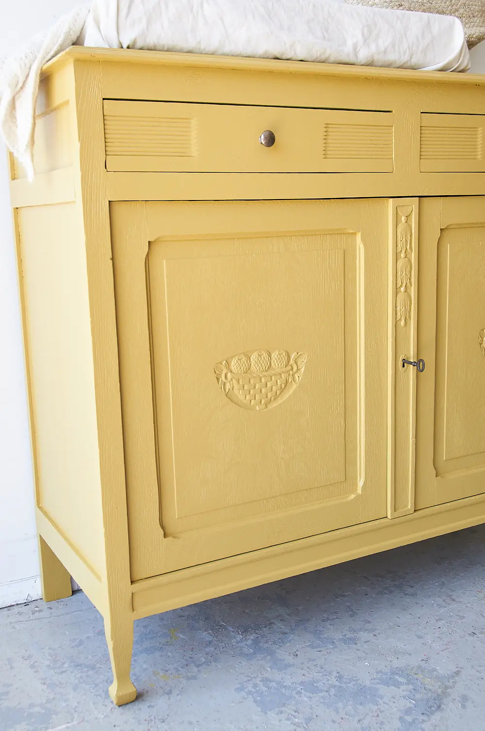 Wat een knapperd! Echt prachtig dit soort kasten, we toveren ze graag om tot commode! Het mooie eikenhout en het leuke houtsnijwerk is zo leuk. Om hem tot de juiste maten van een commode te krijgen hebben we het blad met een kleine twee centimeter aan de achterkant verlengd. Zo past er goed een verschoningskussen op. De commode is grondig schoongemaakt en heeft een behandeling tegen houtworm gehad. We hebben hem geschilderd in onze mooie saffraan en hem afgewerkt met bronzen knoppen. In de rechter lade is een dambord geschilderd, zo leuk om deze commode later te gebruiken voor spelletjesdozen. De linker deur sluit met een schuifje en de rechterdeur met de sleutel. Hij is weer helemaal klaar voor een nieuwe plek! Voor ons mooie wandplankje, klik HIER.