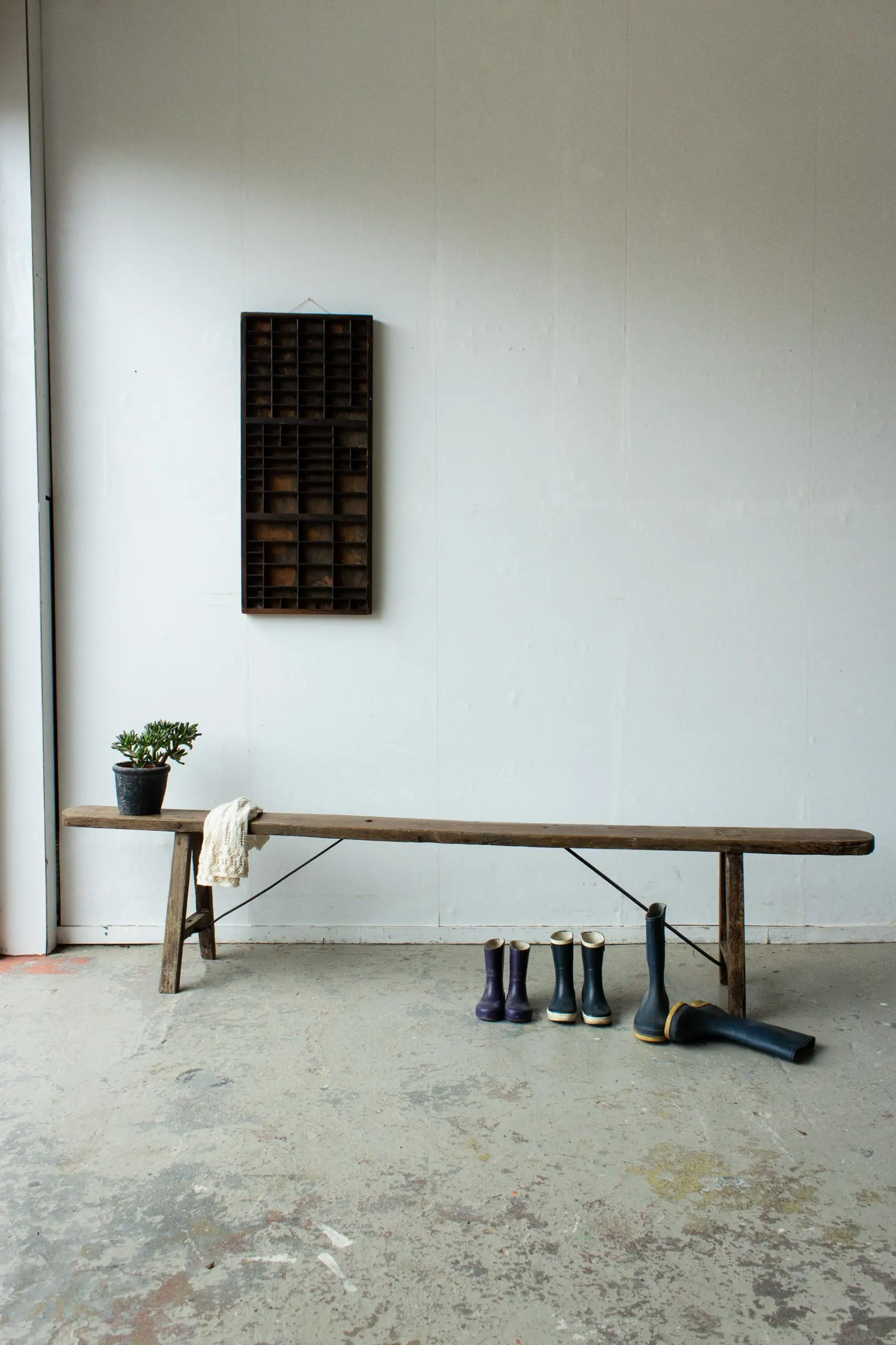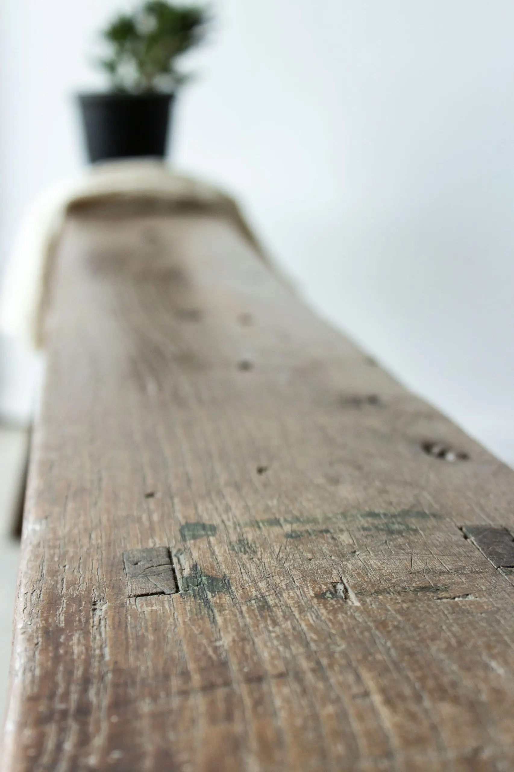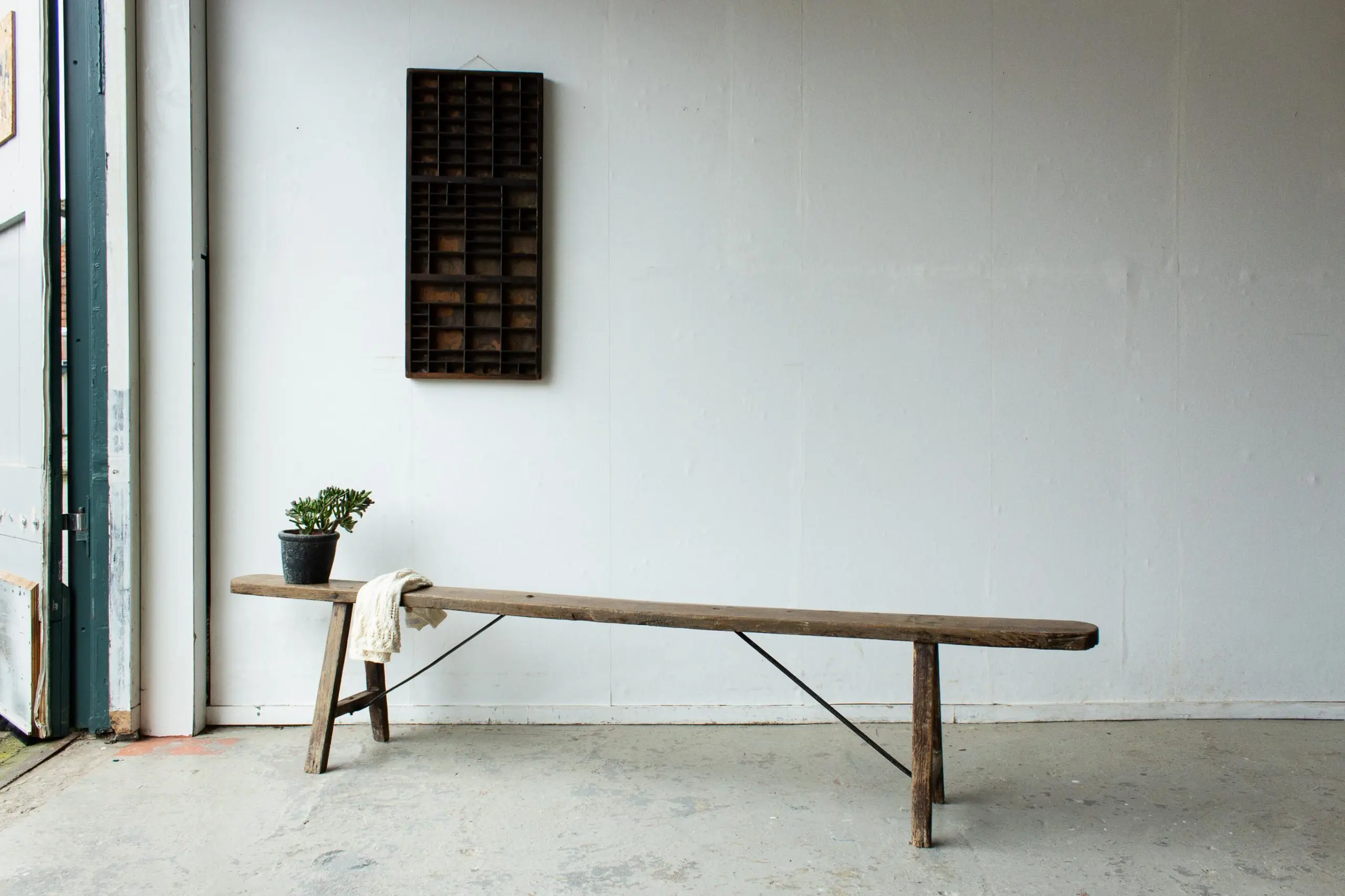 Een prachtige oude bank uit de Limosin, Midden-Frankrijk. De bank heeft een heel stevig eikenhouten zitting en onder de houten poten zitten zwarte metalen sneunen. De bank is nog heel stabiel en mooi. Dus op de schoonmaakbeurt na, hoefde er niets aan te gebeuren. Een prachtige bank voor op de gang, om bijvoorbeeld vetertjes aan te strikken.