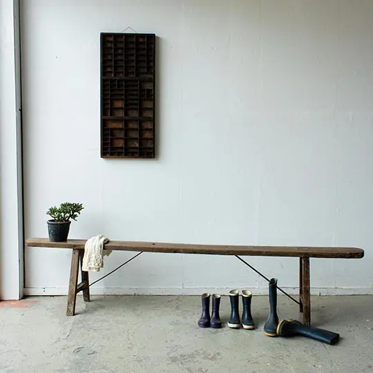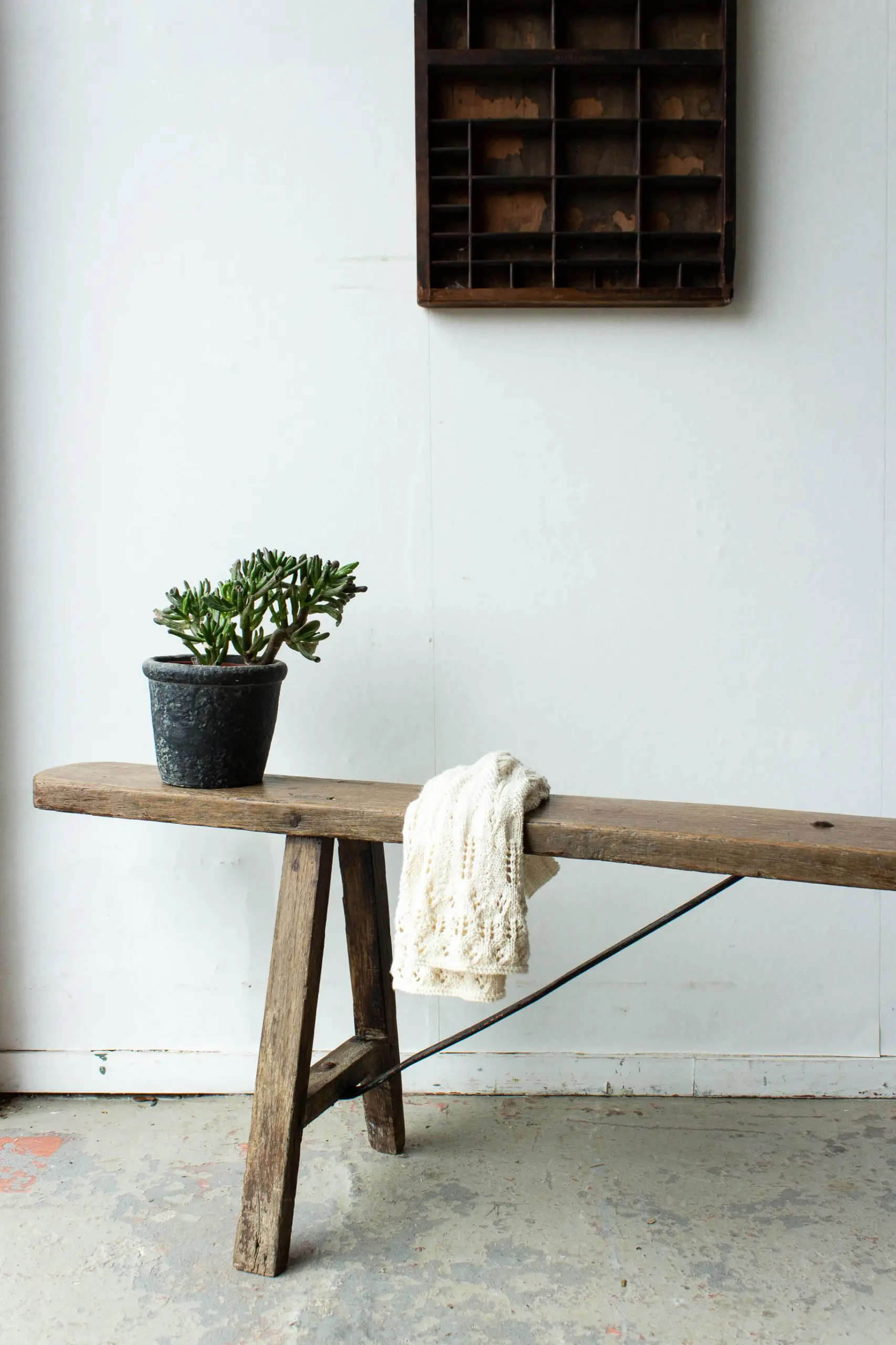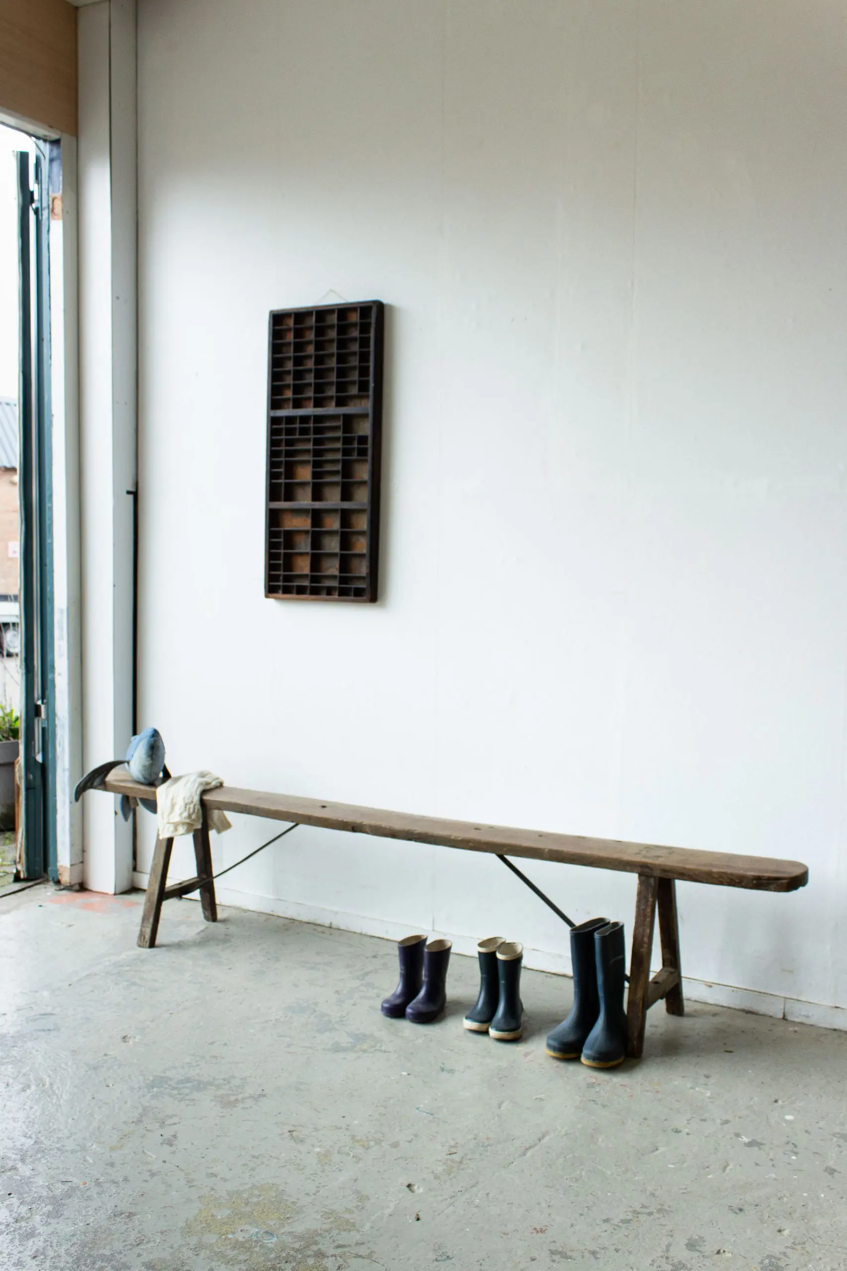 Een prachtige oude bank uit de Limosin, Midden-Frankrijk. De bank heeft een heel stevig eikenhouten zitting en onder de houten poten zitten zwarte metalen sneunen. De bank is nog heel stabiel en mooi. Dus op de schoonmaakbeurt na, hoefde er niets aan te gebeuren. Een prachtige bank voor op de gang, om bijvoorbeeld vetertjes aan te strikken.