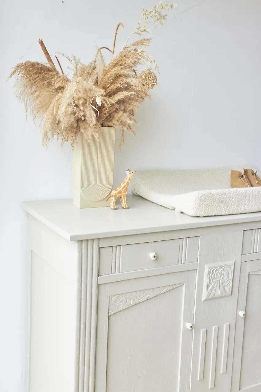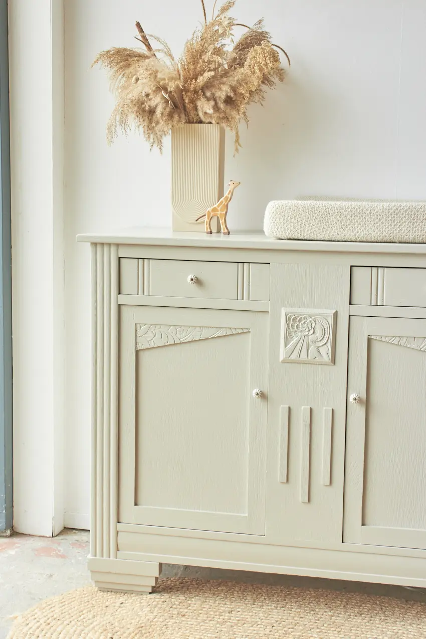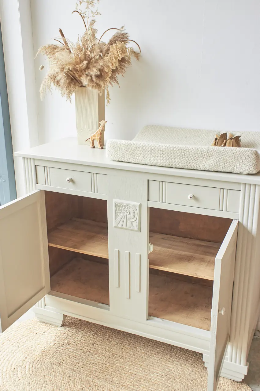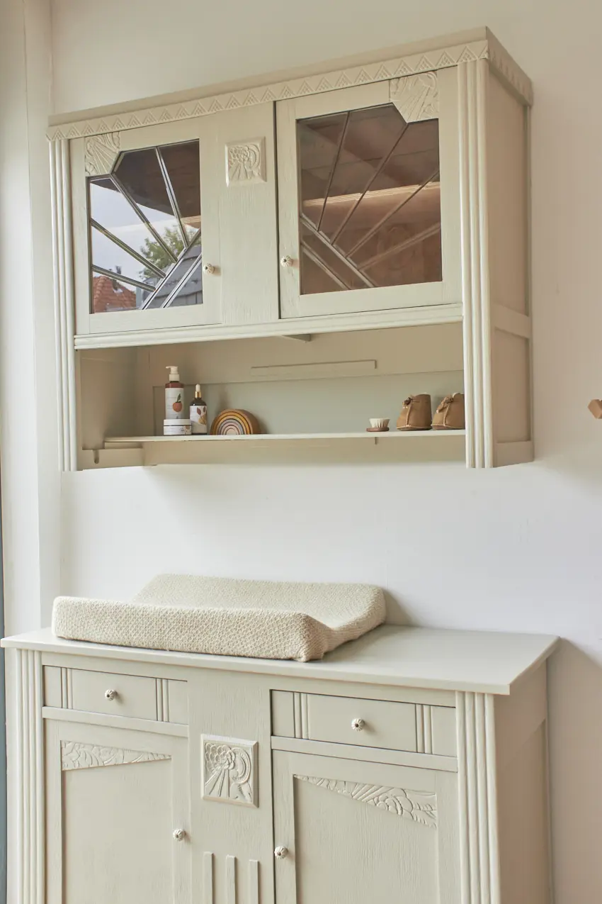 Perfect voor in de baby kamer. Maar deze kast zal ook heel leuk staan in de woonkamer met al het speelgoed of in de keuken voor kookboeken en servies. We hebben de bovenkant ook opgeknapt en in onze kleur Linnen geschilderd. Deze kan je op de commode plaatsen en dan heb je een buffetkast. Of ophangen aan de muur.