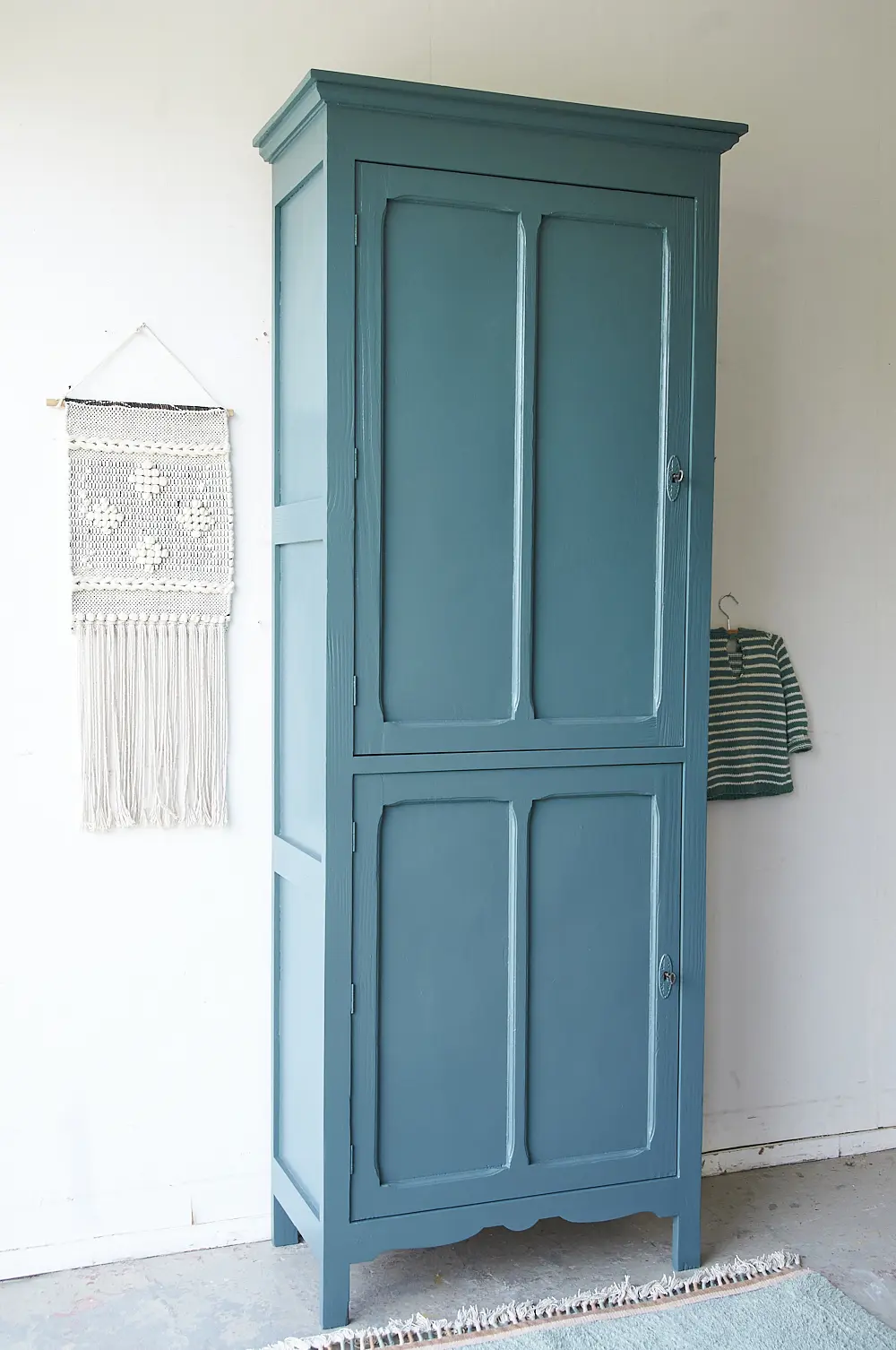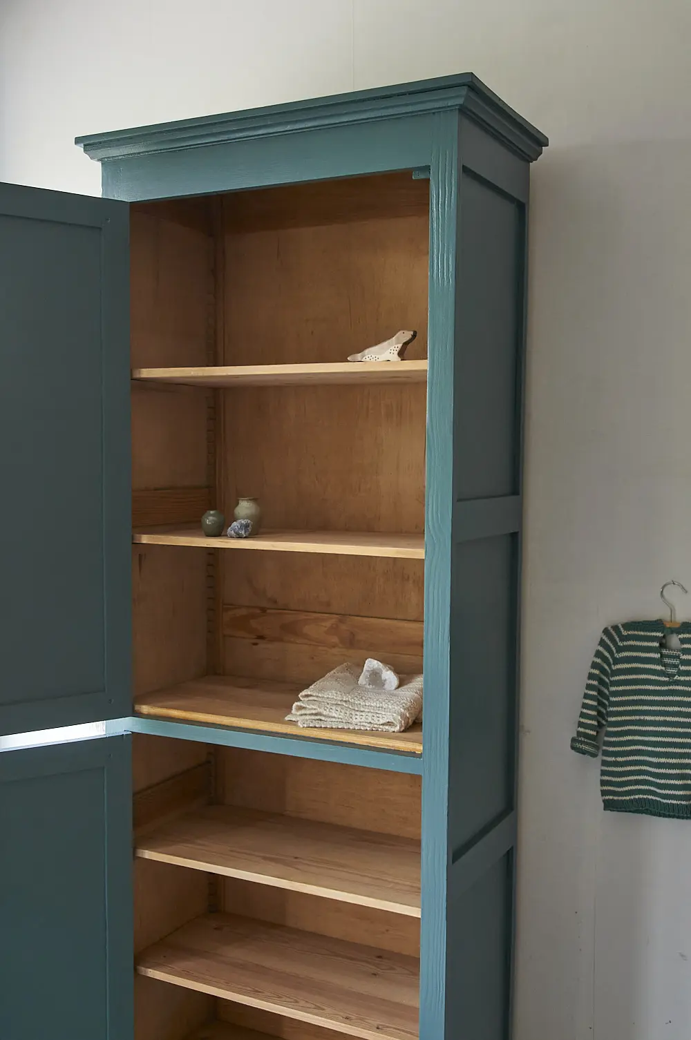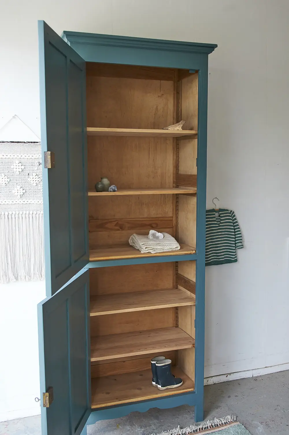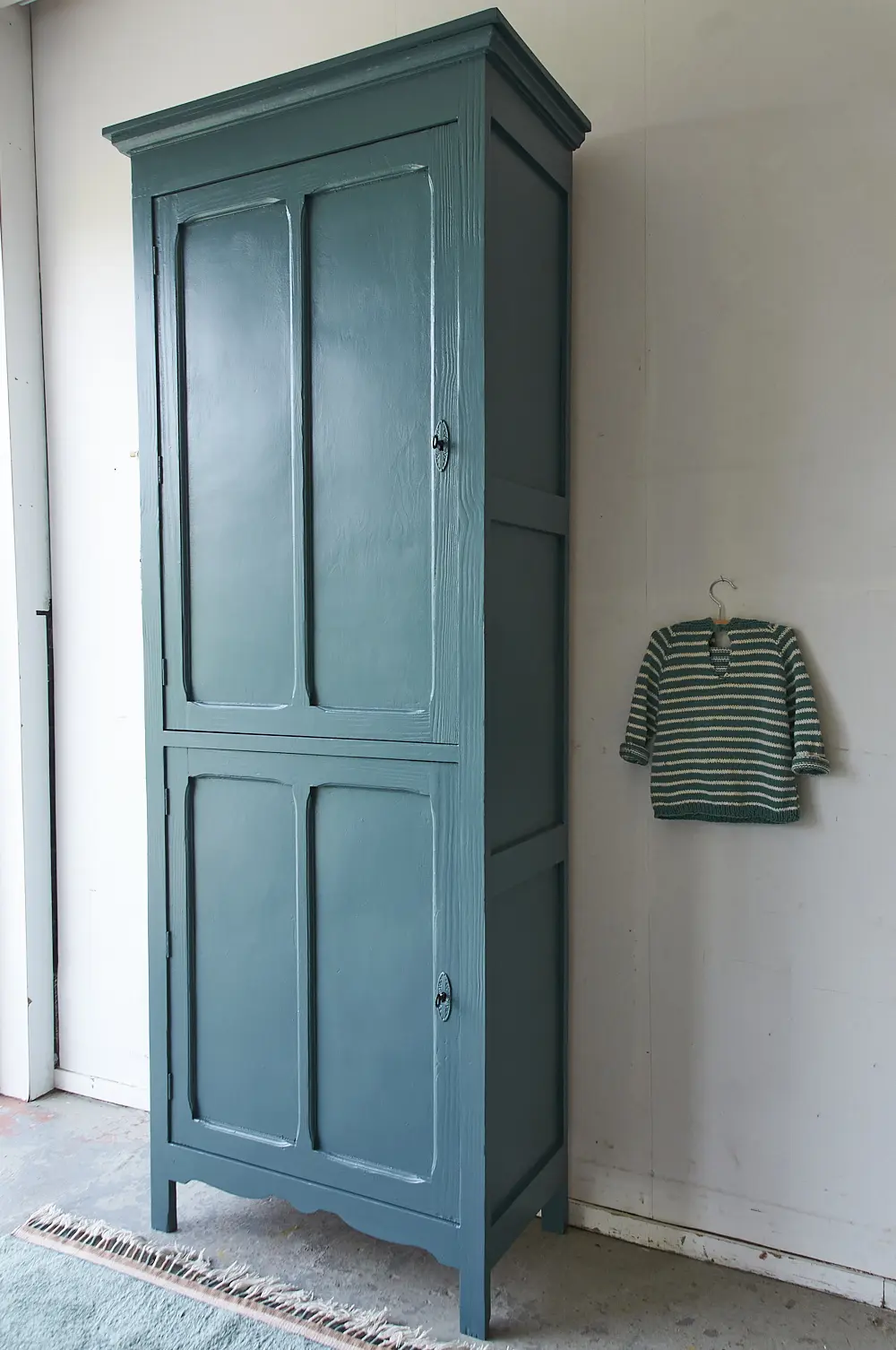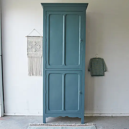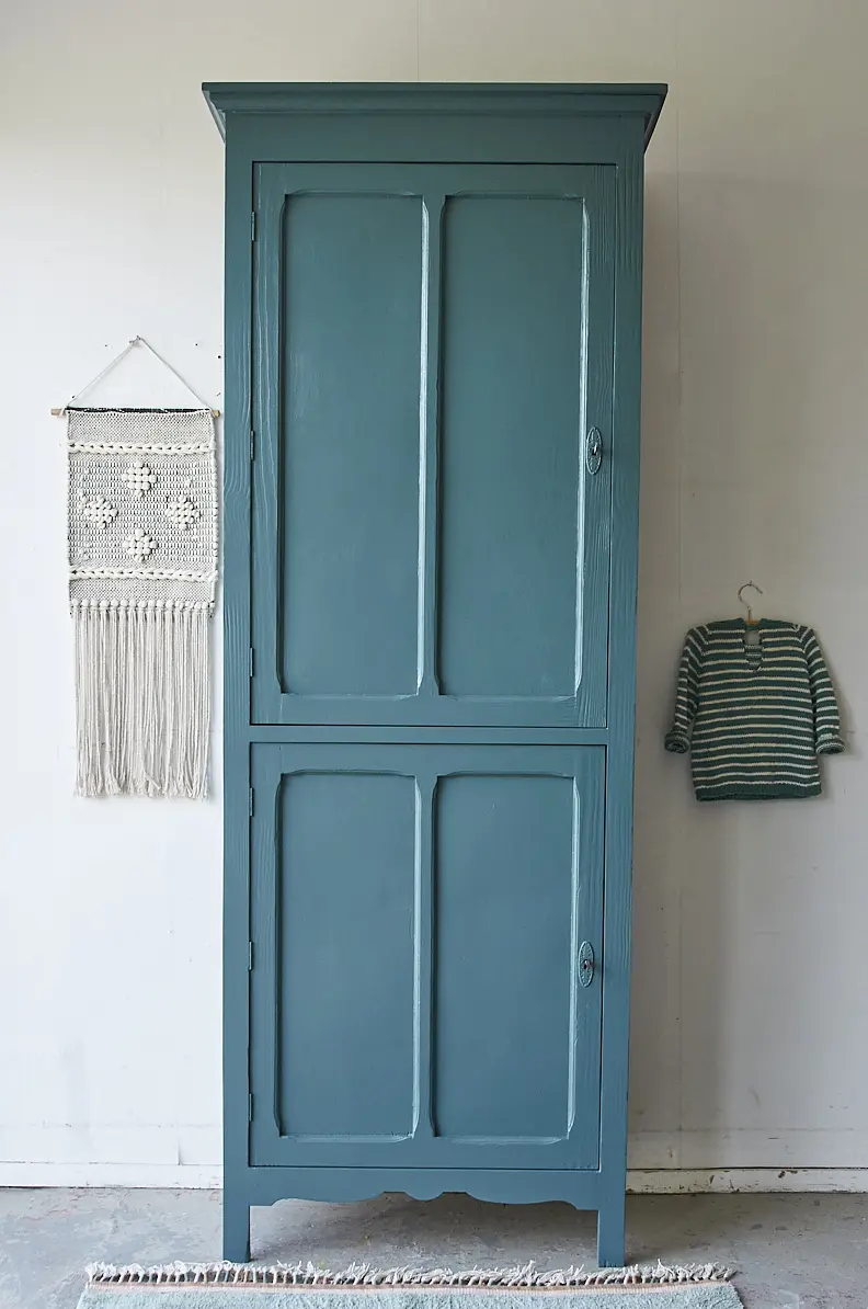 Wat een bijzondere kast is dit! We waren opslag verliefd toen we deze kast binnen kregen. Hij is enerzijds stoer, maar door de subtiele details heeft hij ook iets sierlijks. We kozen ervoor hem in onze kleur ‘klif’ te schilderen. Dat staat hem prachtig! De kast hebben we na het stralen grondig schoongemaakt en behandeld tegen houtworm. Alle nodige reparaties zijn gedaan. De vier planken zijn origineel en in hoogte verstelbaar. De kast had voor beide deurtjes nog goed werkende slotjes, deze hebben we er weer terug op gezet. En nu is hij weer helemaal klaar voor een nieuwe plek!