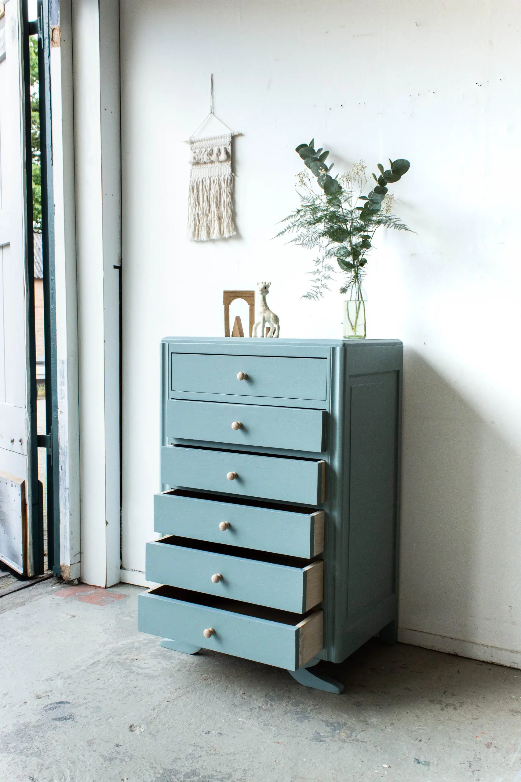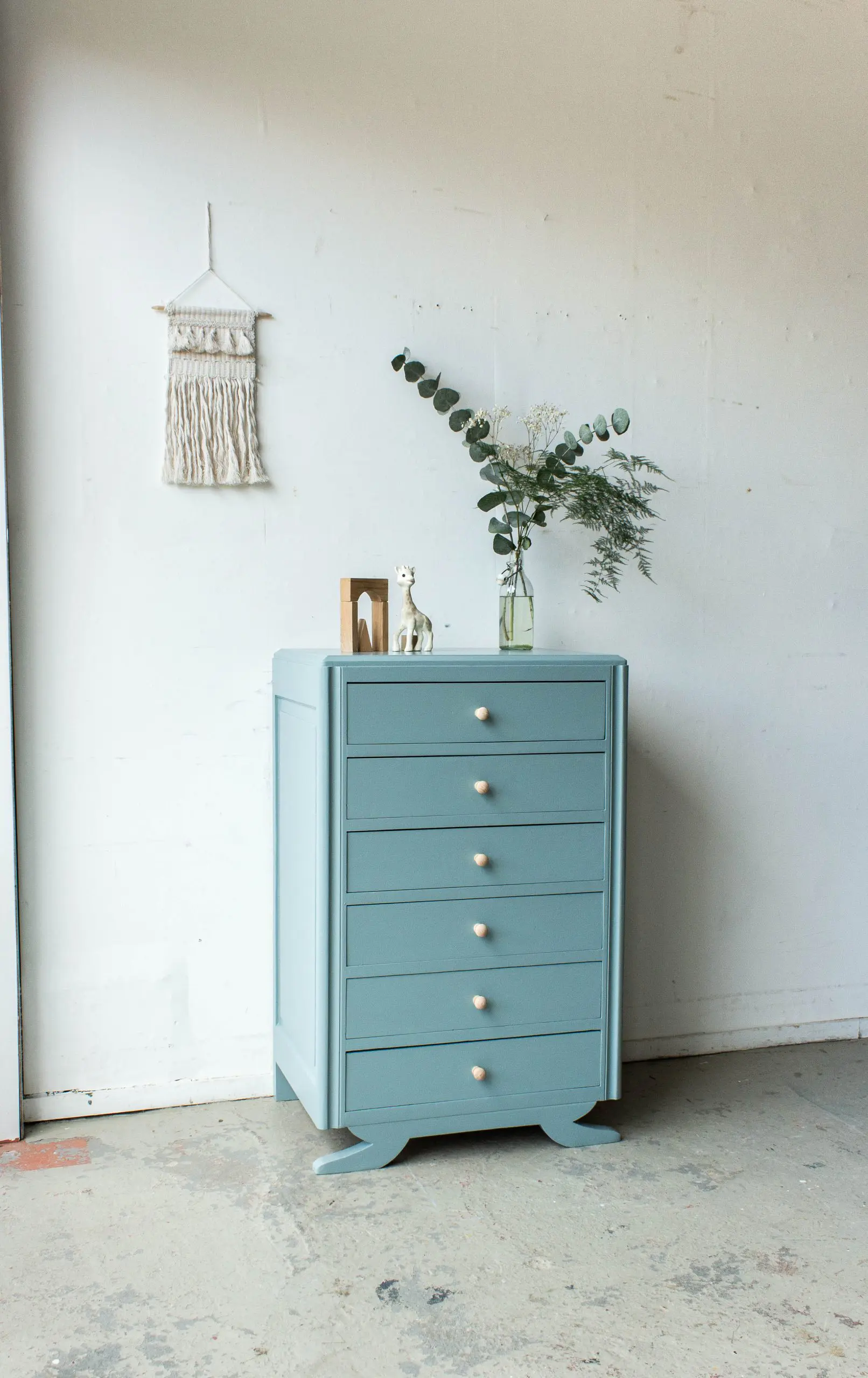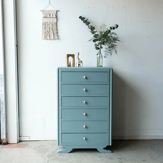 Een bijzonder vintage kastje uit Midden Frankrijk. Het ladenkastje is grondig schoongemaakt, helemaal nagelopen en vervolgens kaal geschuurd. Vervolgens is hij in deze mooie grijsblauwe kleur geschilderd. Op de zes laden zijn tot slot mooie houten knopjes gezet. Er leuk zijn natuurlijk de pootjes van het kastje! En zo is hij weer helemaal klaar voor gebruik. Heel leuk voor bijvoorbeeld speelgoed of knutselspul.