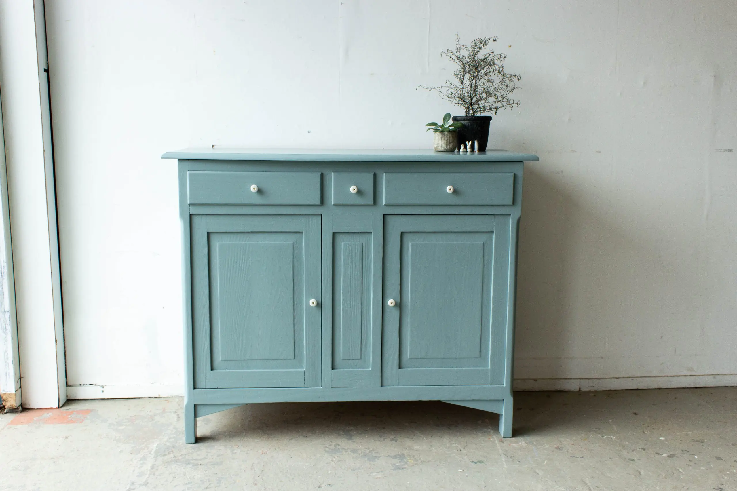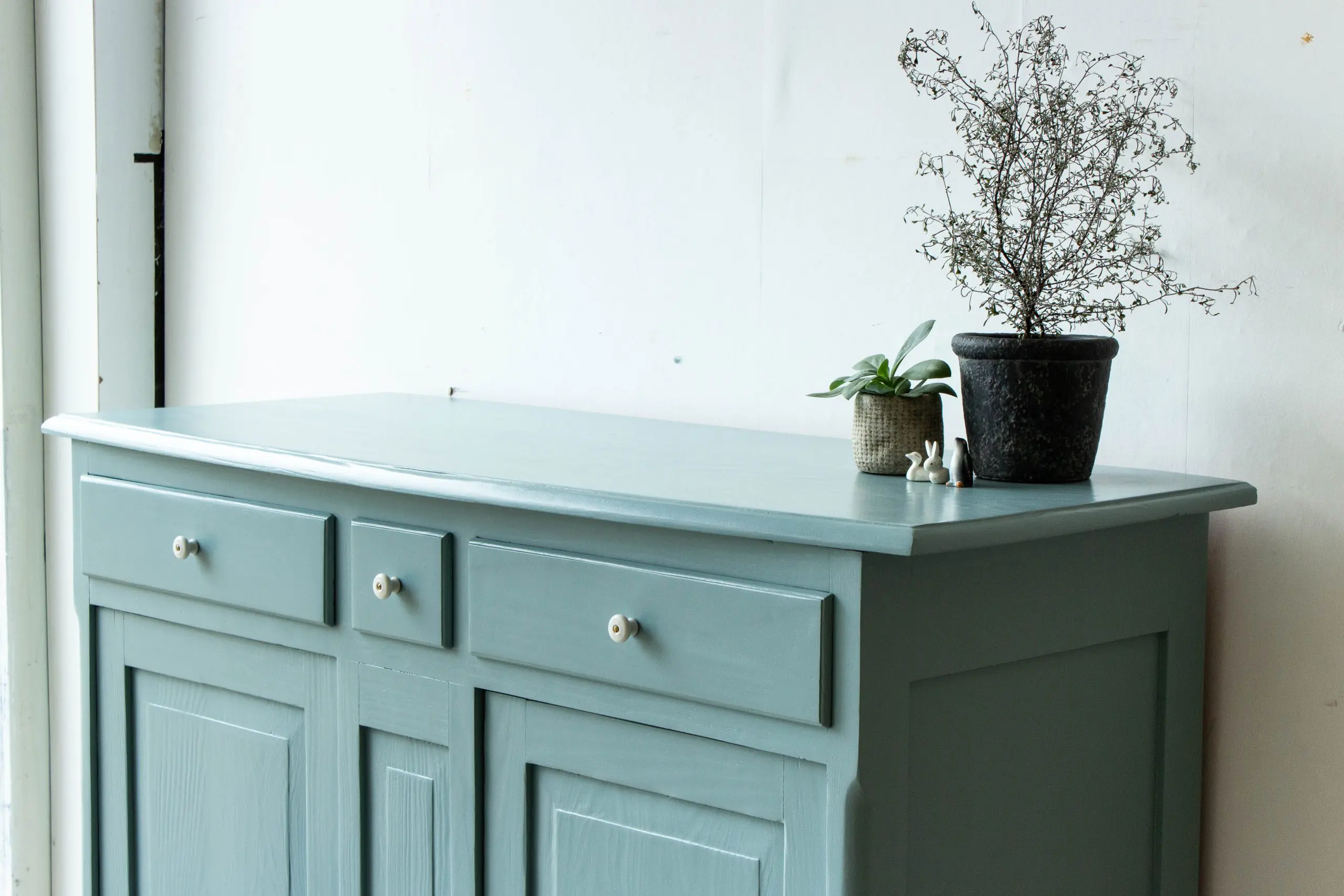 Een mooie, brede vintage commode uit Frankrijk. We hebben dit leuke kastje goed schoongemaakt en een nieuwe bodem gegeven. Ook hebben we hem nog wat verstevigd, zodat hij weer jaren mee kan. Deze grijsblauwe kleur leek ons erg mooi bij dit kastje. En inderdaad! Op de drie laatjes en de twee deuren zijn tot slot subtiele knopjes van porselein gezet. De deurtjes sluiten door middel van magneetjes. En zo is deze ruime, aparte vintage commode weer helemaal klaar voor gebruik!