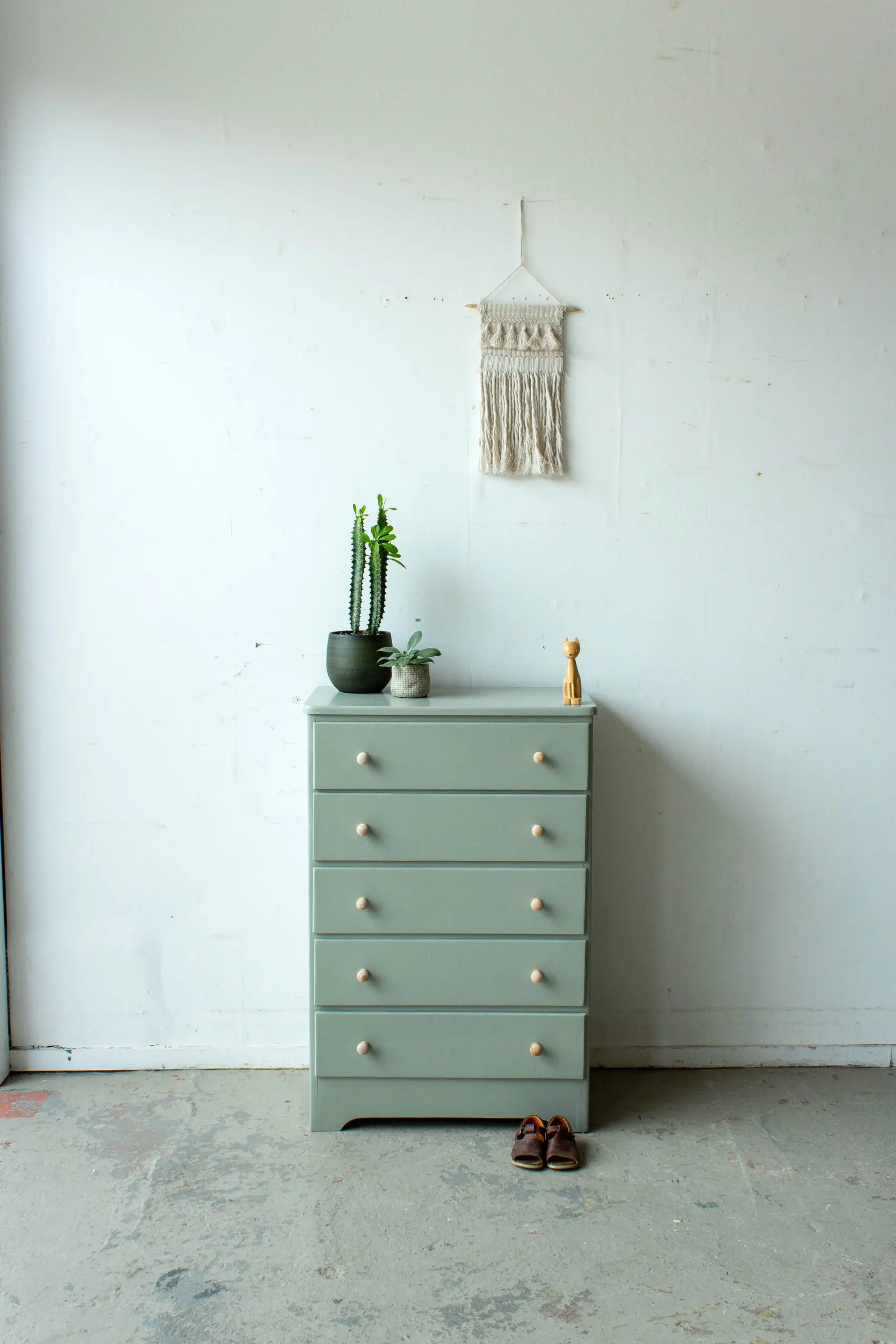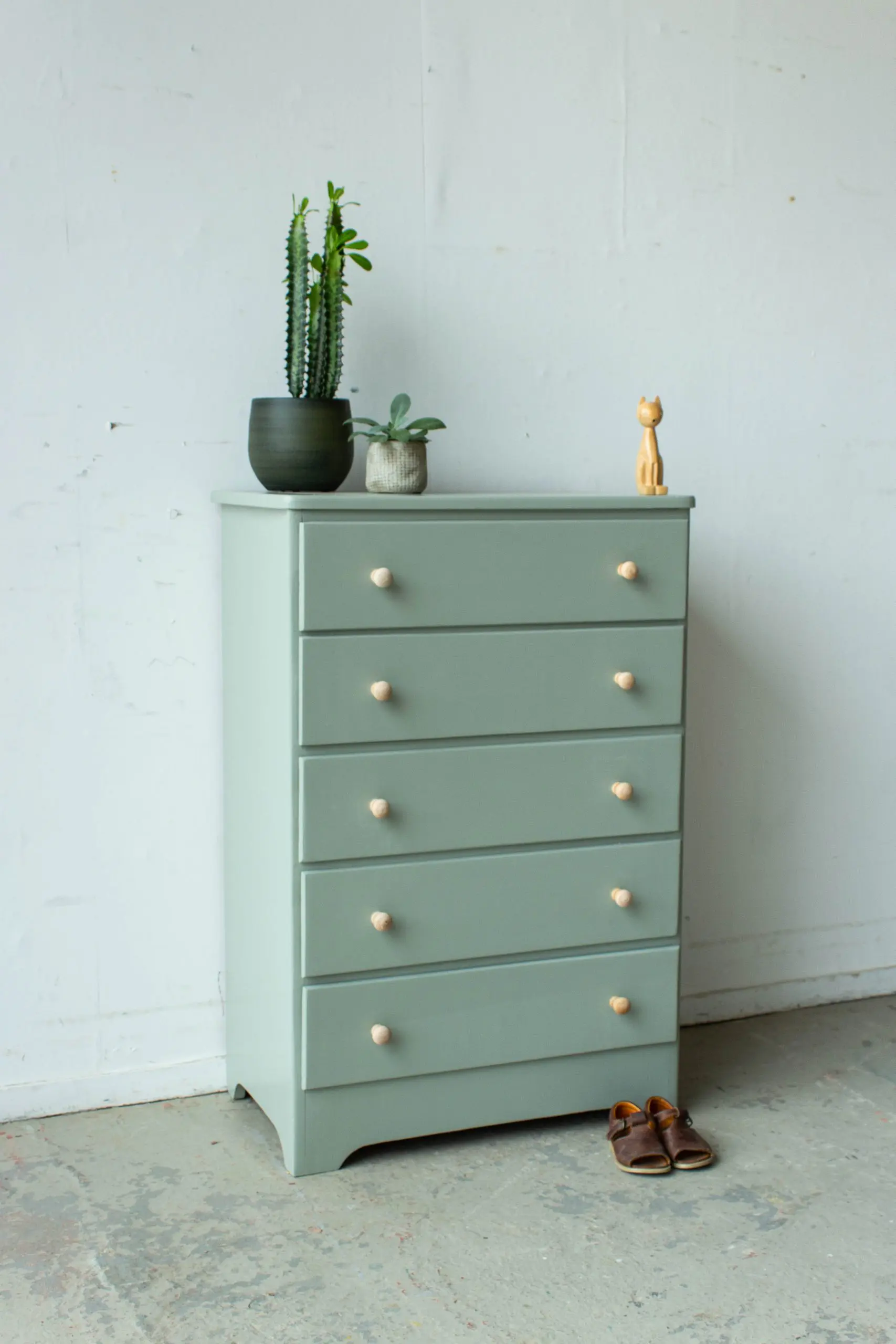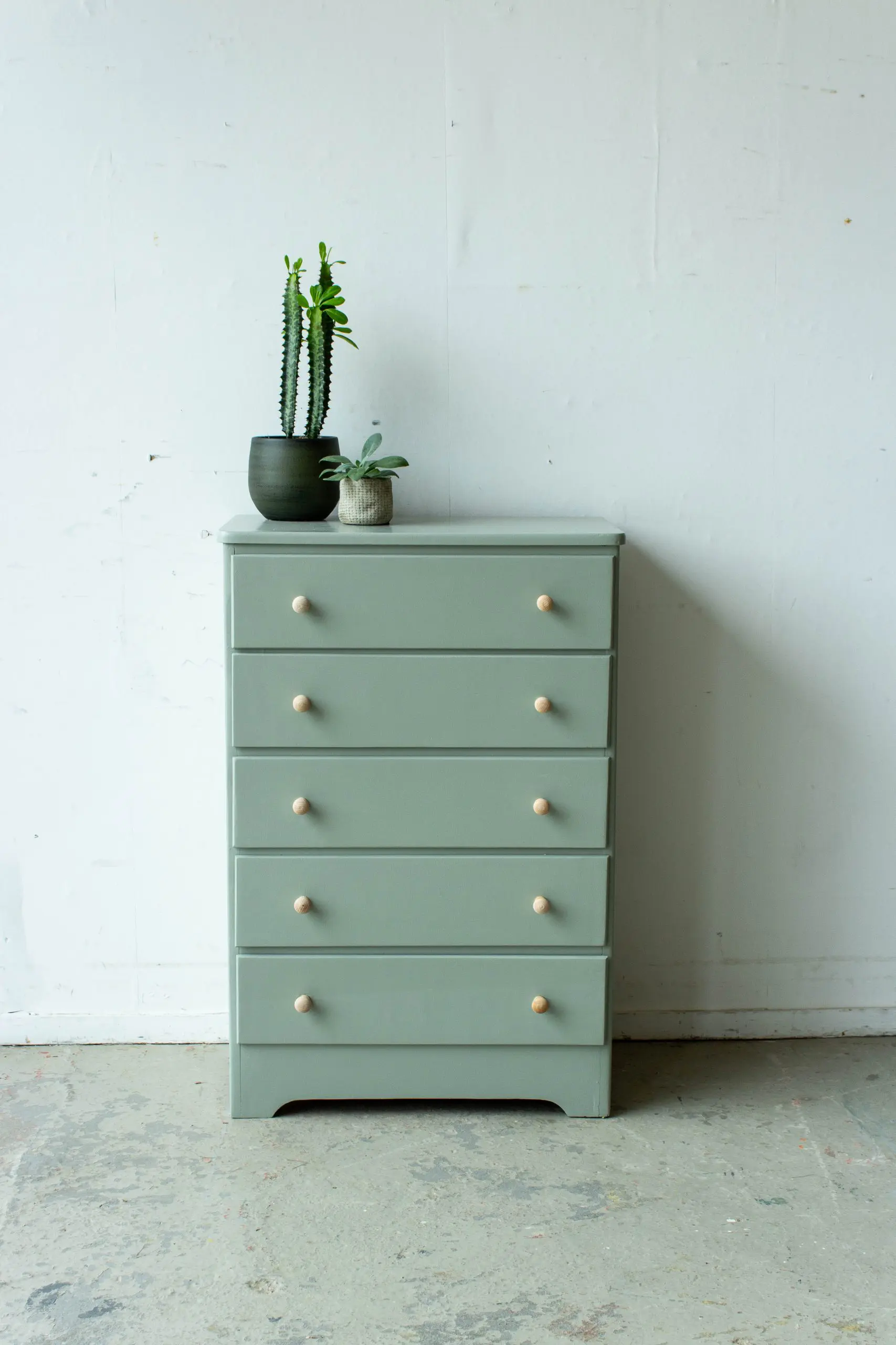 Dit kleine vintage ladenkastje komt uit België. Toen we hem binnenkregen, was hij wit en zaten er grote zilverkleurige knoppen op de laden. Dat kon mooier, wisten wij! Dus na hem helemaal nagelopen en schoongemaakt te hebben, is dit lieve kastje in een grijsgroene kleur geschilderd. En op de laden hebben we mooie simpele hoten knopjes gezet. Wat is ie leuk geworden! Een geweldig kastje voor op de kinderkamer, om sokken en ondergoed in op te bergen bijvoorbeeld. Klaar voor gebruik.