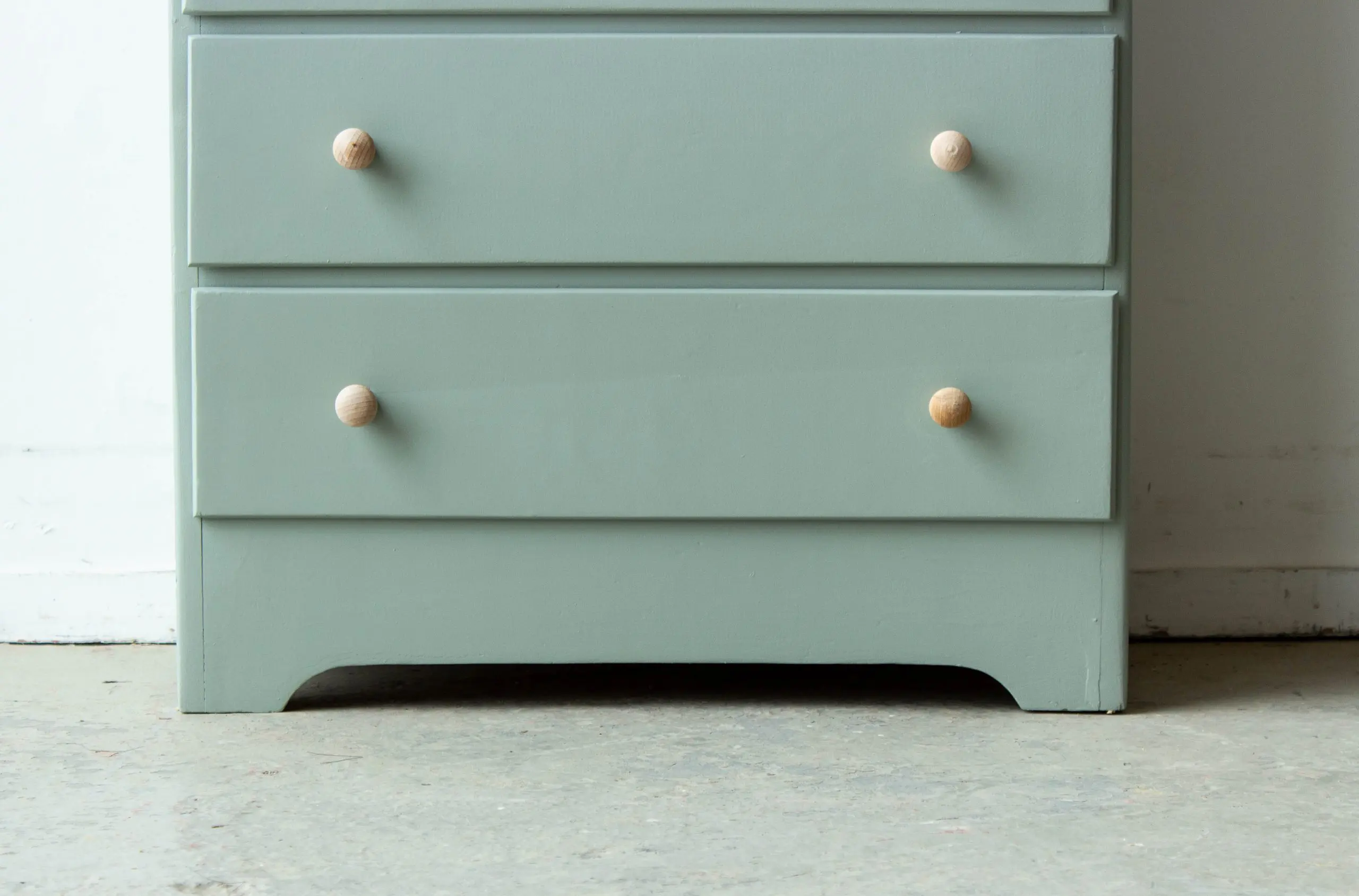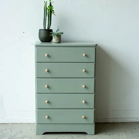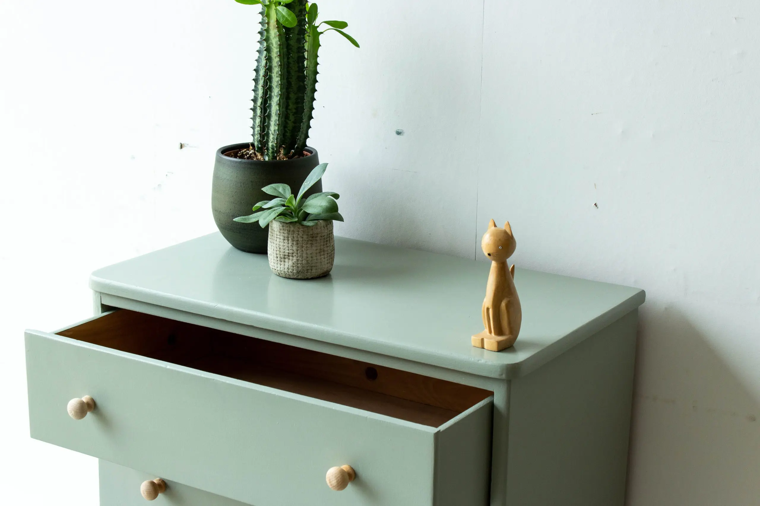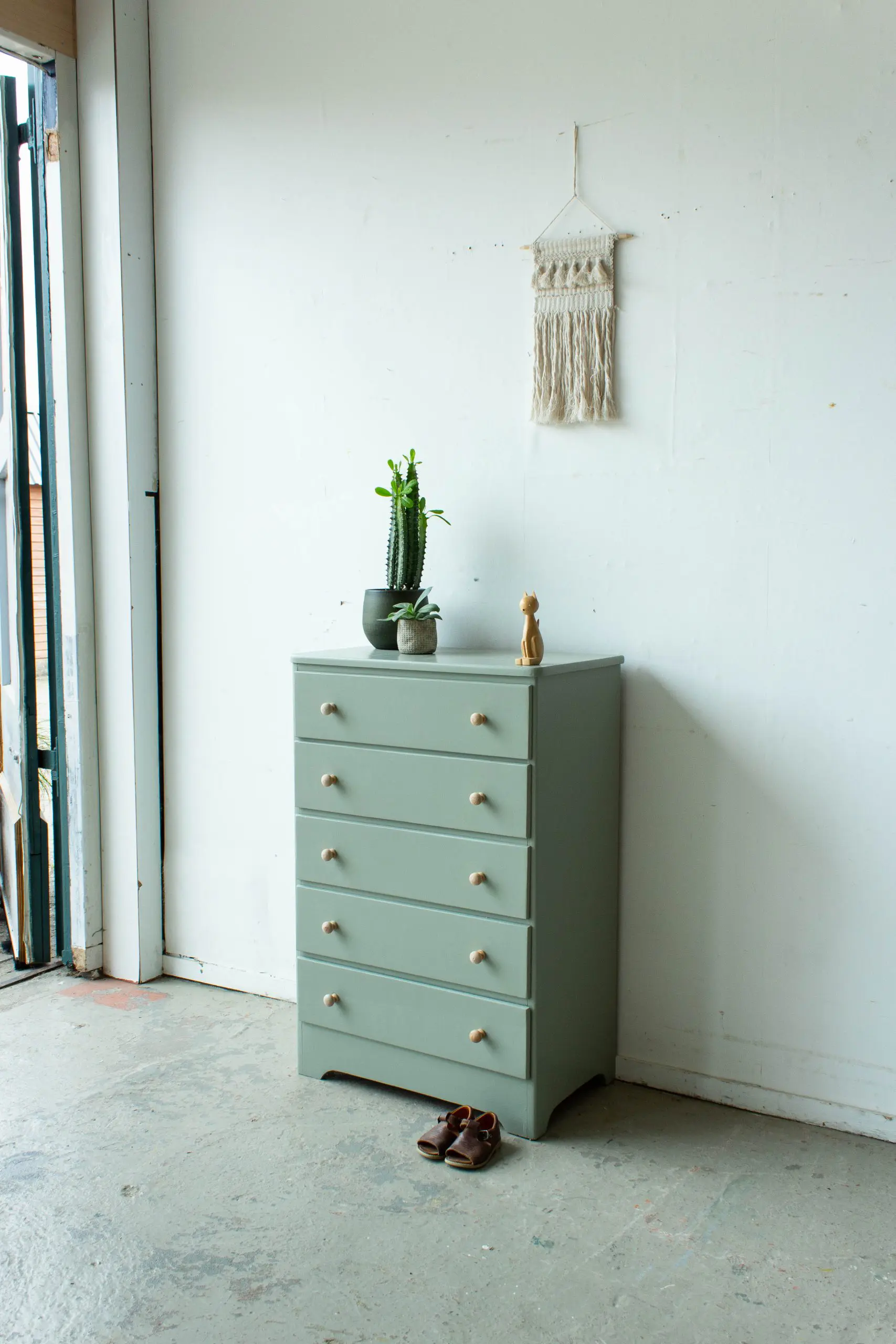 Dit kleine vintage ladenkastje komt uit België. Toen we hem binnenkregen, was hij wit en zaten er grote zilverkleurige knoppen op de laden. Dat kon mooier, wisten wij! Dus na hem helemaal nagelopen en schoongemaakt te hebben, is dit lieve kastje in een grijsgroene kleur geschilderd. En op de laden hebben we mooie simpele hoten knopjes gezet. Wat is ie leuk geworden! Een geweldig kastje voor op de kinderkamer, om sokken en ondergoed in op te bergen bijvoorbeeld. Klaar voor gebruik.
