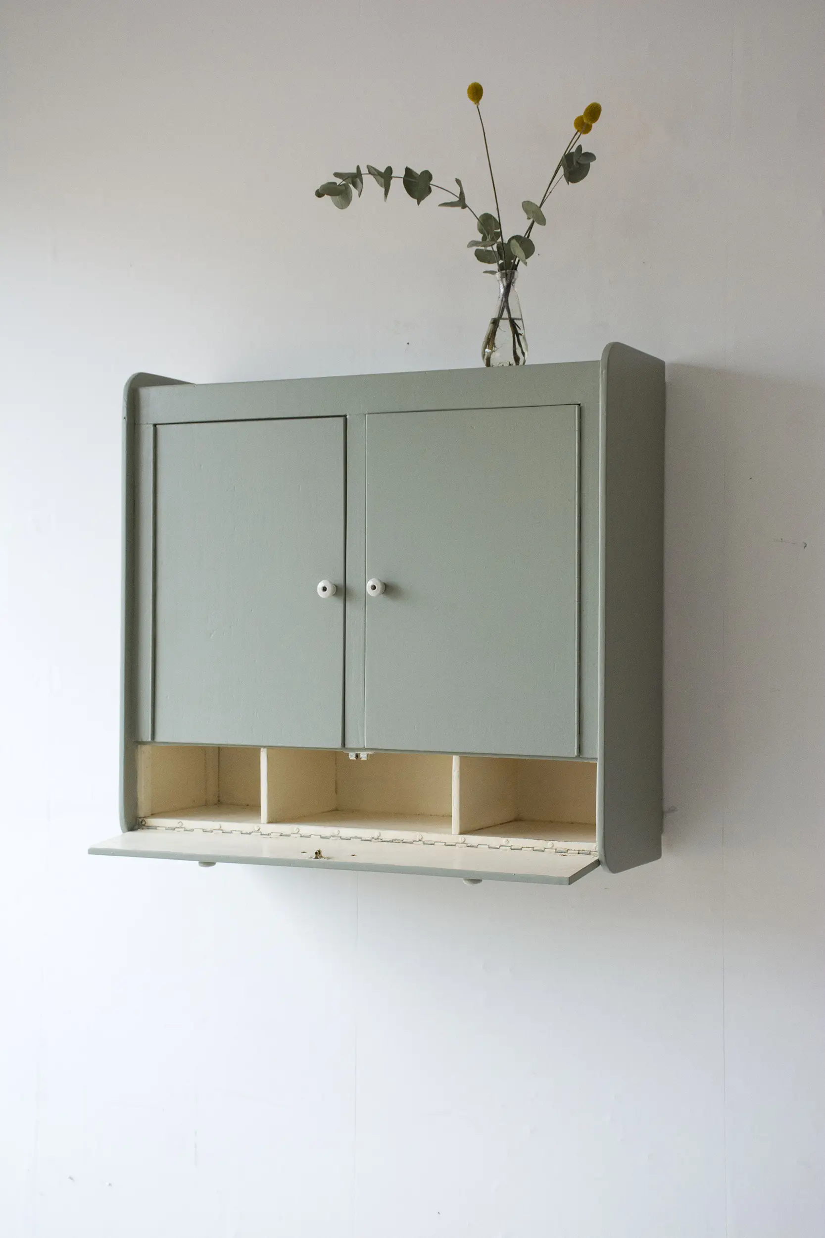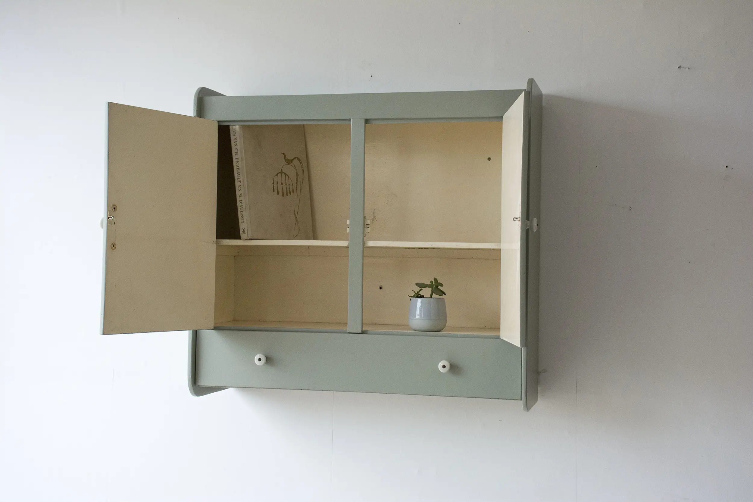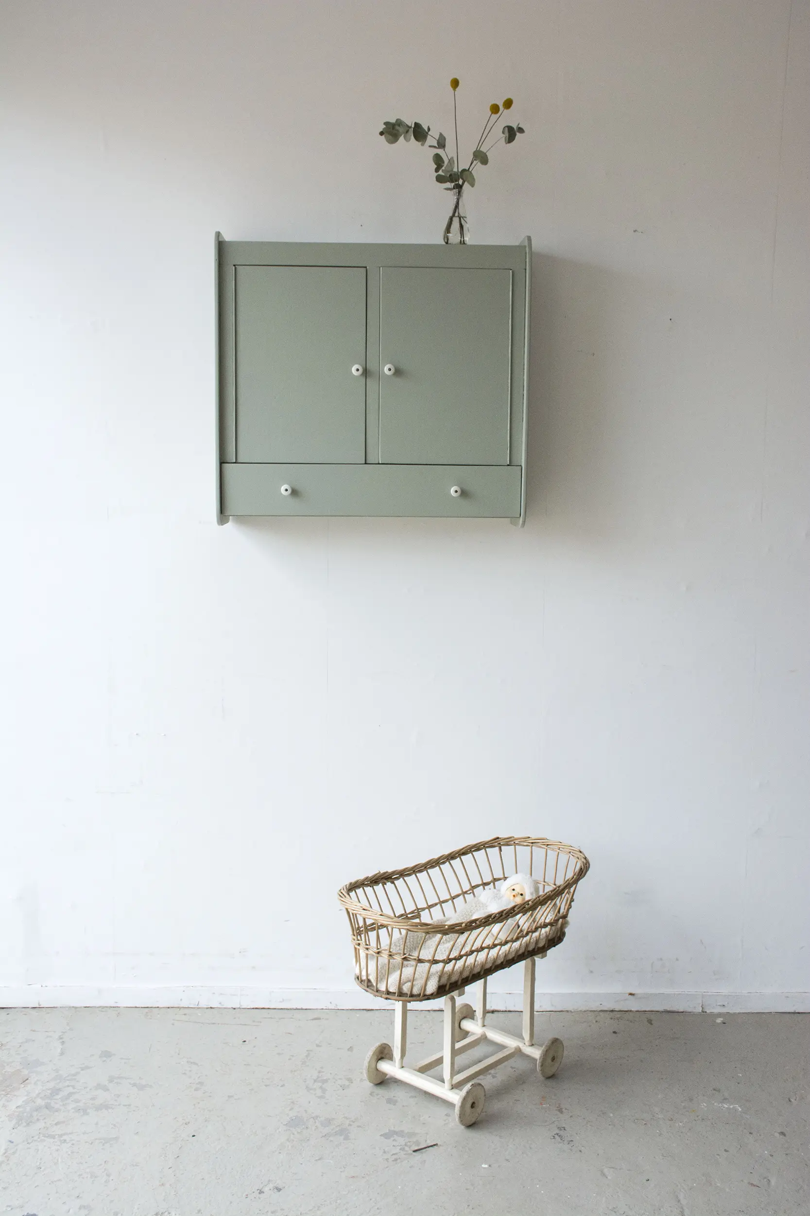 Een ontzettend leuk vintage kastje uit België. Dit wandkastje hebben we na de schoonmaak- en schuurbeurt in een mooie grijsgroene kleur geschilderd. Leuk detail is het klepje onder de twee deurtjes waar drie kleine vakjes achter zitten. Op de deuren en het klepje zijn klassieke porseleinen knopjes geplaatst. In de achterwand van het kastje zitten twee gaatjes, zodat het eenvoudig met schroeven aan de muur bevestigd kan worden. Geweldig als boekenkastje of speelgoedkastje te gebruiken. En helemaal klaar voor gebruik!