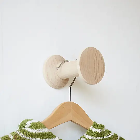 Een grote punaise in de muur, om daar je favoriete jurkje of poster aan te hangen. Zo leuk zijn ze. Stiekem lijken ze ook wel op een groot ouderwets garenklosje. Ze zijn helemaal gemaakt van hout en door middel van de grote schroef draai je hem gemakkelijk in de muur. Ze zijn daardoor ook heel sterk, een zware tas met boeken, maar ook die zware jas blijft er goed en stevig aan hangen.