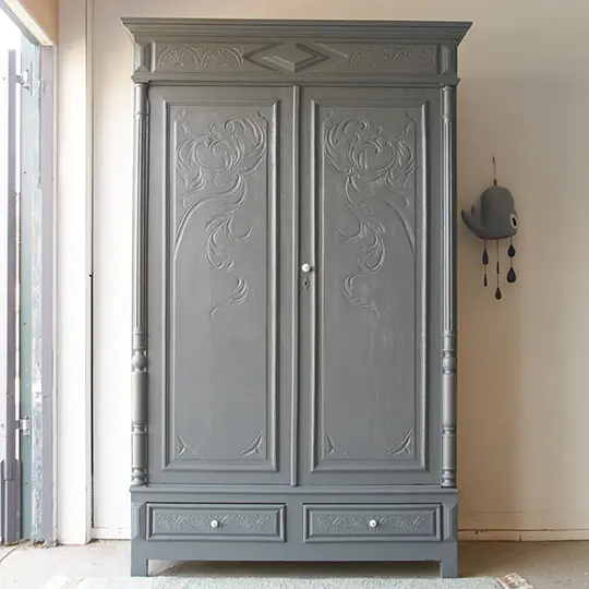Een kast met zoveel houtsnijwerk hebben we niet vaak, best wel tof! Zeker in combinatie met de rustige kleur Kiezel vonden we dit helemaal leuk. Kiezel is een neutrale grijs blauwe kleur. Deze kleur is een echte allemansvriend, niet te donker en hij past óveral bij. We zien deze kast bijvoorbeeld voor ons op een heuse junglekamer! We hebben de kast grondig schoongemaakt en behandeld tegen houtworm. De bodem is vervangen, de kroon is beter vastgezet en de deuren zijn goed teruggehangen. Een van de achterpanelen is vervangen en ook de bodems van de lades. Deze kast heeft een hoop liefde van ons gehad! Na al deze nodige reparaties kreeg hij deze indeling van ons. Super handig zowel hang als leg! De linker deur sluit met een schuif en de rechterdeur met een magneetje. En nu is deze kast helemaal klaar voor een nieuwe plek!