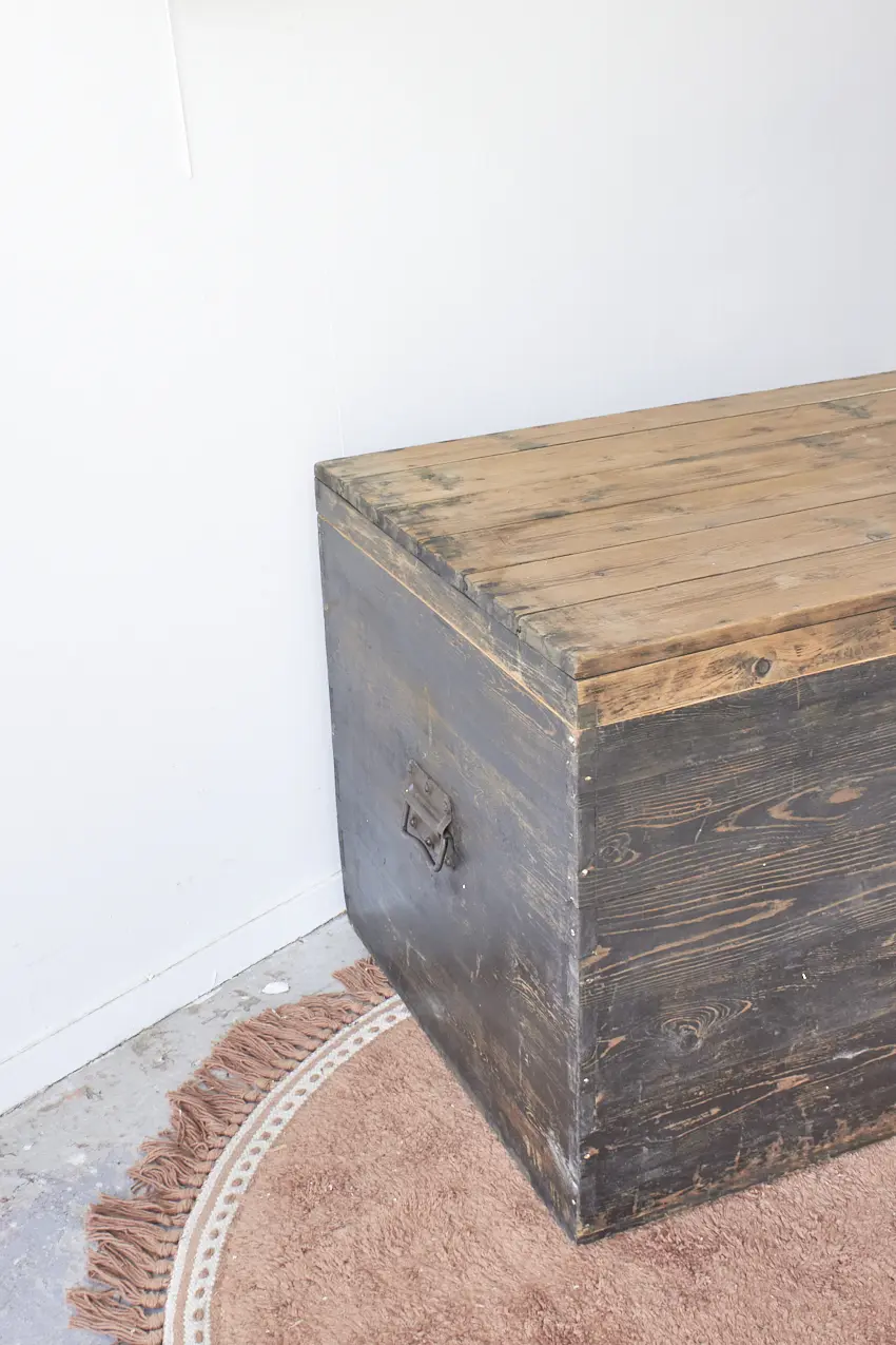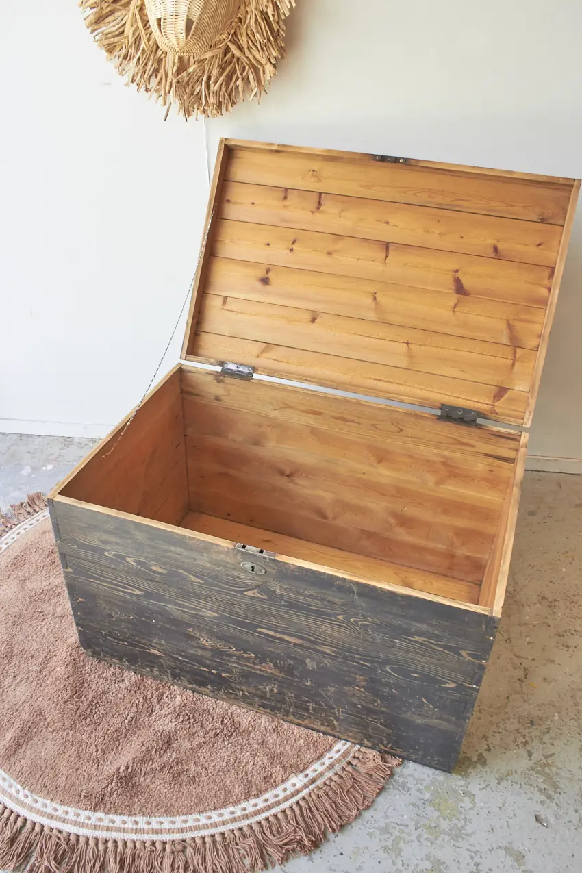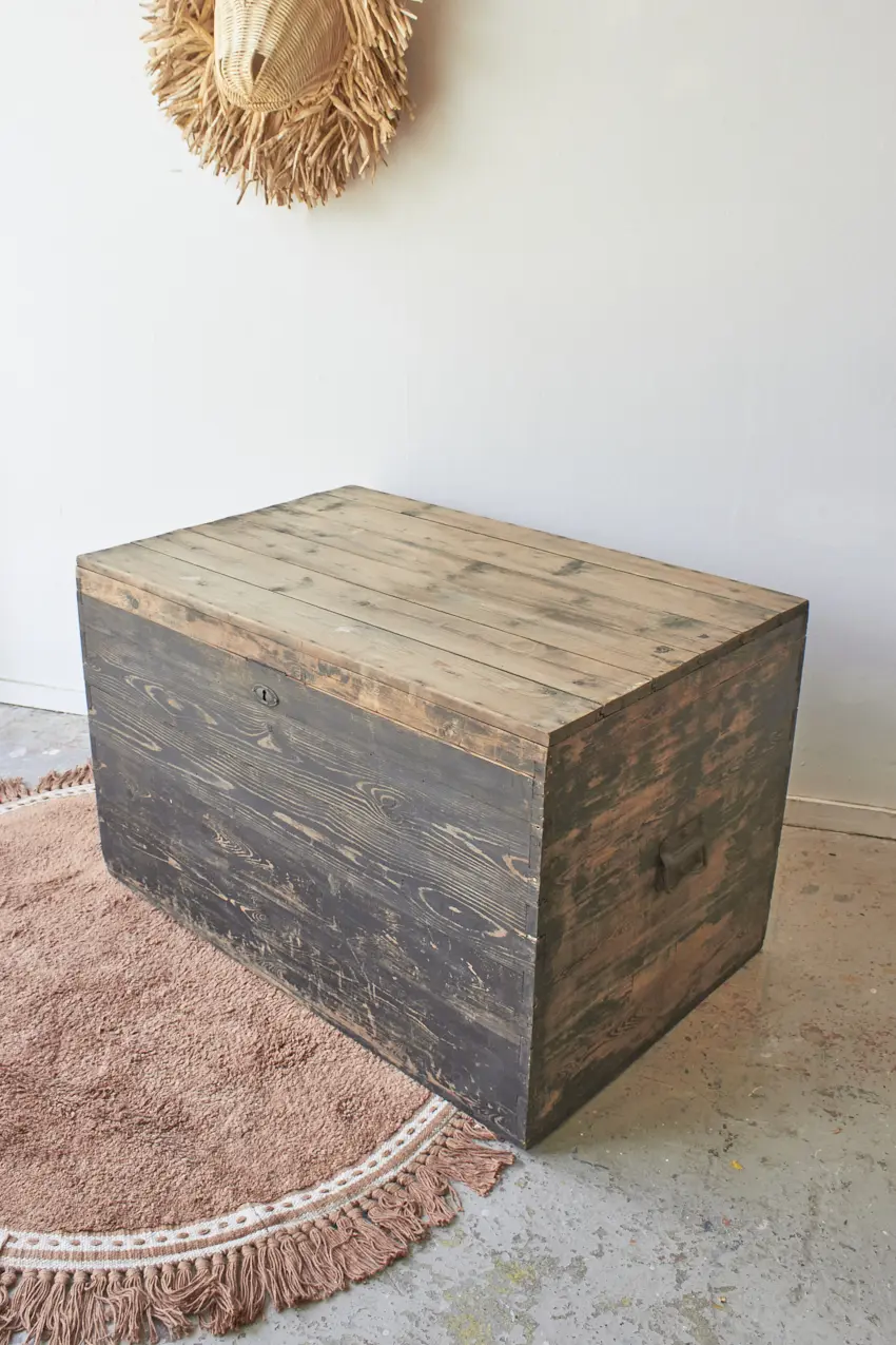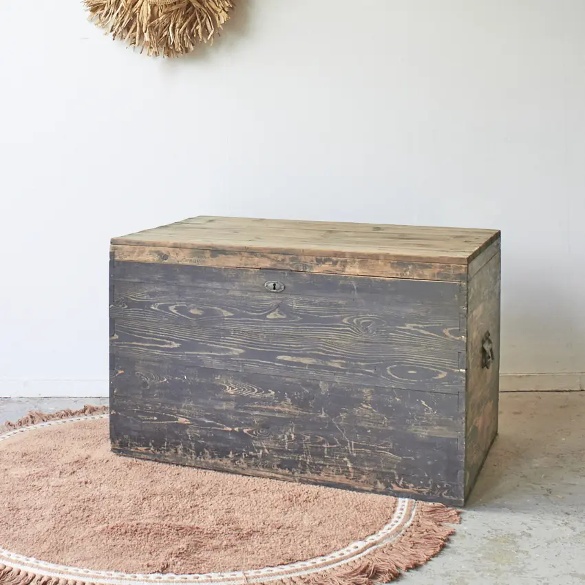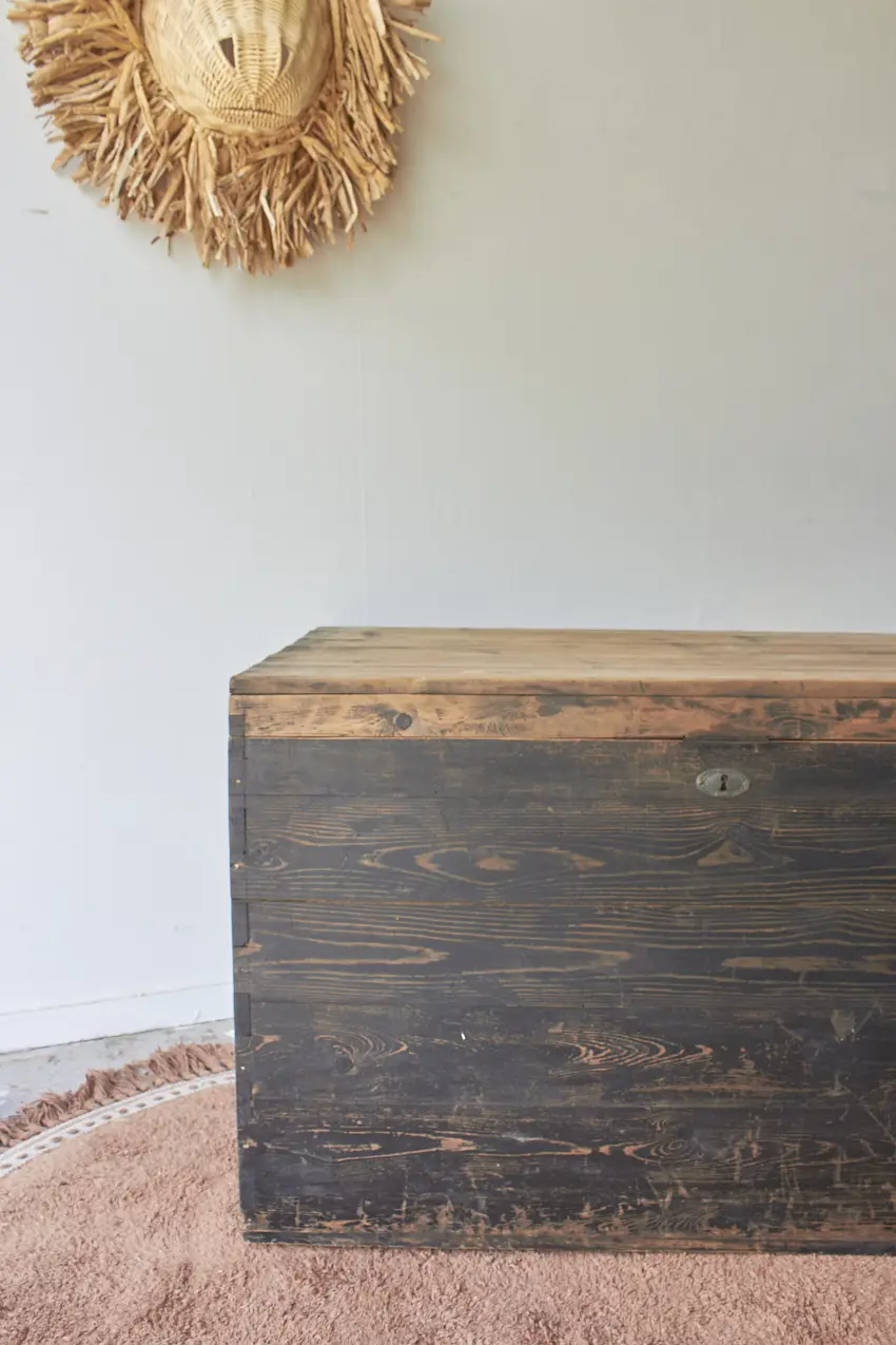 Deze kist komt uit Frankrijk. Een echte oude dekenkist! Je kunt aan alles zien dat hij er al een heel leven op heeft zitten. We hebben deze kist goed schoongemaakt en behandeld tegen houtworm. Aan de binnenkant hebben we een ketting geplaatst zodat de deksel goed open blijft staan zodra je hem open doet. Het is een fijne kist voor speelgoed, dekens of laarzen. Hij is weer helemaal klaar voor gebruik!