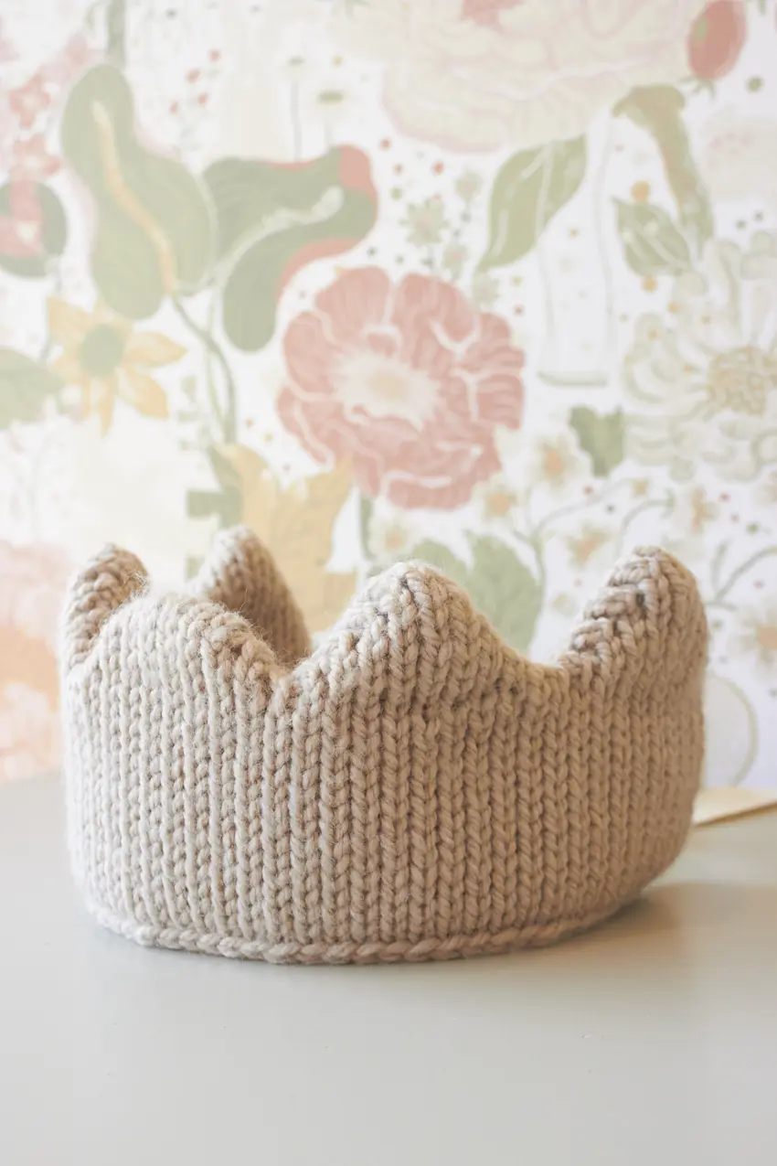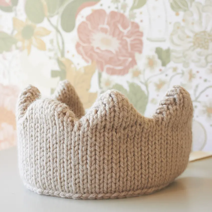 Een prachtige, handgemaakte kroon: die wil je bij elk feestje opzetten! Superleuk als kraamcadeautje of verjaardagscadeau en leuk voor zowel ouders en kindjes. Want door de linten past iedereen deze gebreide kroon. Verkrijgbaar in de kleuren beige, roze en okergeel.
