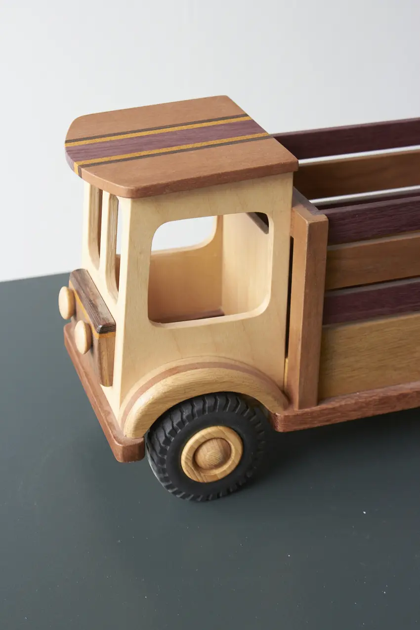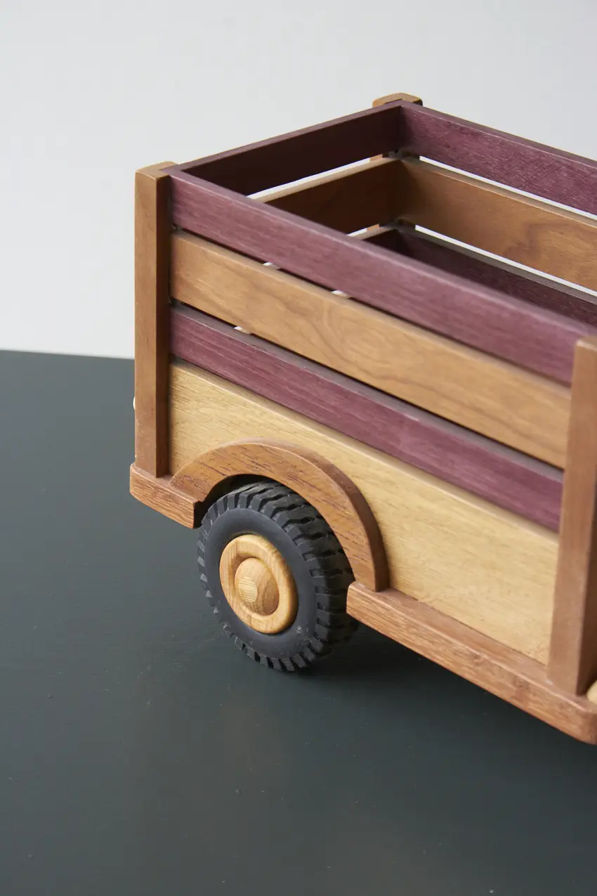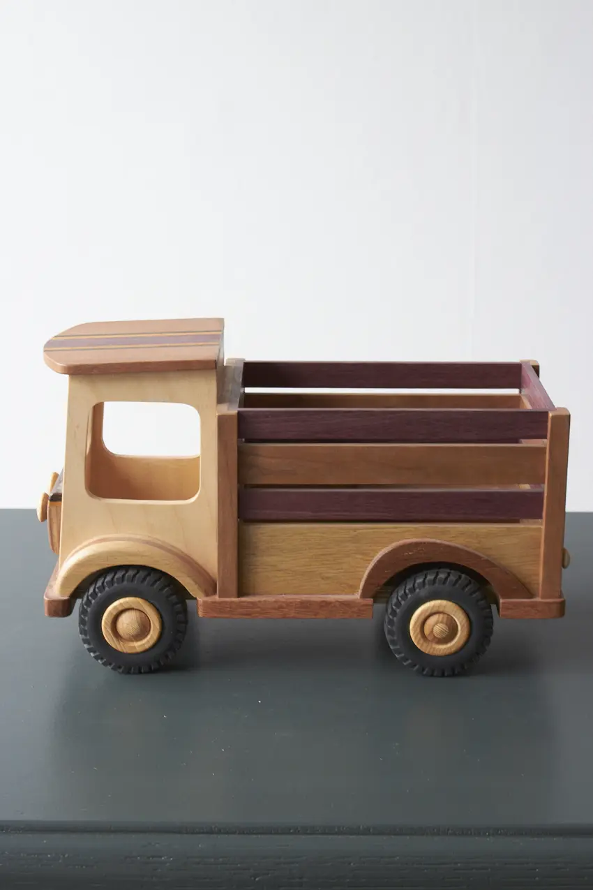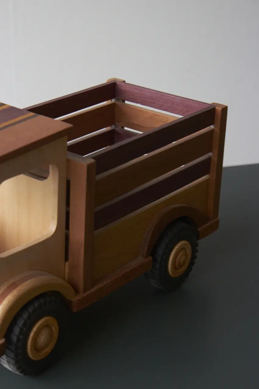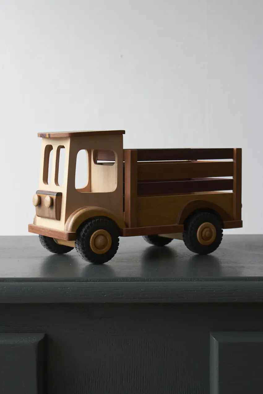 Een ideale boerderijwagen voor de echte boer of boerin! Achterin de bak is er genoeg plek voor alle boerderijdieren. Deze auto is helemaal met de hand gemaakt door Henk. De verschillende houtsoorten, mooie details en afwerking maakt het een echte unieke auto. Laat hem pronken op de kast of laat je kleintje er gewoon lekker mee spelen.