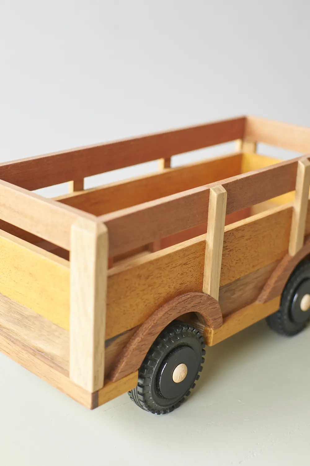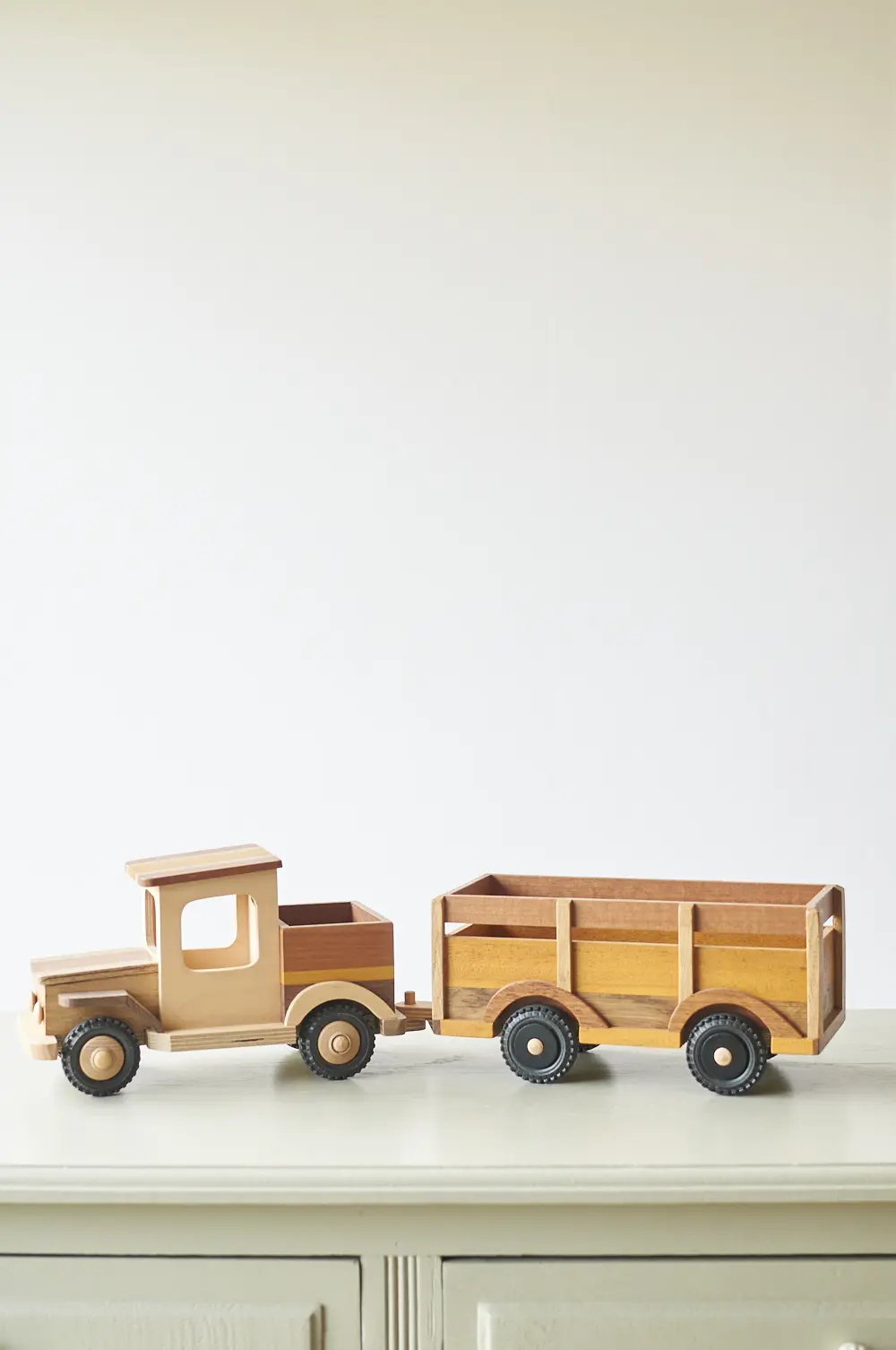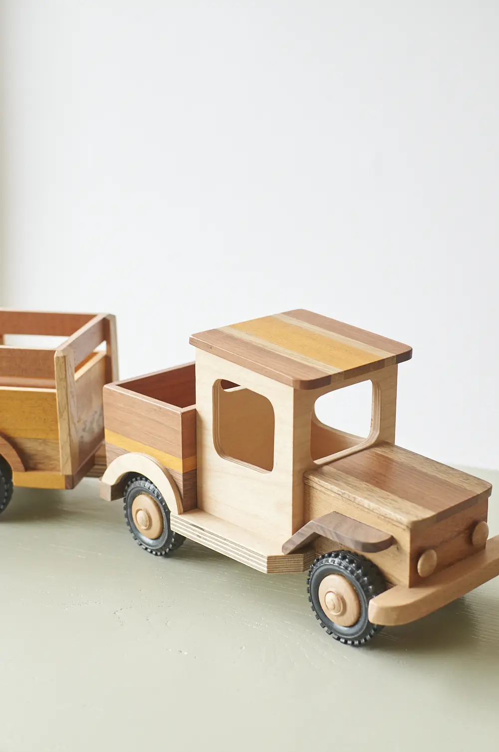 Een ideale auto voor de echte avonturier en goed voor uren speelplezier! Deze boerderijwagen is helemaal met de hand gemaakt door Henk. Hij heeft een grote aanhanger waar veel plek is voor houten boerderijdieren en poppetjes. De verschillende houtsoorten, mooie details en afwerking maakt het een echte unieke auto. Laat hem pronken op de kast of laat je kleintje er gewoon lekker mee spelen.