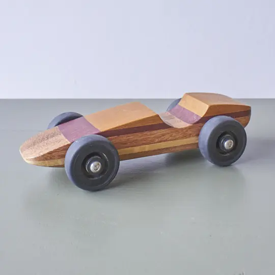 Deze houten raceauto, helemaal met de hand gemaakt door Henk. Verschillende soorten en kleuren hout zijn aan elkaar gelijmd, vervolgens is er van deze vorm een raceauto van gemaakt. Zo mooi gedaan! Met de soepel rijdende auto banden eronder is hij goed voor jaren speelplezier. Maar ook daarna als pronkstuk voor in de kast, want hij is te mooi om daarna op te bergen toch?