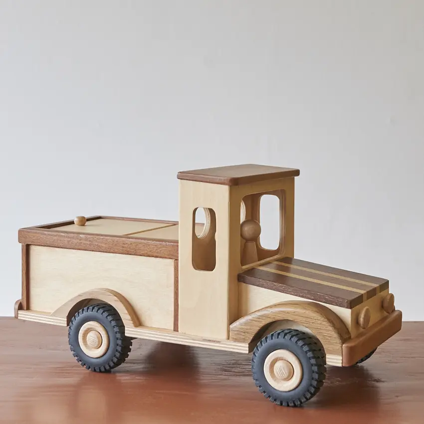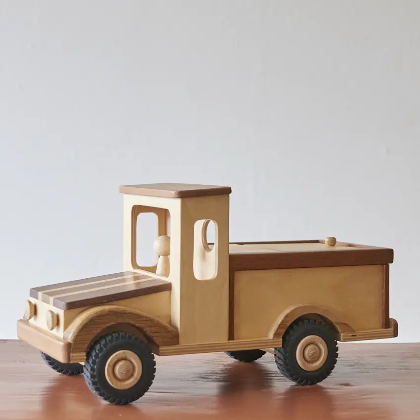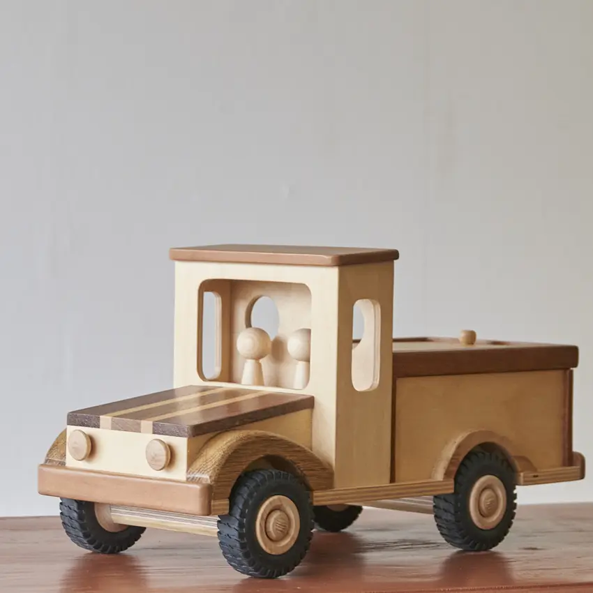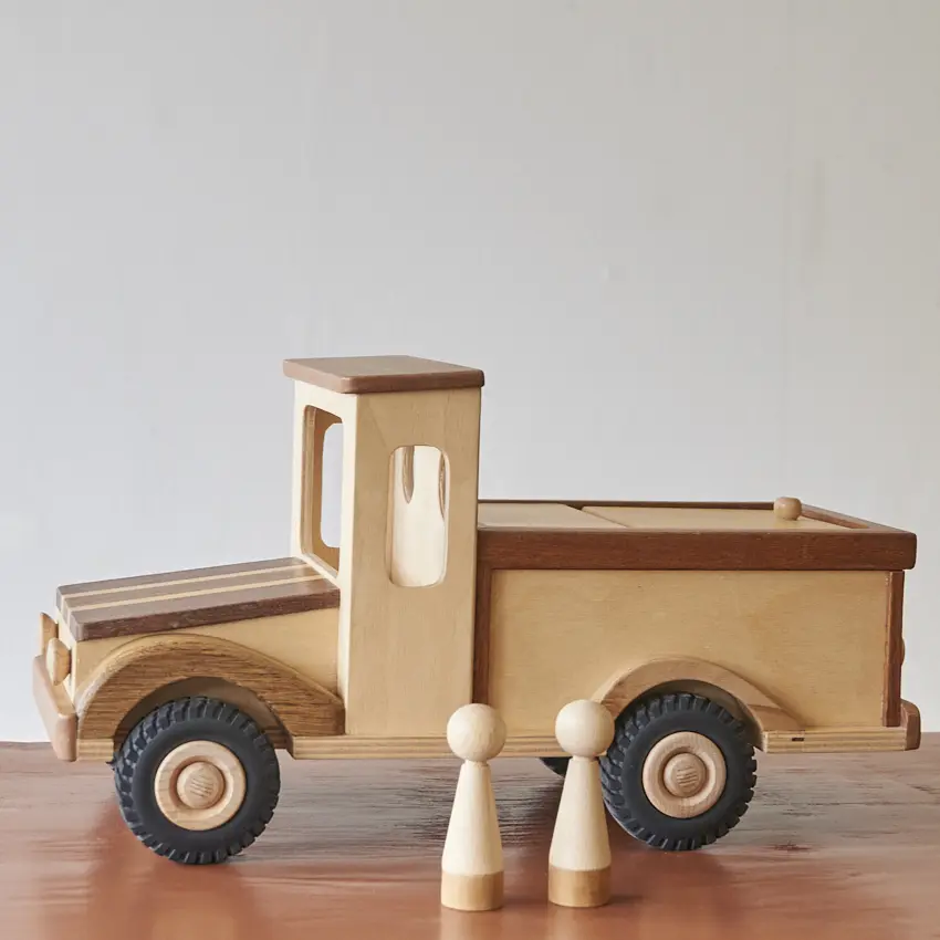 Een houten auto met laadklep én twee passagiers. Deze auto is goed voor uren speelplezier! De laadklep kan open en dicht en ook de poppetjes kunnen worden verplaatst. Deze auto is helemaal met de hand gemaakt door Henk. Hij kan gebruikt worden als speelauto maar ook gewoon als decoratie in de kast. De verschillende houtsoorten, mooie details en afwerking maakt het echt een unieke auto. Een speelgoedauto waar er maar 1 van is en die niemand anders heeft!