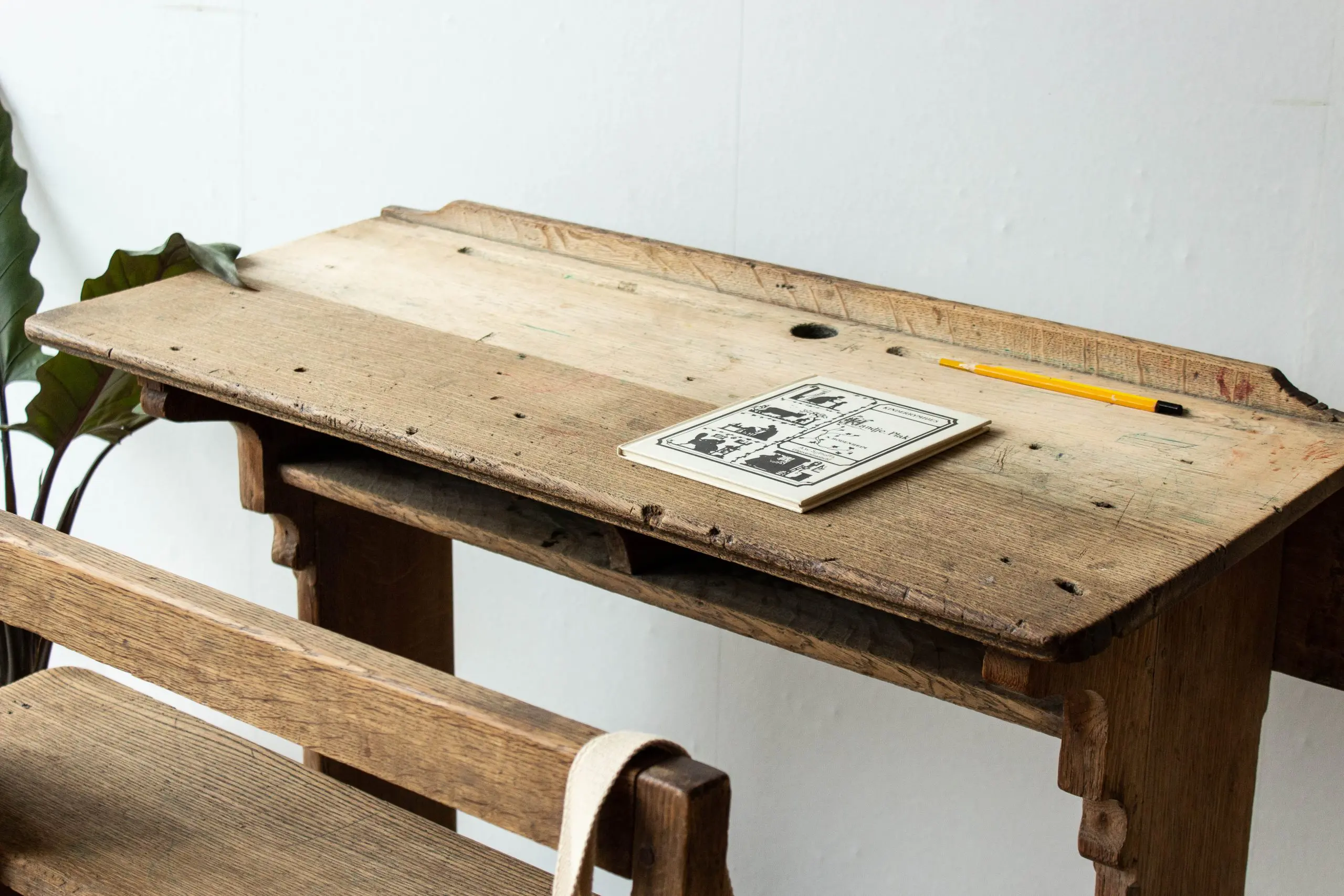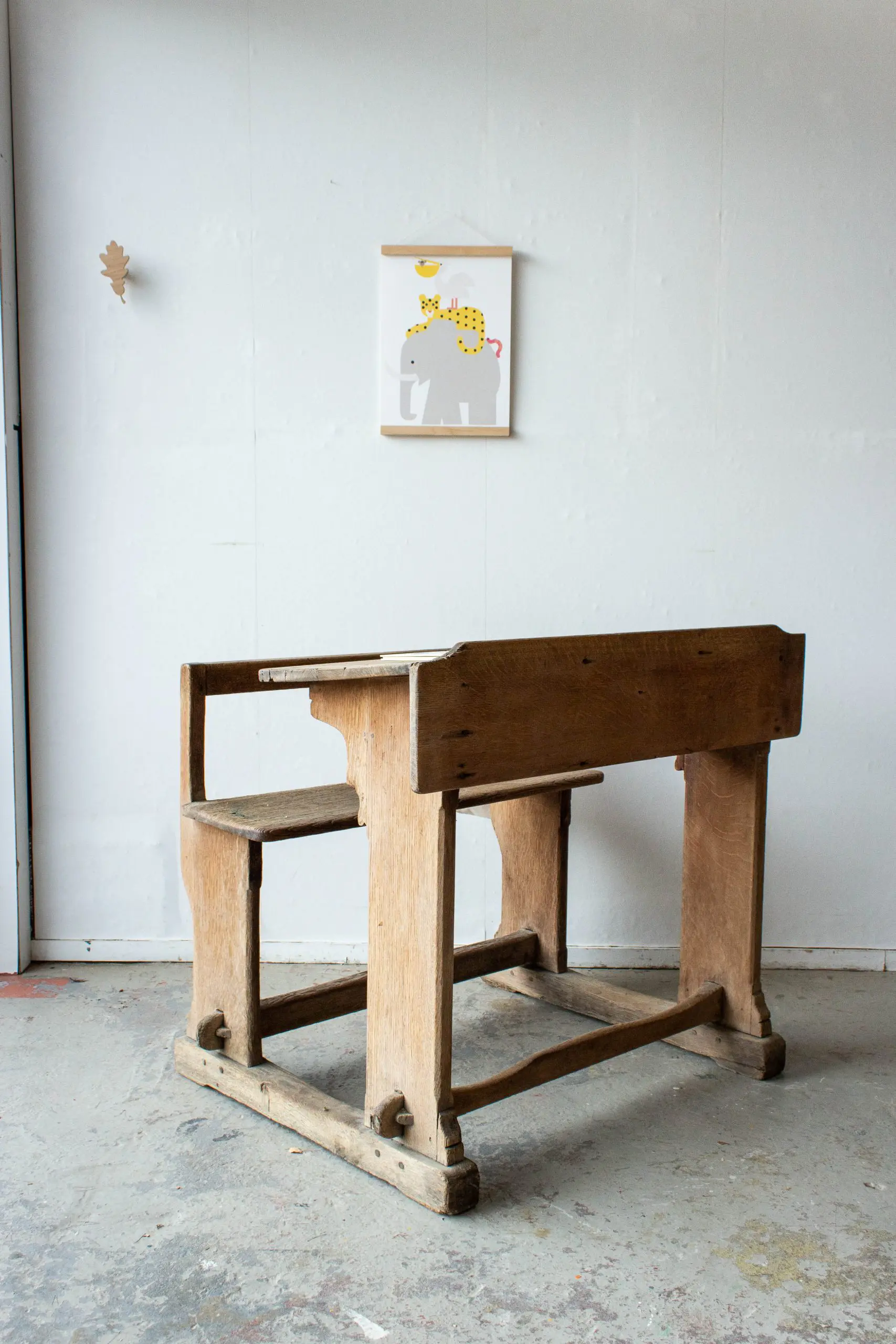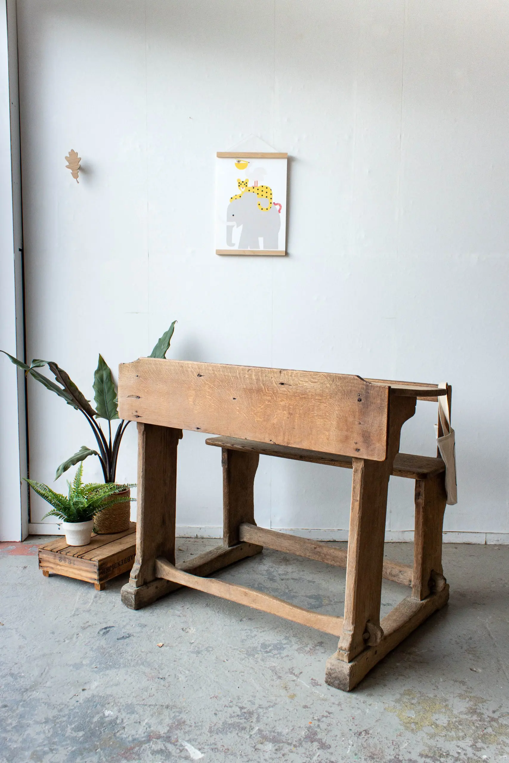 We weten niet precies hoe oud deze houten schoolbank, maar oud is ie wel! En mooi! We hebben deze Belgische schoolbank grondig schoongemaakt, want wat was hij vies! Nog steeds zijn er hier en daar nog wat stift strepen en gekras zichtbaar. Deze kregen we niet weg. Maar dat geeft de schoolbank ook juist zijn charme! Heel leuk om in de kinderkamer of kinderhoek neer te zetten. Want het is een ideale tafel om heerlijk aan te tekenen of knutselen. En de opbergruimte onder het werkblad is natuurlijk ook handig. Hier kan een boel teken- en knutselspul in opgeborgen worden. Helemaal klaar voor gebruik!