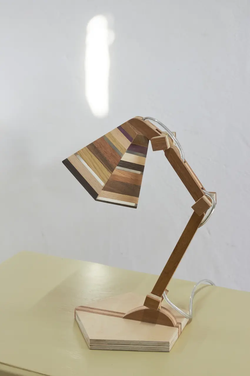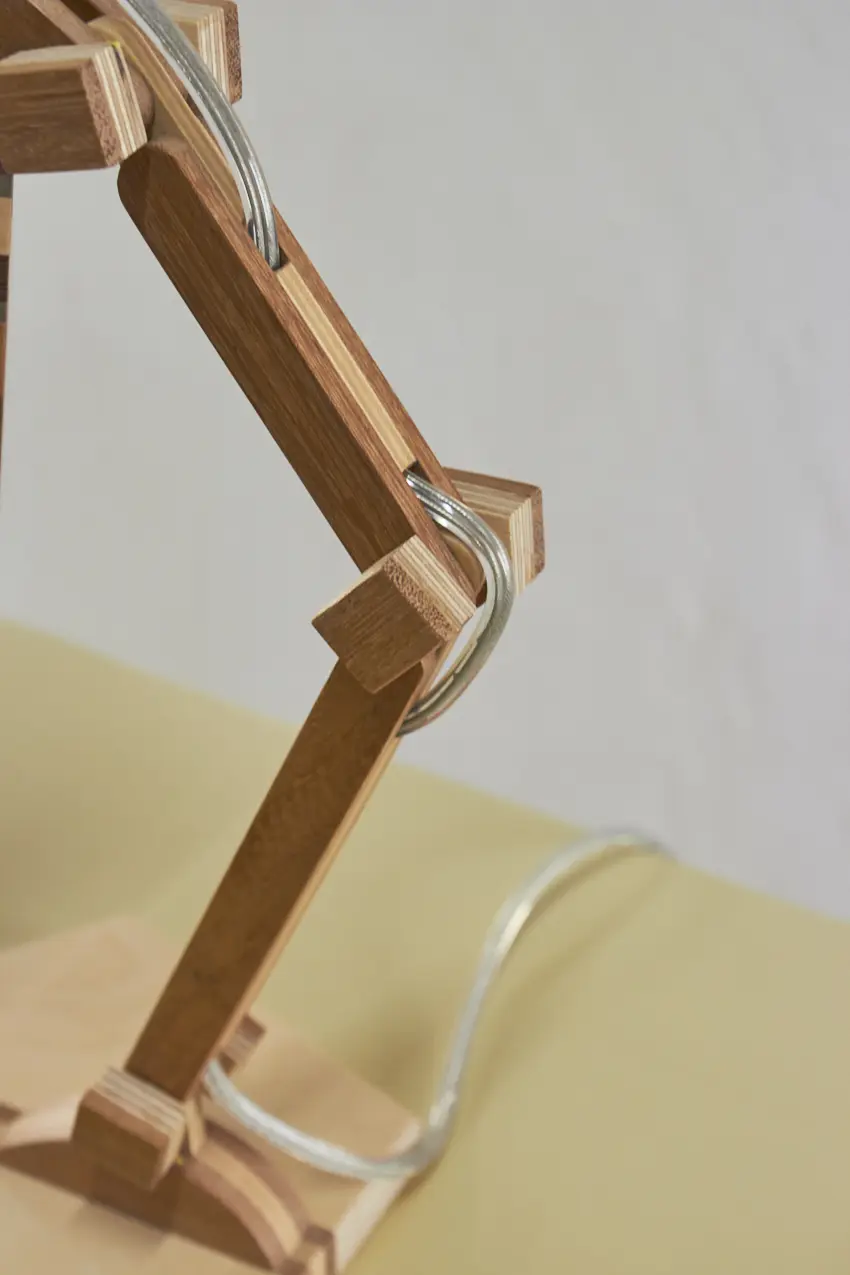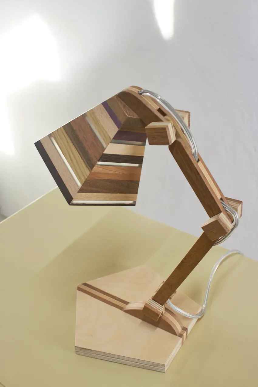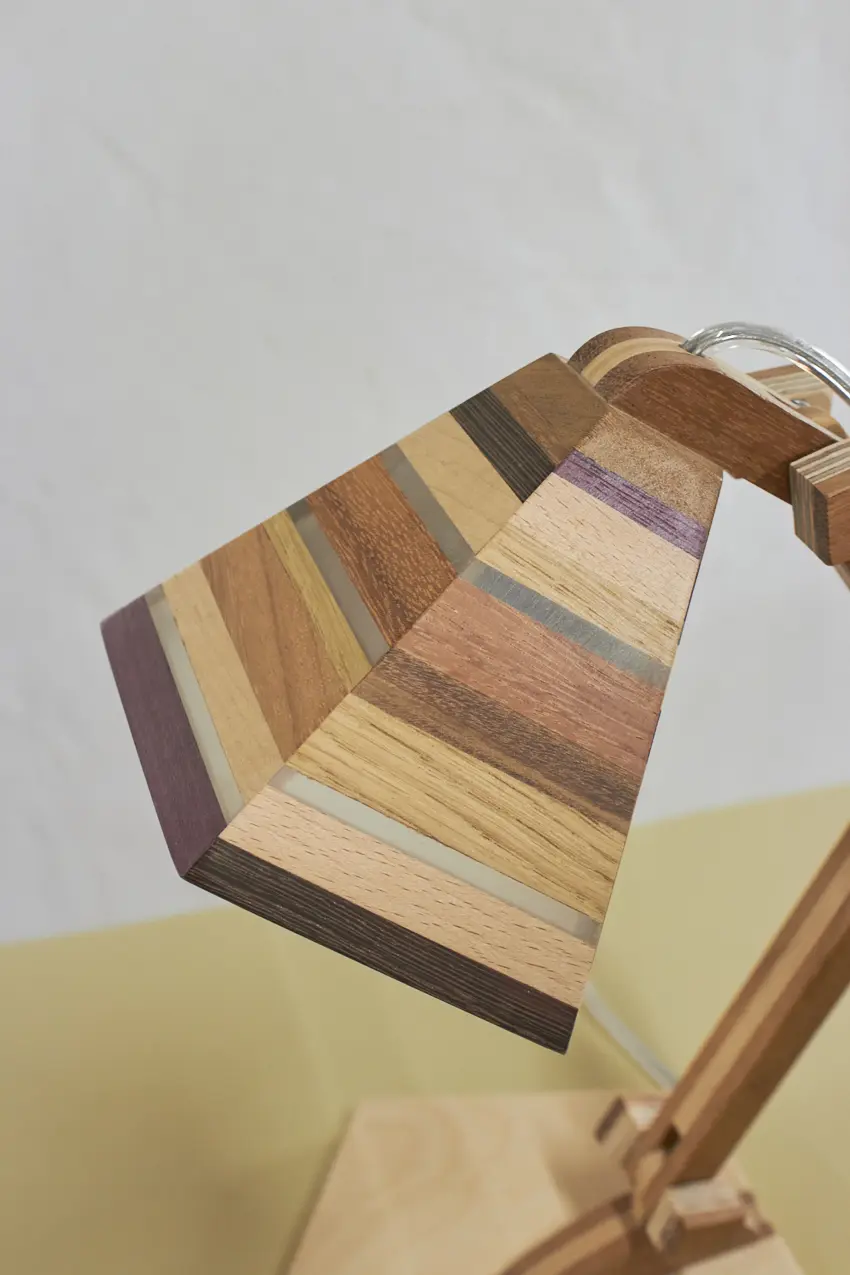 Dit prachtige lampje is met de hand gemaakt door Henk. Hij is helemaal gemaakt van verschillende soorten hout. Als je goed kijkt zie je dat er in het kapje ook transparante strips zijn verwerkt, waar het licht mooi doorheen schijnt als de lamp aan staat. Wat een mooi, speels lampje! Hij kan eigenlijk overal in huis wel staan. Op je nachtkastje, op een tafeltje naast de bank om ’s avonds onder te lezen of op een bureautje in de kinderkamer. Hij is verstelbaar, is voorzien van een lichtbron en een aan&uit schakelaar en het transparante snoer is mooi verwerkt. Een prachtige lamp om in huis te hebben, ook als hij niet aan staat.