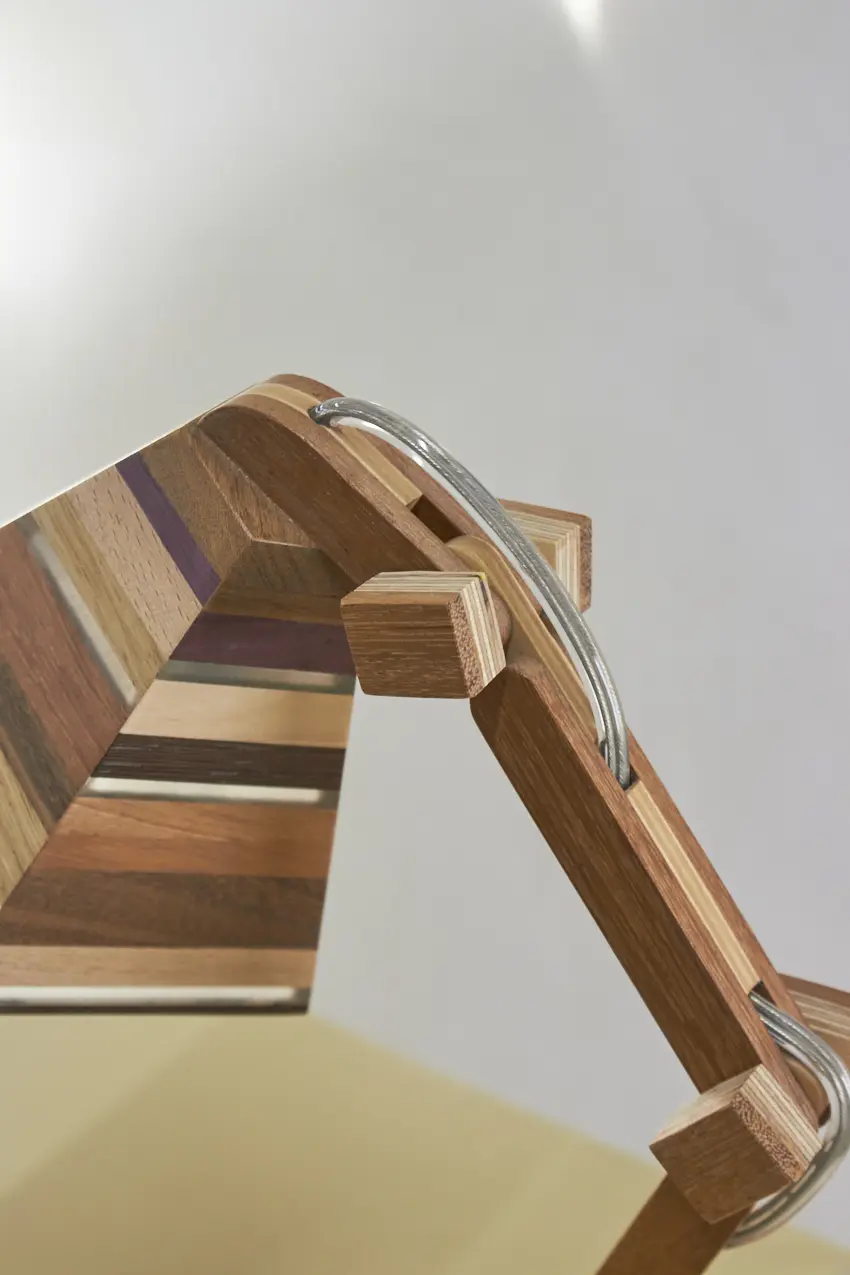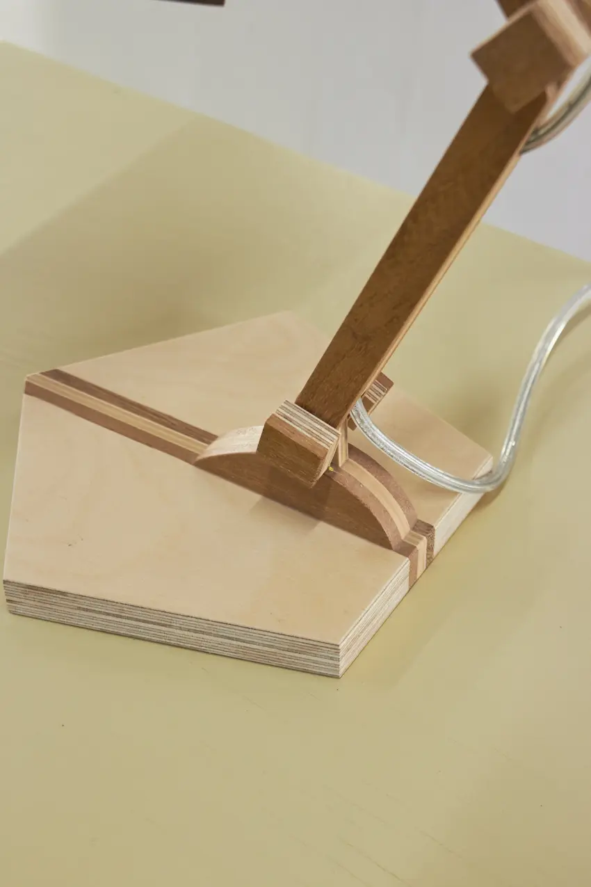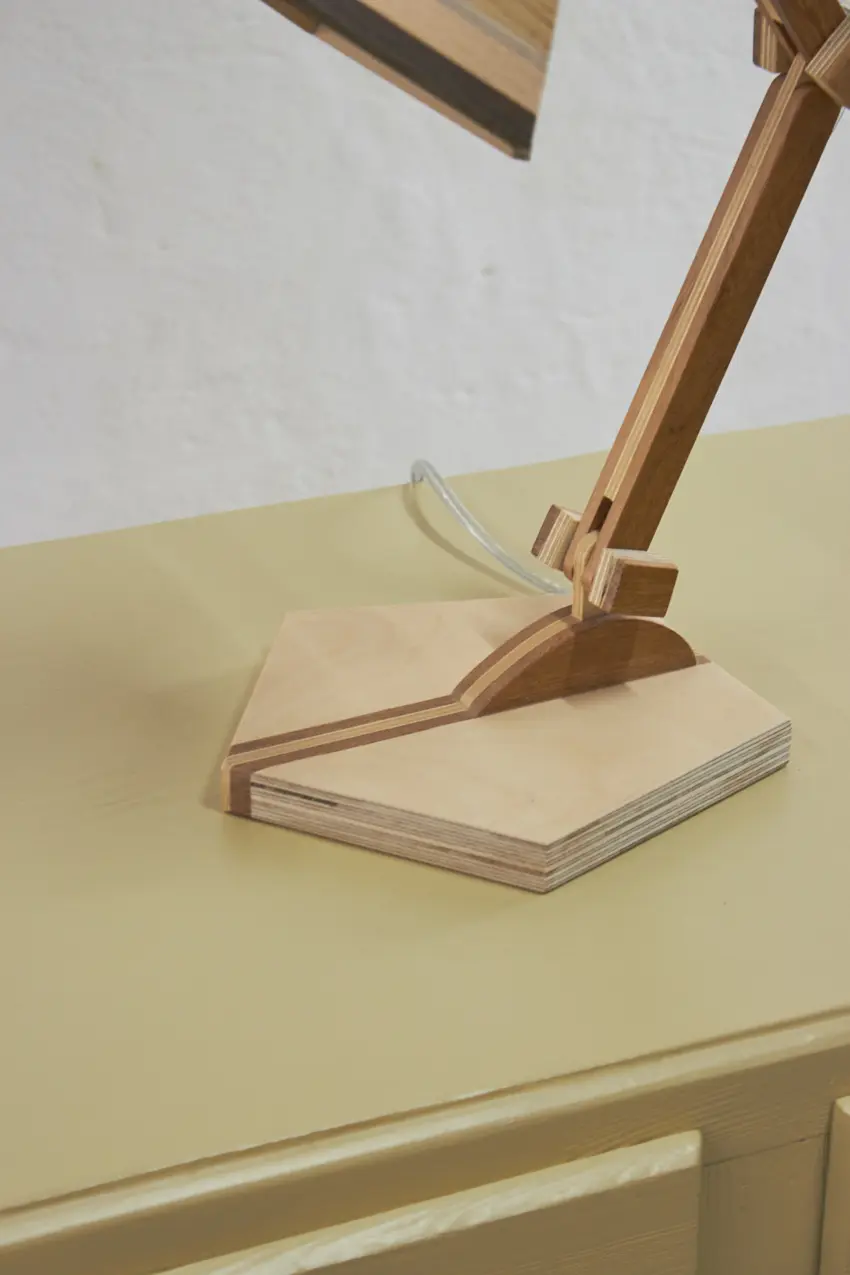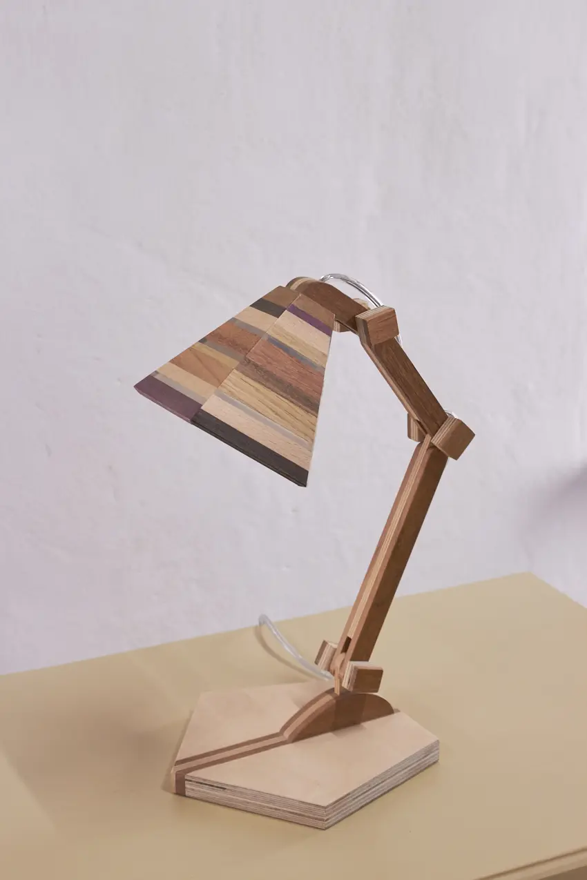 Dit prachtige lampje is met de hand gemaakt door Henk. Hij is helemaal gemaakt van verschillende soorten hout. Als je goed kijkt zie je dat er in het kapje ook transparante strips zijn verwerkt, waar het licht mooi doorheen schijnt als de lamp aan staat. Wat een mooi, speels lampje! Hij kan eigenlijk overal in huis wel staan. Op je nachtkastje, op een tafeltje naast de bank om ’s avonds onder te lezen of op een bureautje in de kinderkamer. Hij is verstelbaar, is voorzien van een lichtbron en een aan&uit schakelaar en het transparante snoer is mooi verwerkt. Een prachtige lamp om in huis te hebben, ook als hij niet aan staat.