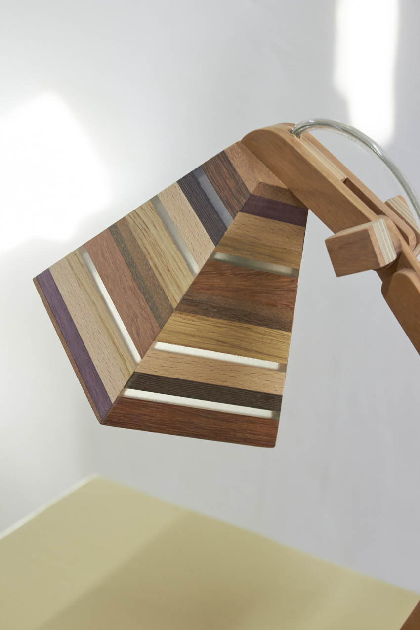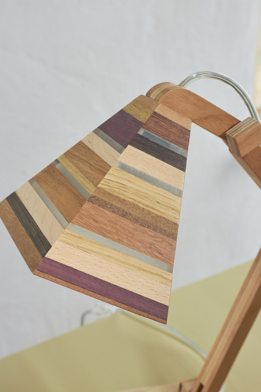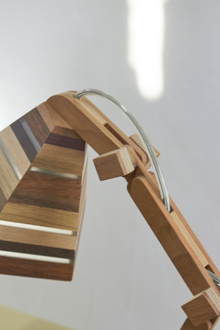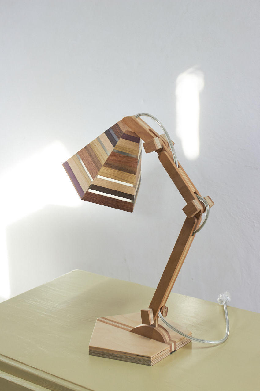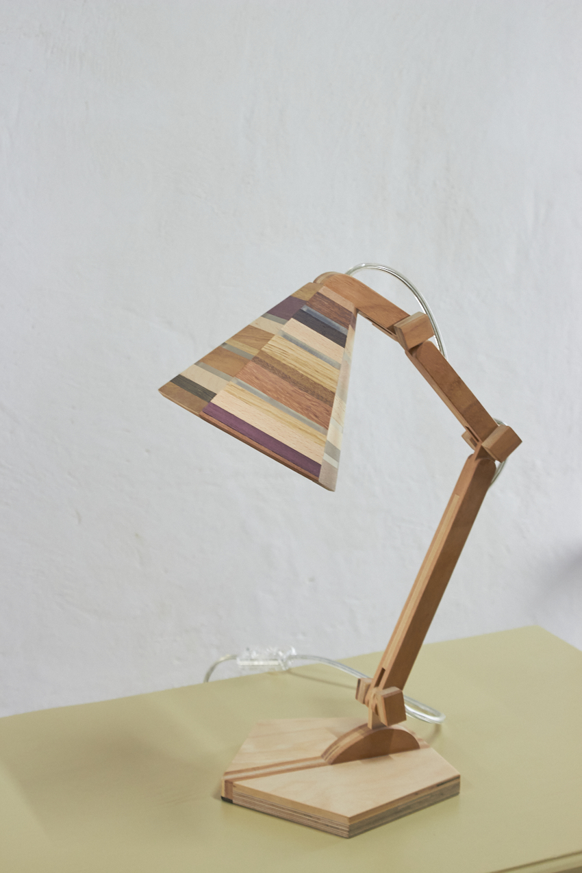 Dit prachtige lampje is met de hand gemaakt door Henk. Hij is helemaal gemaakt van verschillende soorten hout. Als je goed kijkt zie je dat er in het kapje ook transparante strips zijn verwerkt, waar het licht mooi doorheen schijnt als de lamp aan staat. Wat een mooi, speels lampje! Hij kan eigenlijk overal in huis wel staan. Op je nachtkastje, op een tafeltje naast de bank om ’s avonds onder te lezen of op een bureautje in de kinderkamer. Hij is verstelbaar, is voorzien van een lichtbron en een aan&uit schakelaar en het transparante snoer is mooi verwerkt. Een prachtige lamp om in huis te hebben, ook als hij niet aan staat.