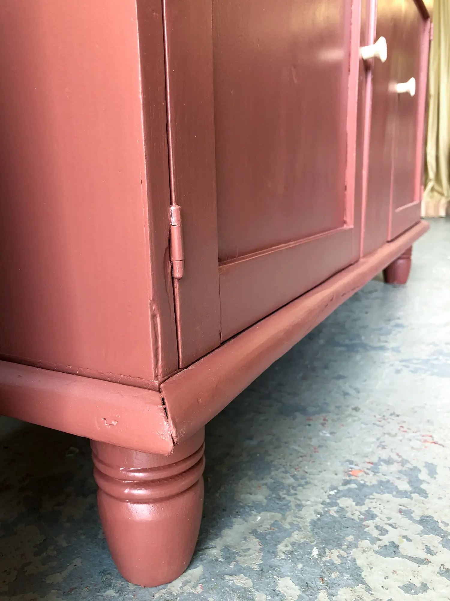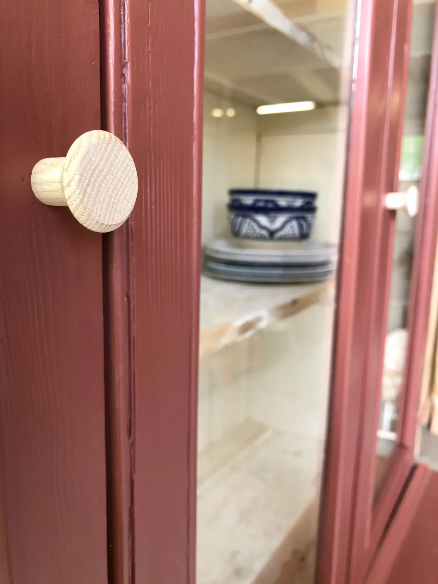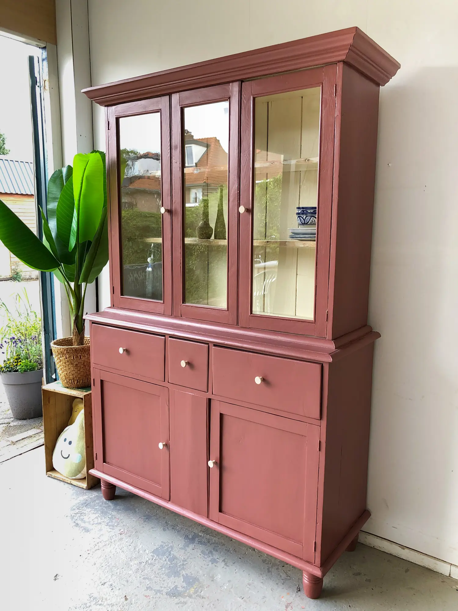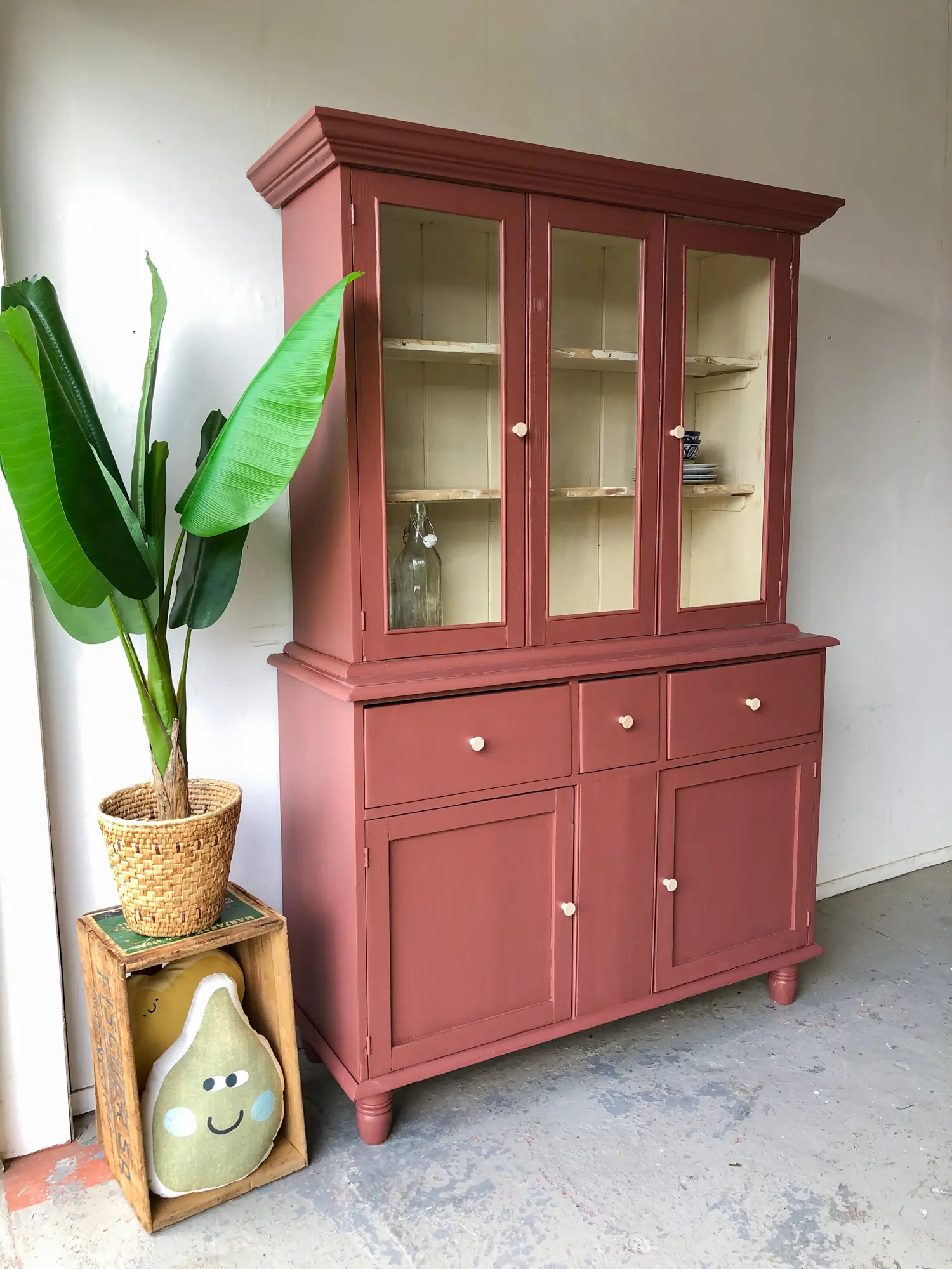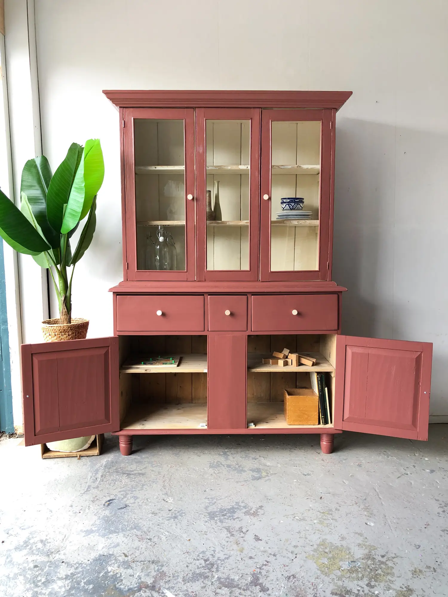Een prachtige buffetkast uit Engeland! Een ideale kast voor het hele gezin! Onderin is er genoeg ruimte voor speelgoed en spelletjes. Bovenin is er plek voor een mooi servies. Toen we deze buffetkast binnnen kregen was hij zowel van binnen (op de onderkast na) als buiten helemaal wit, de verf bladderde er van alle kanten af. De binnenkant van het bovendeel hebben we, na een grondige schoonmaak beurt, zo gelaten. Wel zijn de planken goed opgeschuurd, zodat deze weer glad aanvoelen. Alle deurtjes zijn nagelopen, er klemde het een en ander, en zo ook de laatjes. Hoe leuk het kleine laatje in het midden! Het middelste ruitje bovenin is geen deurtje, links en rechts kunnen gewoon open en dicht. Alle deurtjes sluiten doormiddel van een magneetje. Na het nodige schoonmaakwerk, reparaties en antiehoutworm, hebben we er voor gekozen de buffetkast in deze warme karmozijnrode kleur te schilderen. De combinatie van de witte binnenkant en de essenhouten knoppen met de warme kleur is wat ons betreft erg fraai.