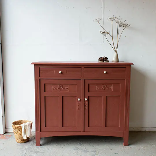 Deze prachtige vintage commode met houtsnijwerk komt uit Noord Frankrijk. We hebben hem grondig schoongemaakt en helemaal nagelopen. De lieve strikjes op de deuren maken het kastje heel sierlijk en speels. Een warme herfstkleur leek ons hier heel mooi bij staan en daarom hebben we hem in deze prachtige karmozijnrode kleur geschilderd. De deuren en laatjes zijn tot slot afgewerkt met sierlijke knopjes van porselein. Wat is ie mooi geworden! De deuren sluiten door middel van een haakje en een magneetje. Wat ons betreft een geweldige commode voor op de babykamer, en helemaal klaar voor gebruik!