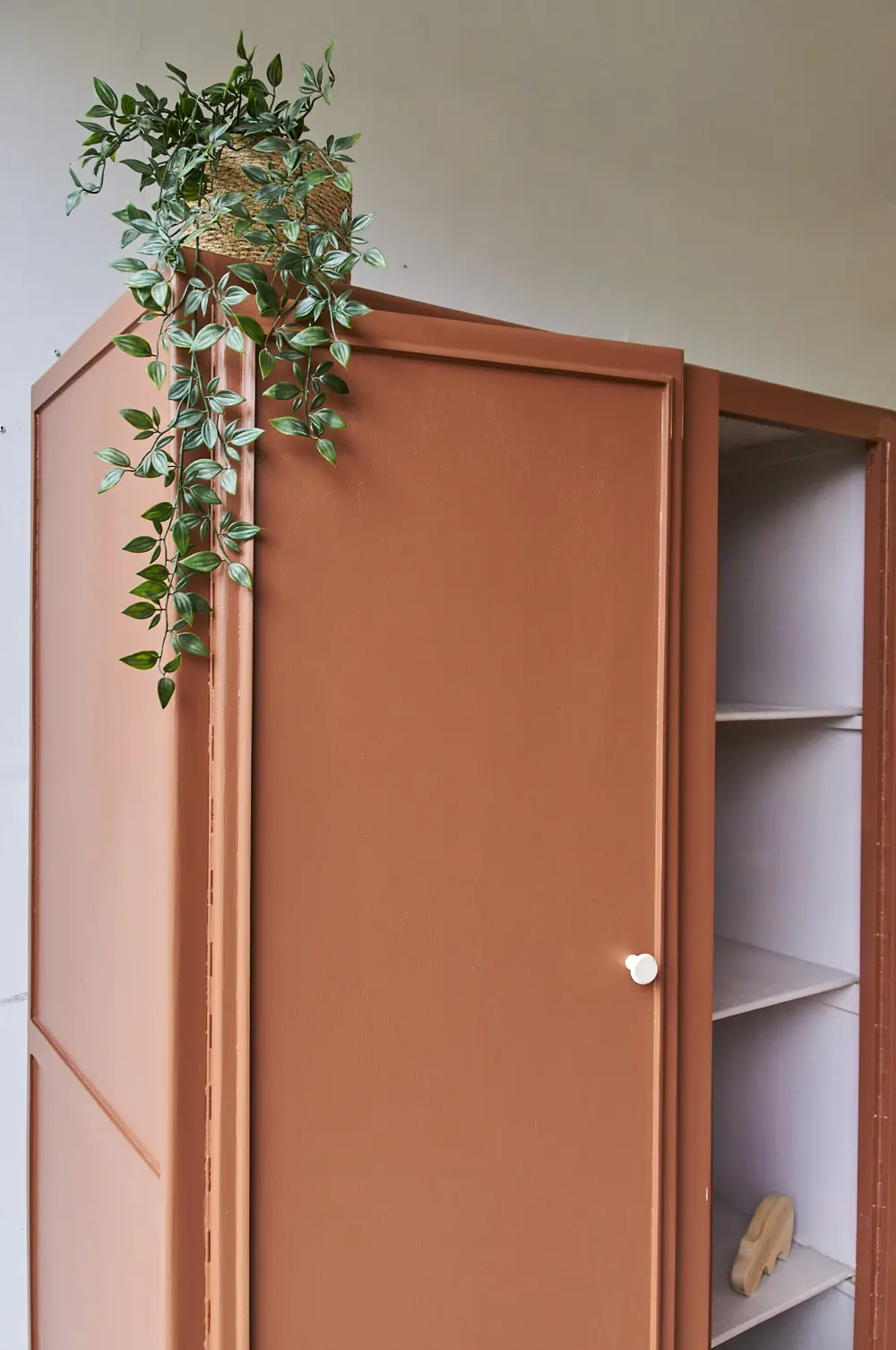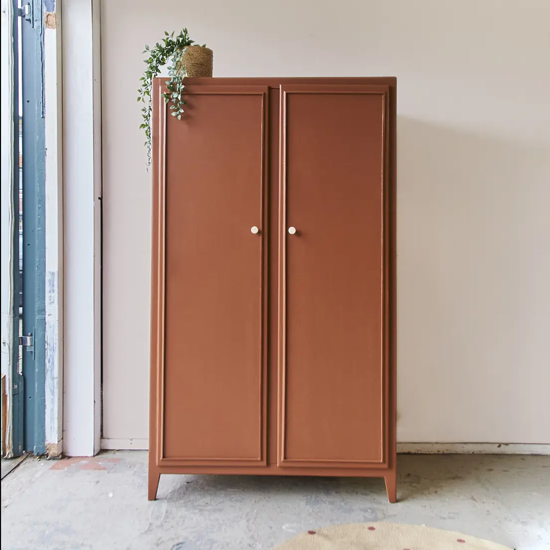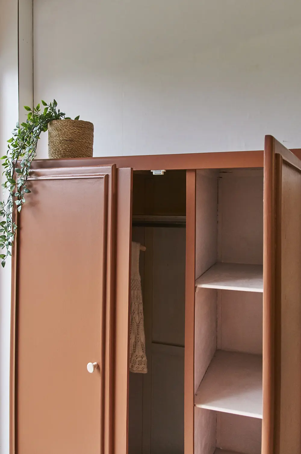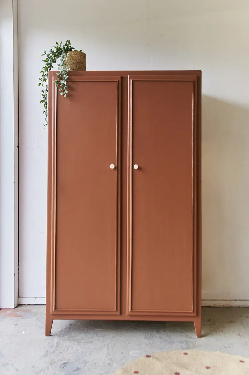 Wat een leuke kast is dit. Wij worden zelf altijd heel blij van dit soort pootjes. Het maakt de kast meteen heel speels, in combinatie met de strakke lijnen op de deur is het een plaatje! Toen wij deze kast binnen kregen, zat de buitenkant helemaal onder het behang. Dat hebben we er natuurlijk helemaal afgehaald om hem vervolgens goed te kunnen schuren. De kast was aan de binnenkant al geschilderd in een hele lichtroze kleur. Dat vonden we heel mooi staan bij de kleur die wij de kast hebben gegeven, roest! Boven de roede hebben wij nog een klein plankje geplaatst. De deuren sluiten door middel van een magneetje en de knoppen zijn van essenhout. Kortom, de kast is helemaal klaar voor gebruik!