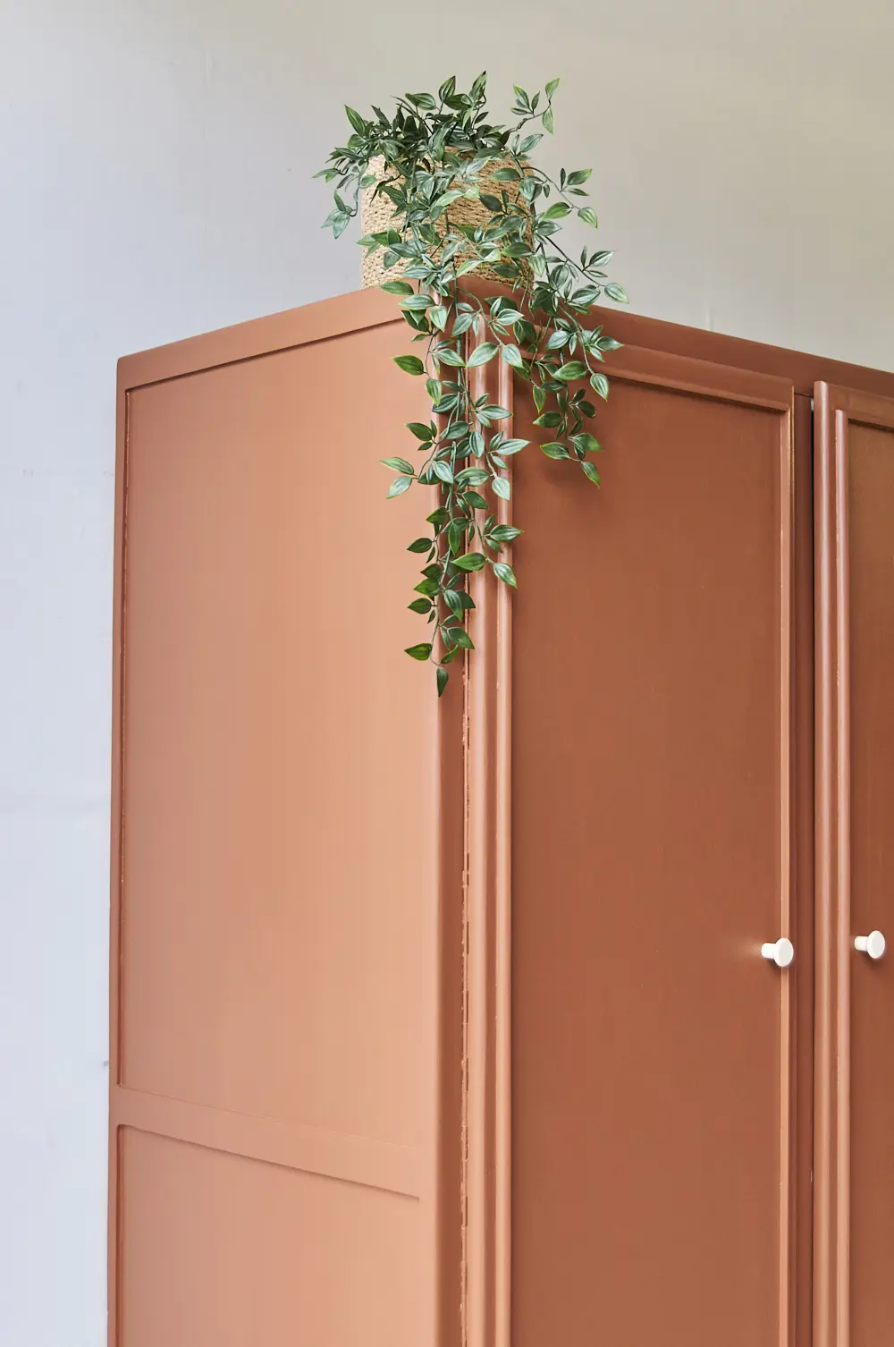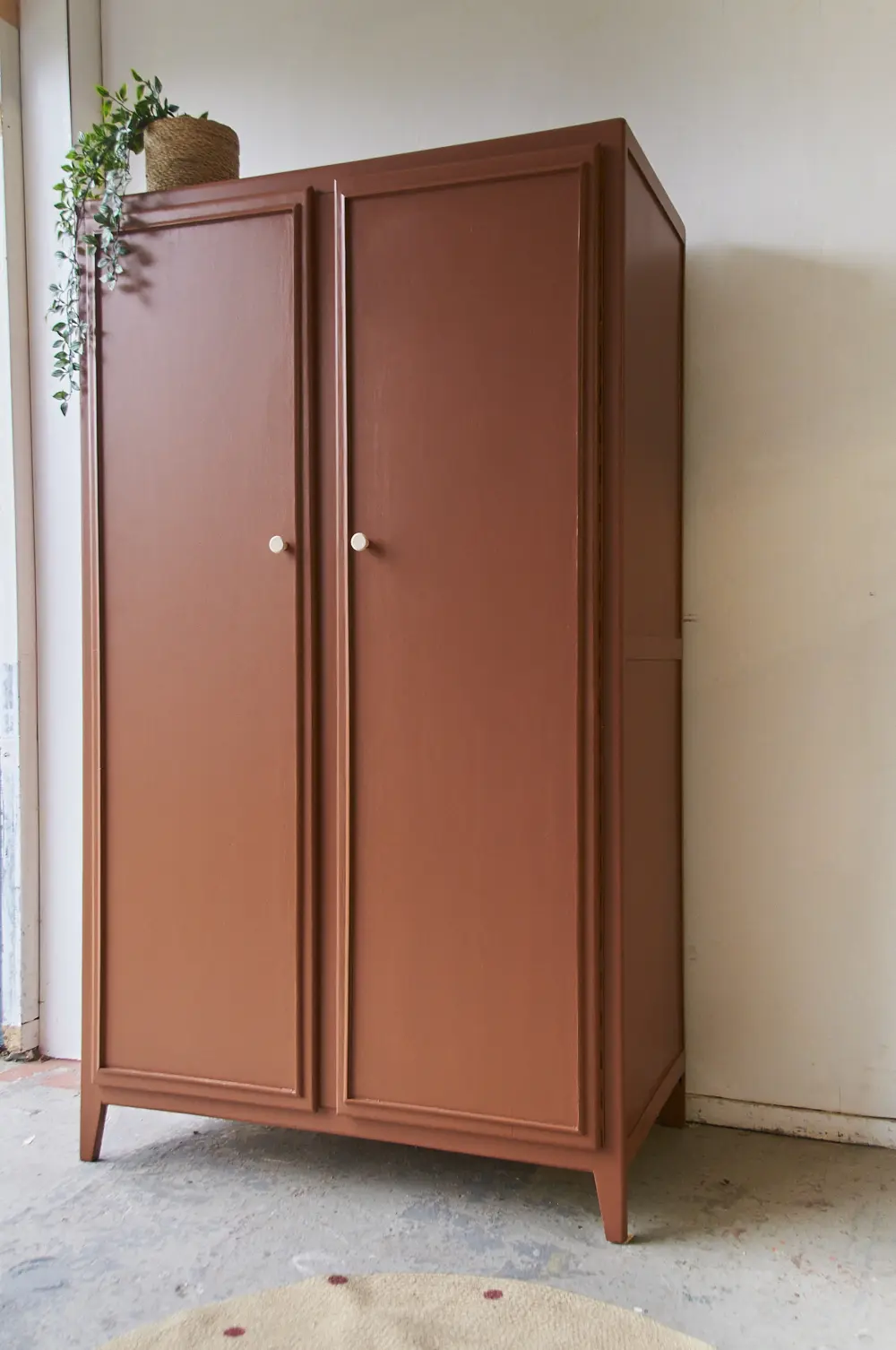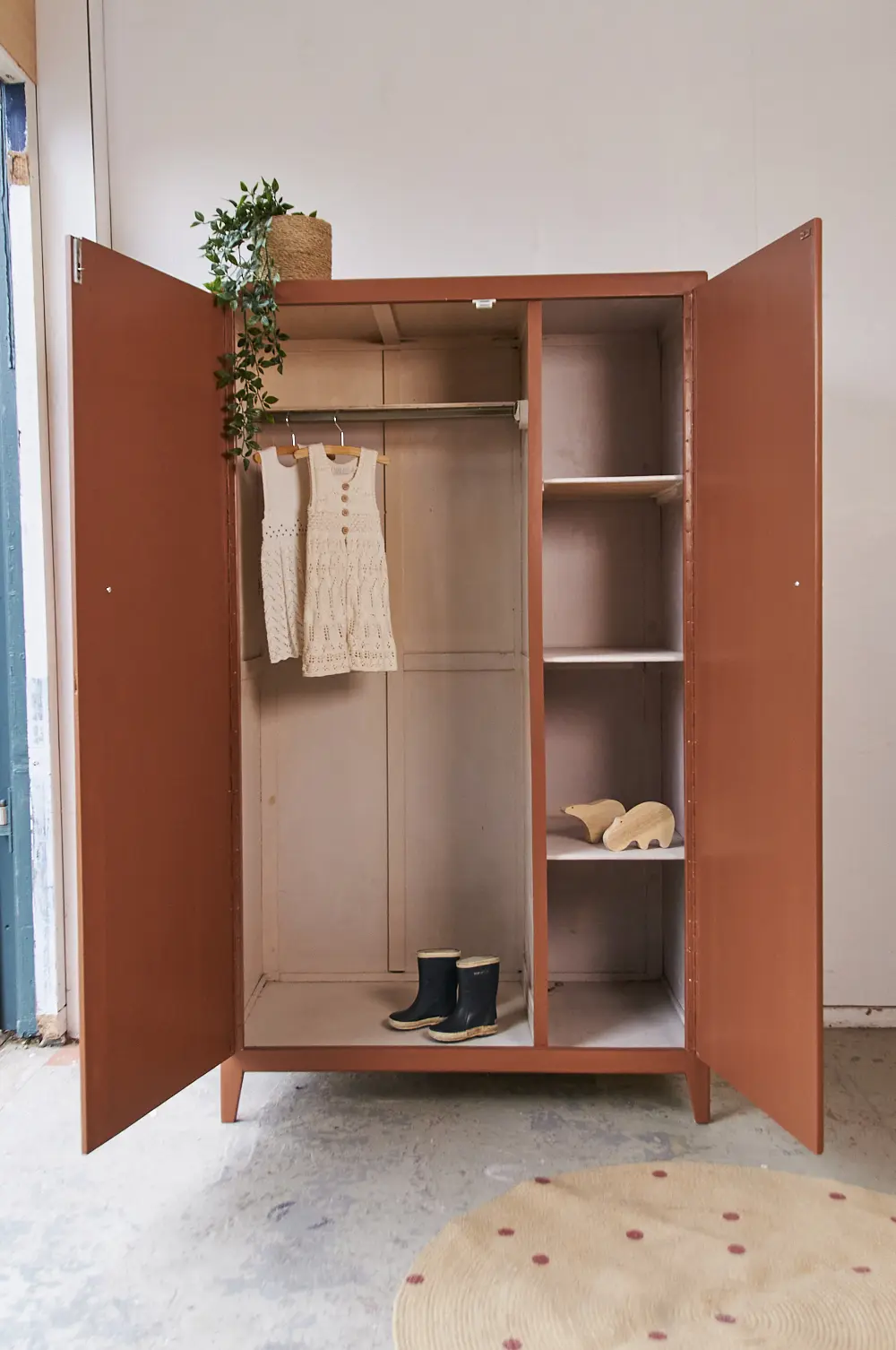 Wat een leuke kast is dit. Wij worden zelf altijd heel blij van dit soort pootjes. Het maakt de kast meteen heel speels, in combinatie met de strakke lijnen op de deur is het een plaatje! Toen wij deze kast binnen kregen, zat de buitenkant helemaal onder het behang. Dat hebben we er natuurlijk helemaal afgehaald om hem vervolgens goed te kunnen schuren. De kast was aan de binnenkant al geschilderd in een hele lichtroze kleur. Dat vonden we heel mooi staan bij de kleur die wij de kast hebben gegeven, roest! Boven de roede hebben wij nog een klein plankje geplaatst. De deuren sluiten door middel van een magneetje en de knoppen zijn van essenhout. Kortom, de kast is helemaal klaar voor gebruik!