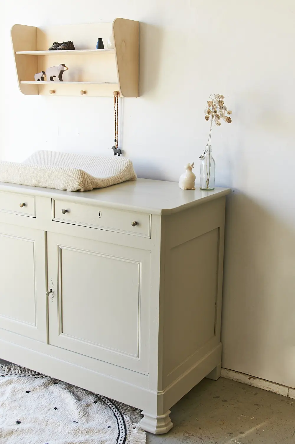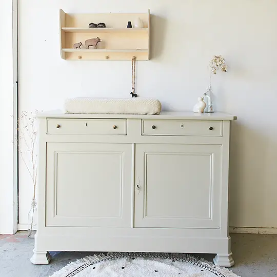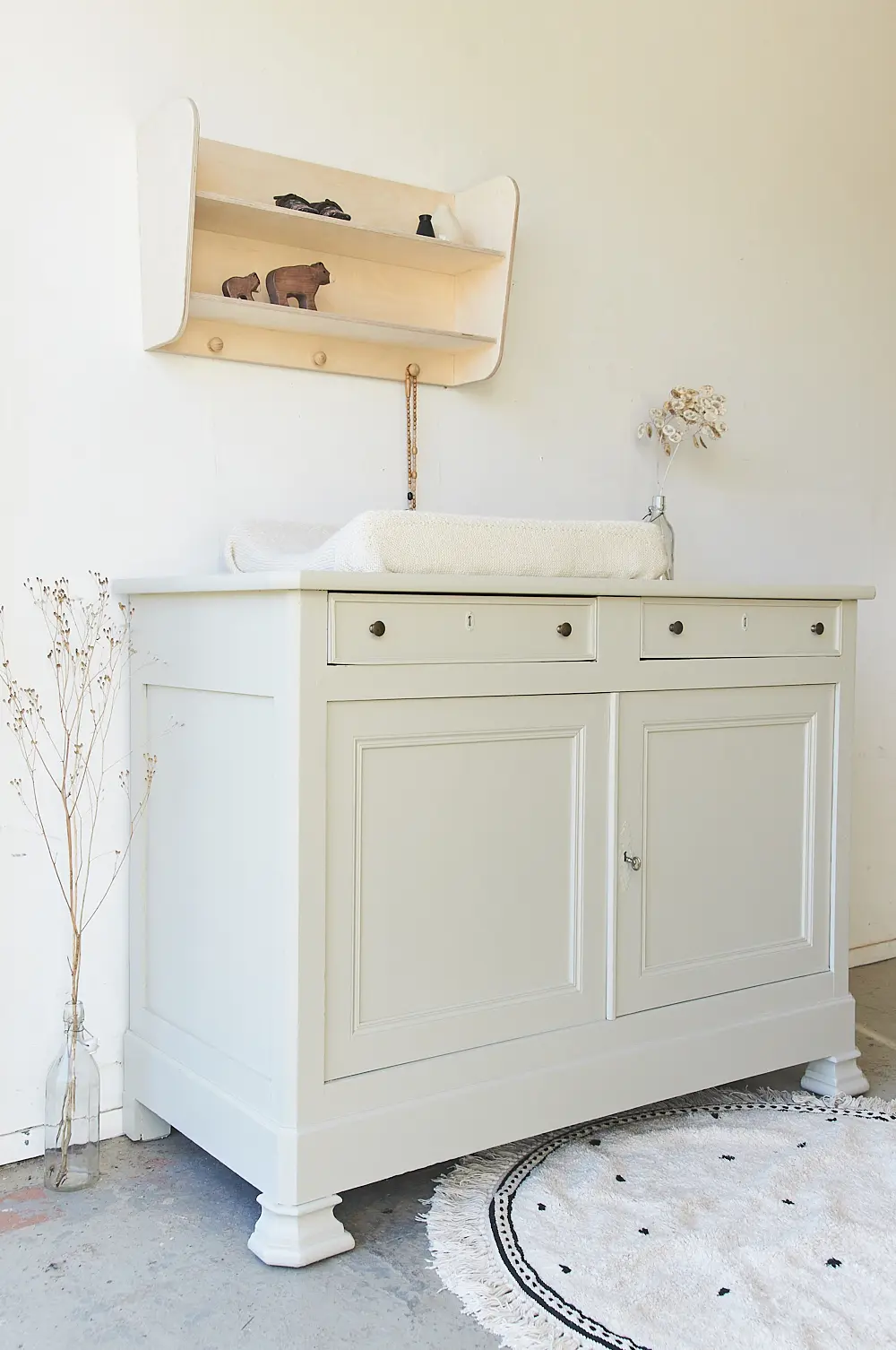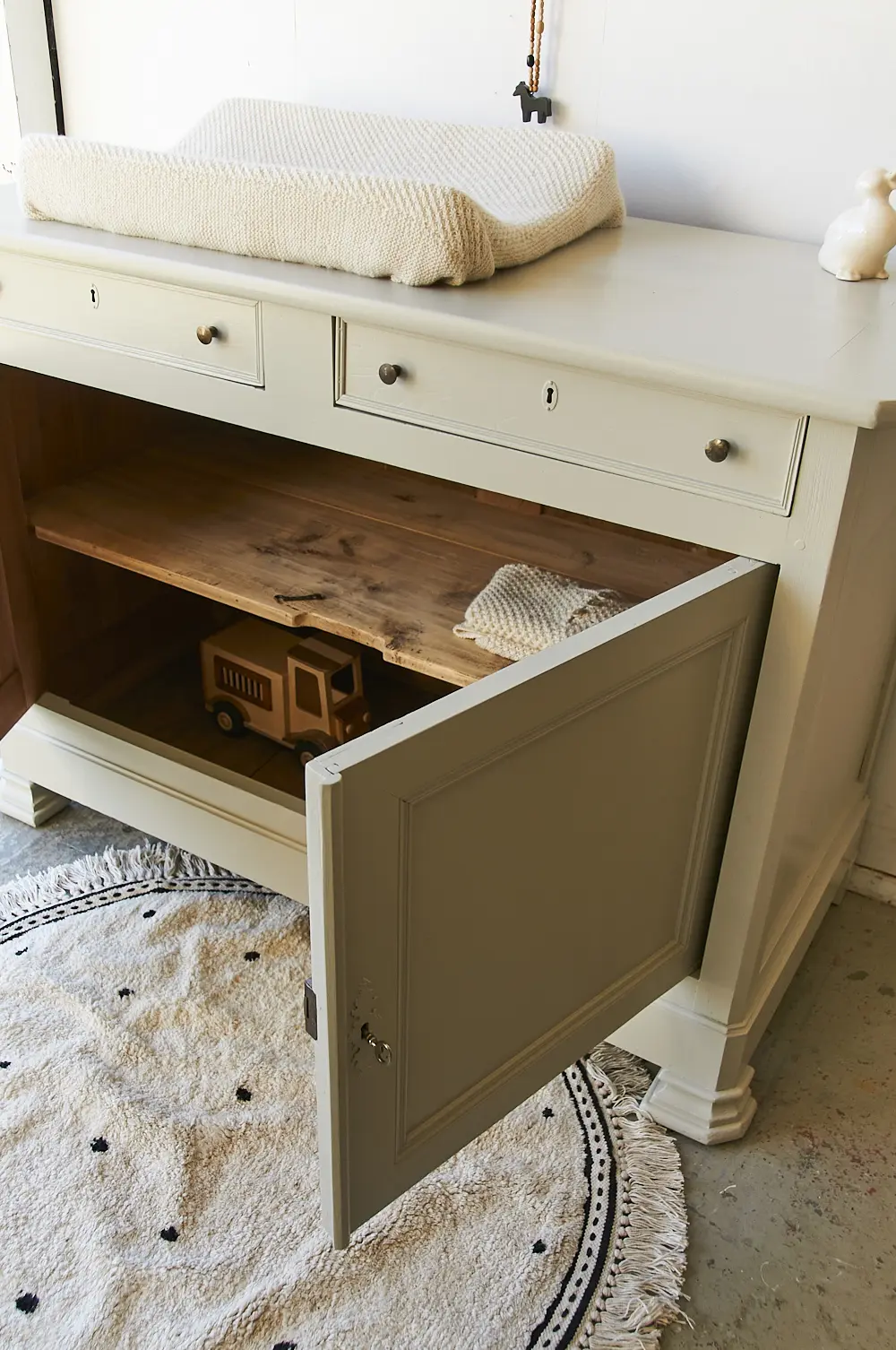 Wat een mooie, robuuste commode is dit. Zo fijn, er kan heel veel in! Deze commode komt uit midden Frankrijk. Het meubel is van prachtig, massief hout gemaakt. Van binnen heeft hij een brede plank, waar je heel veel bakken met kleertjes, luiers en andere spulletjes in kwijt kan. Dit meubel zou ook fantastisch staan in de woonkamer, ideaal om al het speelgoed in op te bergen! De commode is na het zandstralen grondig schoongemaakt en behandeld tegen houtworm. Vervolgens hebben we er voor gezorgd dat de lades niet meer klemmen en de deurtjes soepel open en dicht gaan. De plank die er in licht is licht opgeschuurd, zodat deze weer glad en splintervrij is. De commode hebben we in onze kleur linnen geschilderd en we hebben hem afgewerkt met bronzen knopjes. Een hele mooie combinatie vinden wij! De linker deur sluit door middel van een haakje en de rechterdeur sluit met de sleutel. Kortom, de commode is weer klaar voor een nieuwe plek! Het fijne wandplankje is ook bij ons te koop, klik HIER!