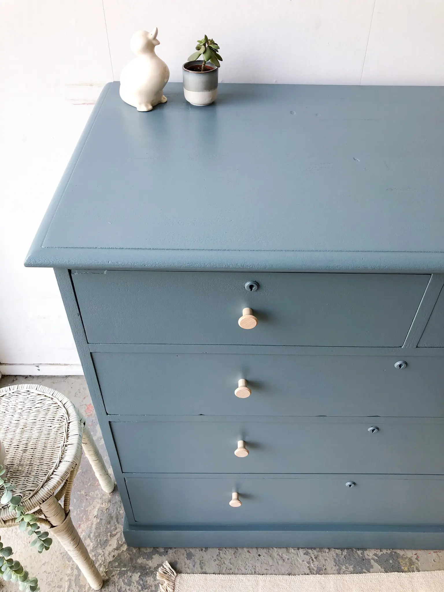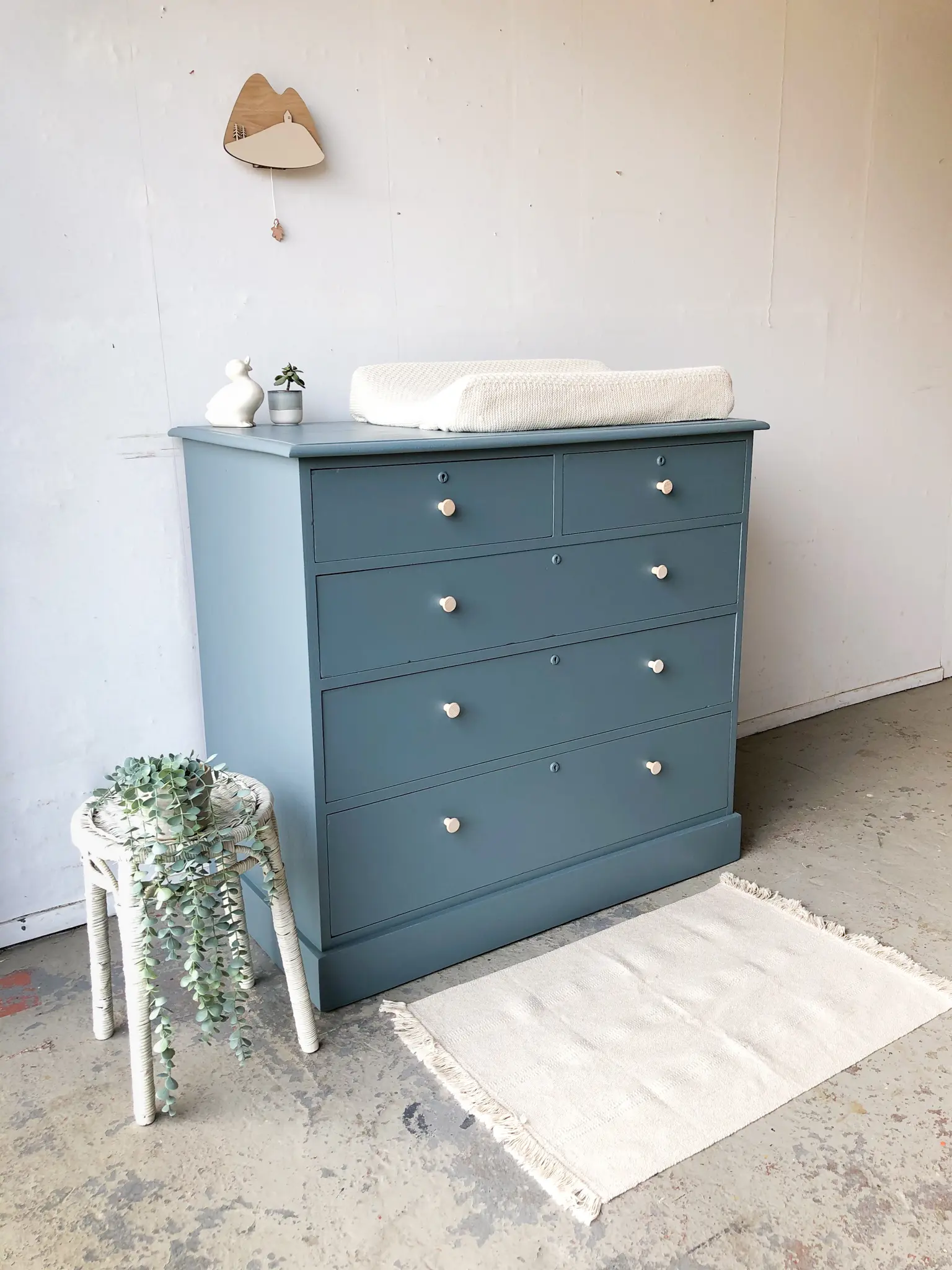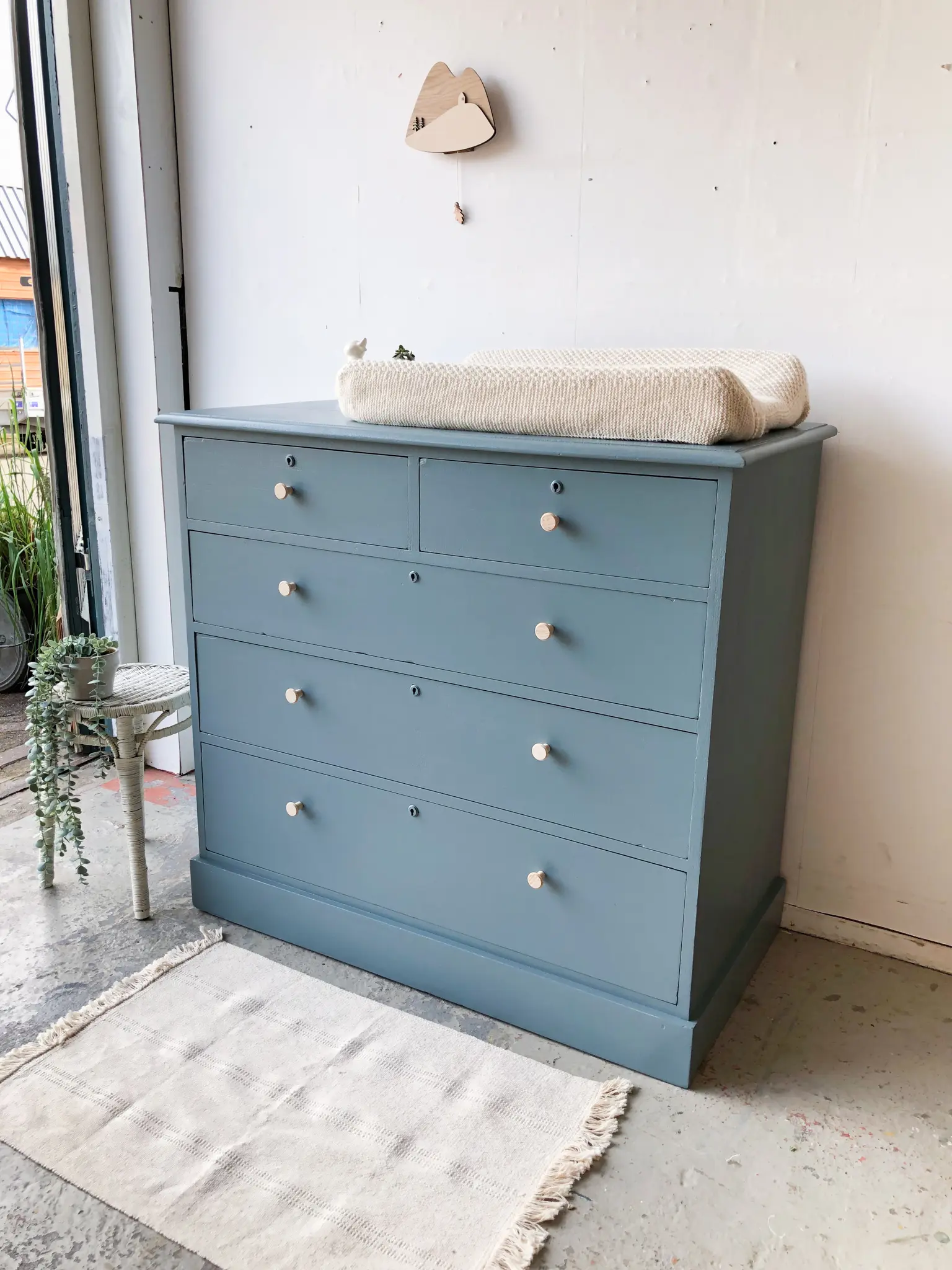 We hebben er weer eentje! Een ladencommode. Het strakke karakter van deze commode vonden we erg verfrissend naast al onze sierlijke meubels. Wat een plaatje. De lades zijn super handig, bovenin twee kleintjes en van boven naar onder worden ze steeds iets groter. Daar past een hele boel in! Na de grondige schoonmaakbeurt, nodige reparaties (alle lades lopen weer soepel) en dergelijke hebben we er voor gekozen de commode in deze warme grijzige blauw te schilderen. We hebben hem afgewerkt met essenhouten knoppen. Een mooie ruime commode voor op de babykamer!