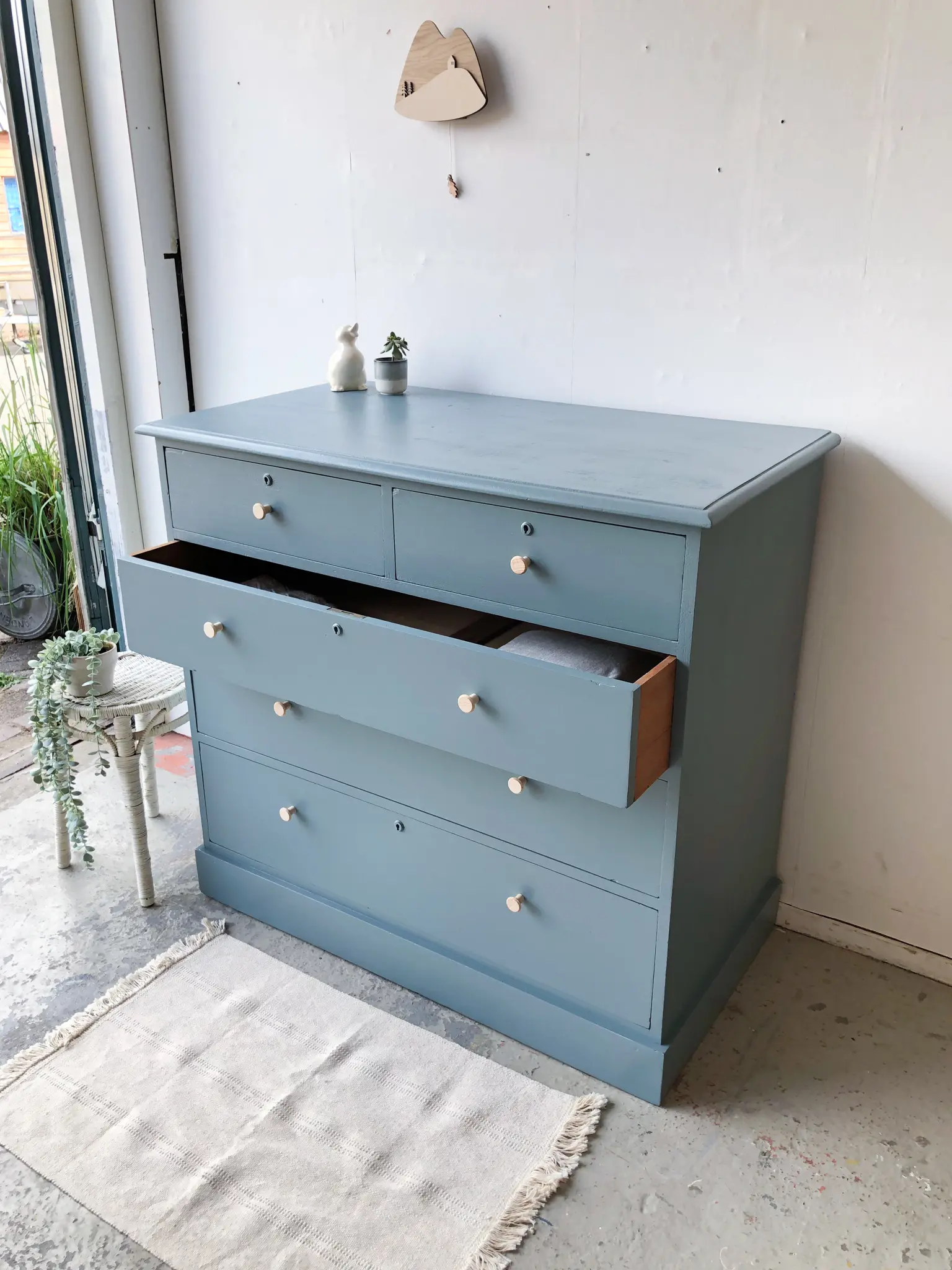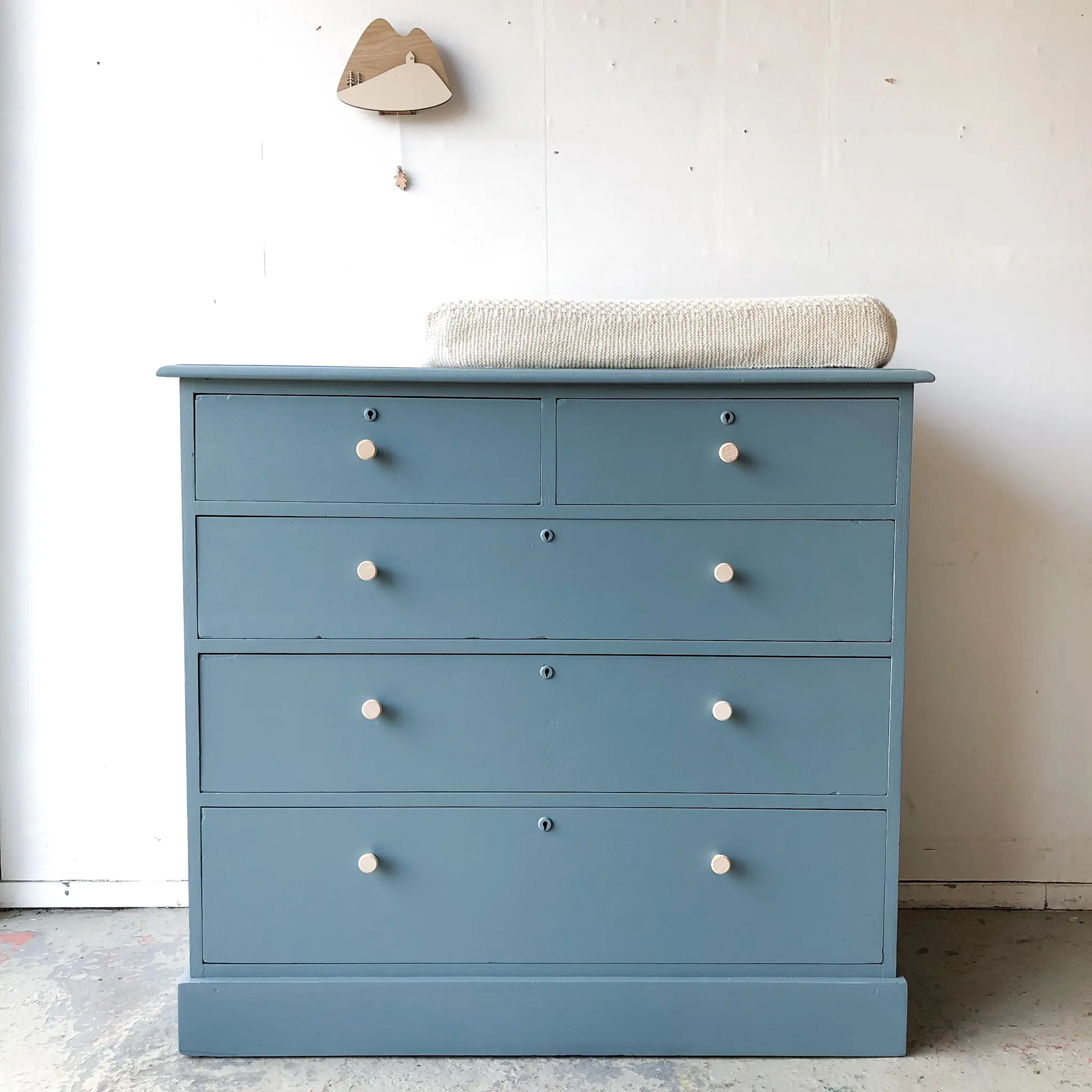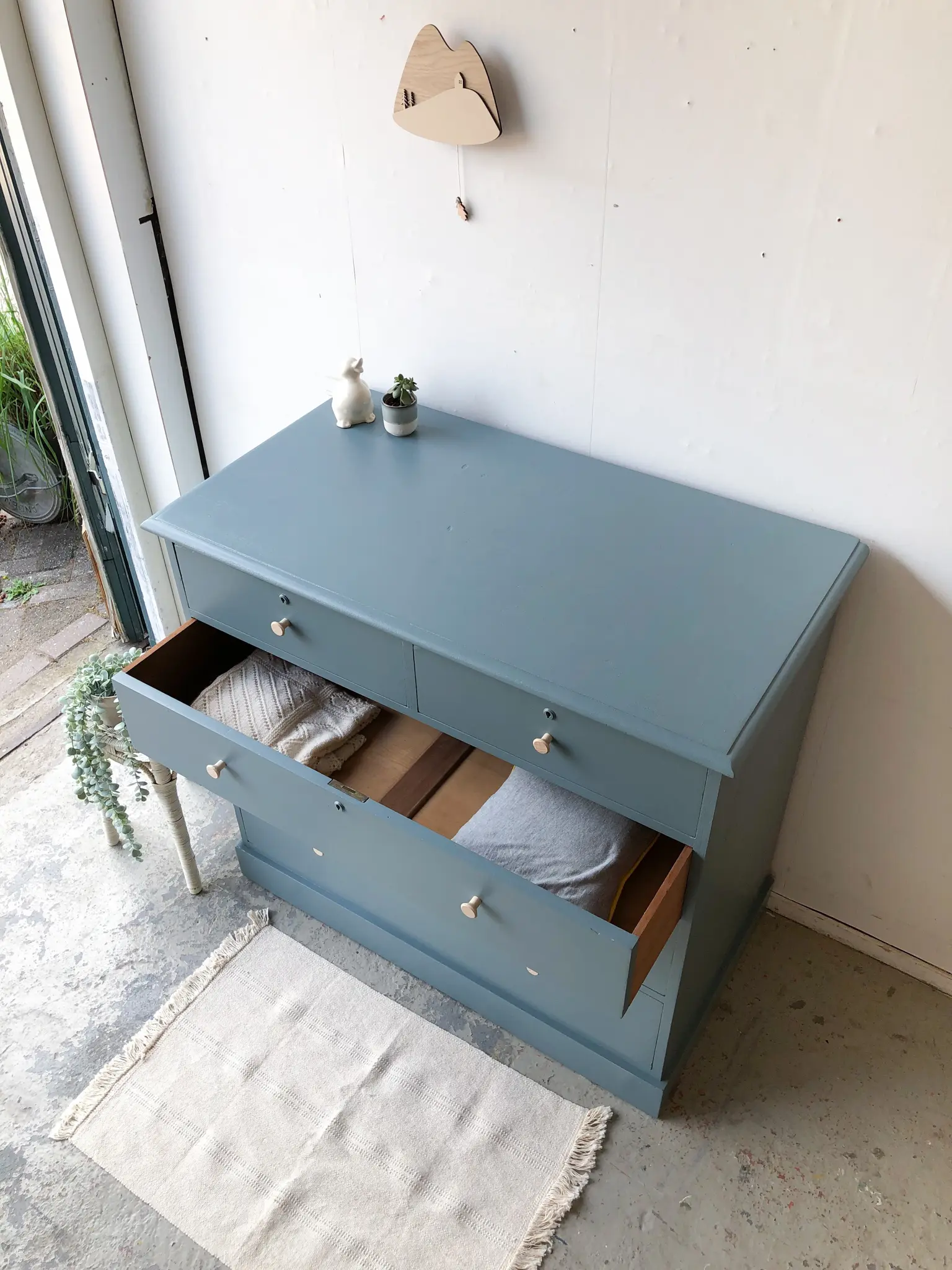 We hebben er weer eentje! Een ladencommode. Het strakke karakter van deze commode vonden we erg verfrissend naast al onze sierlijke meubels. Wat een plaatje. De lades zijn super handig, bovenin twee kleintjes en van boven naar onder worden ze steeds iets groter. Daar past een hele boel in! Na de grondige schoonmaakbeurt, nodige reparaties (alle lades lopen weer soepel) en dergelijke hebben we er voor gekozen de commode in deze warme grijzige blauw te schilderen. We hebben hem afgewerkt met essenhouten knoppen. Een mooie ruime commode voor op de babykamer!
