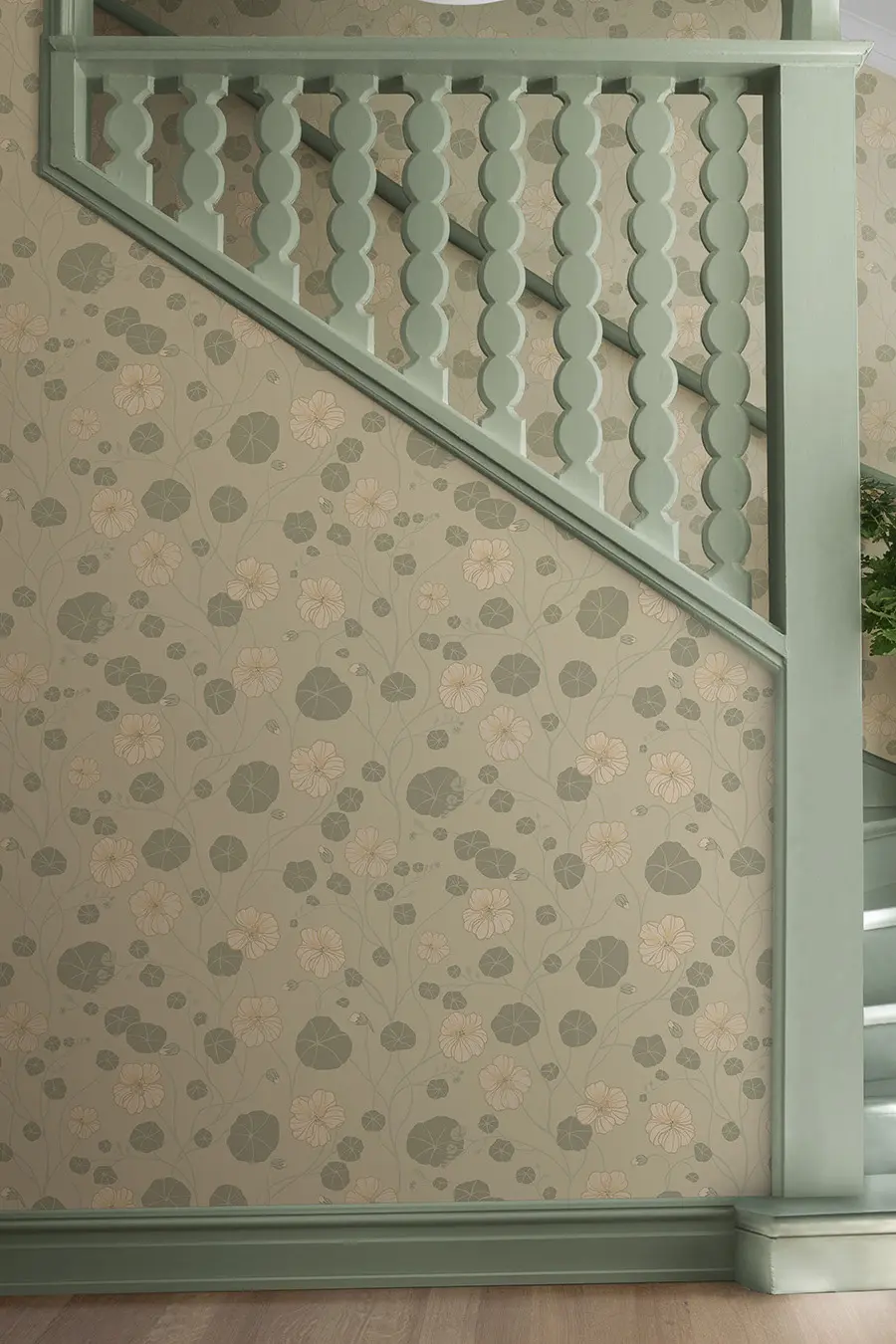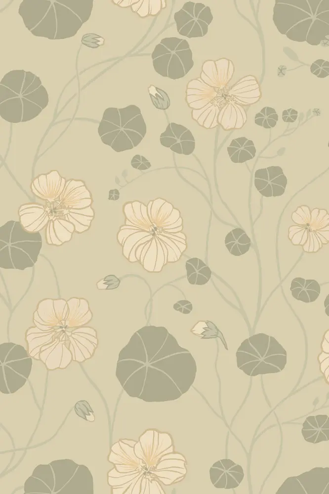 Krasseslinga is een elegant behang met een zacht patroon tegen een lichte achtergrond. Bloemen en bladeren in lichte pasteltinten creëren met hun ronde vormen een gevoel van natuurlijke rust.