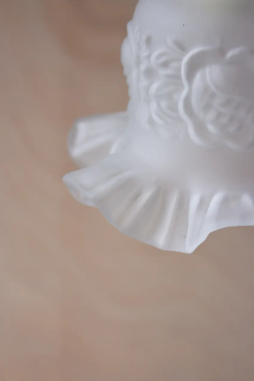 Wat een lief wit glazen hanglampje met ruches. Dat bloemige reliëf in het glas kan zelfs de donkerste hoekjes van een lichte en lieflijke uitstraling voorzien, ook al zonder lichtbron. Het matte witte glas zorgt voor een zachtere verspreiding van het licht.