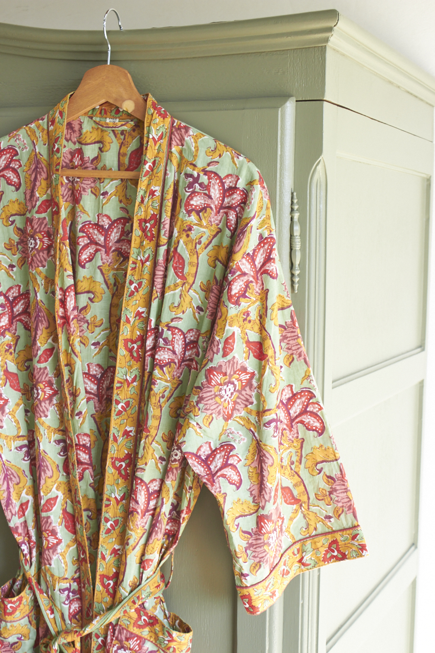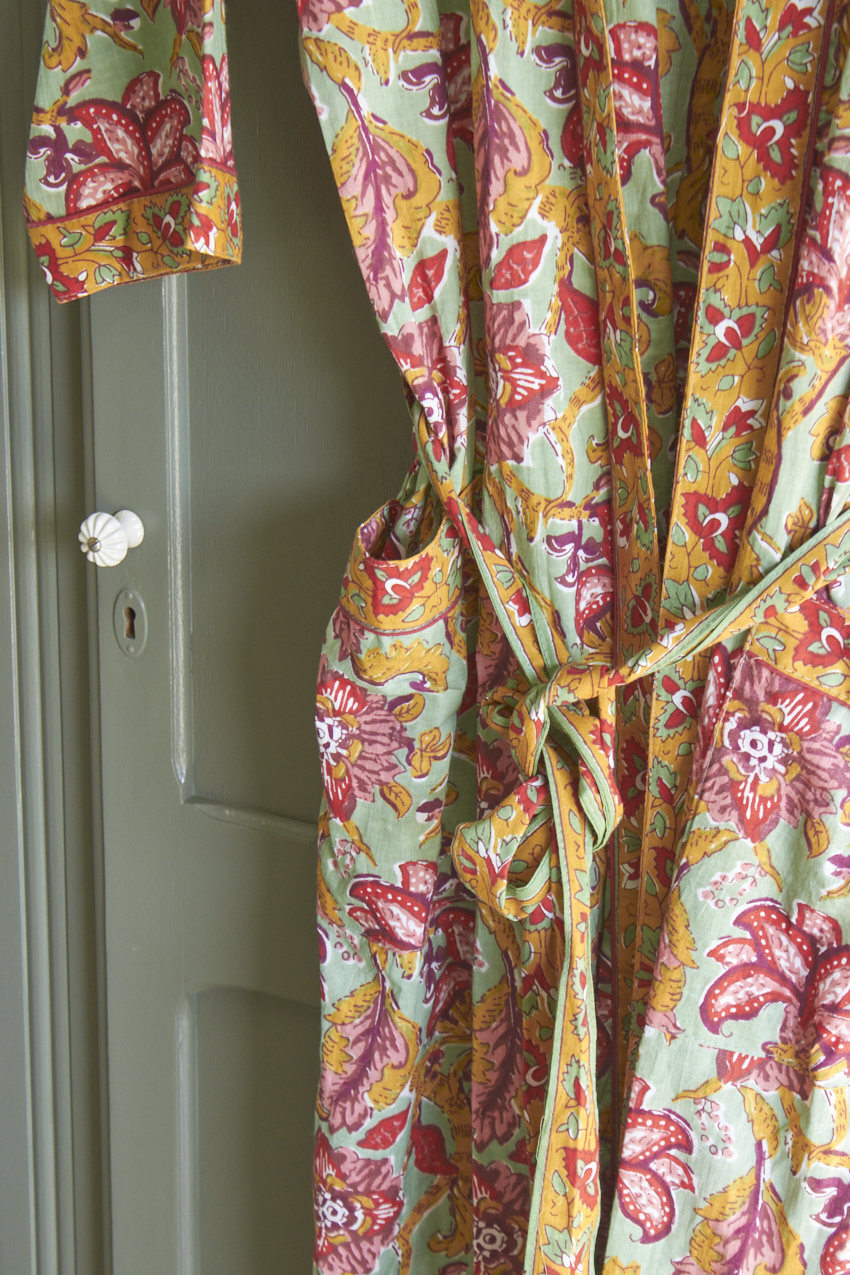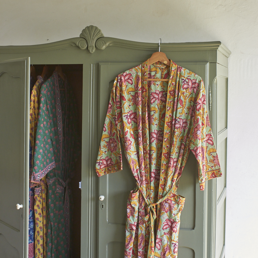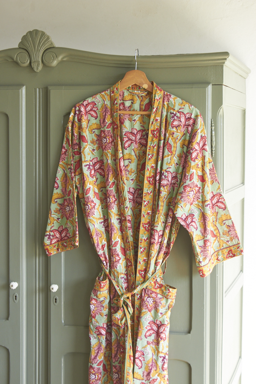 De ochtendjas is een prachtige mix van kleur, patronen en traditioneel vakmanschap. Elke ochtendjas is namelijk met de hand gemaakt in Jaipur, India waarbij een eeuwenoude techniek is gebruikt waar patronen worden gesneden in houten blokken en deze vervolgens op zachte, luchtige stoffen worden gedrukt.