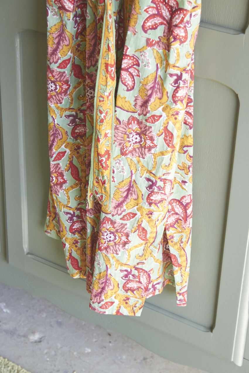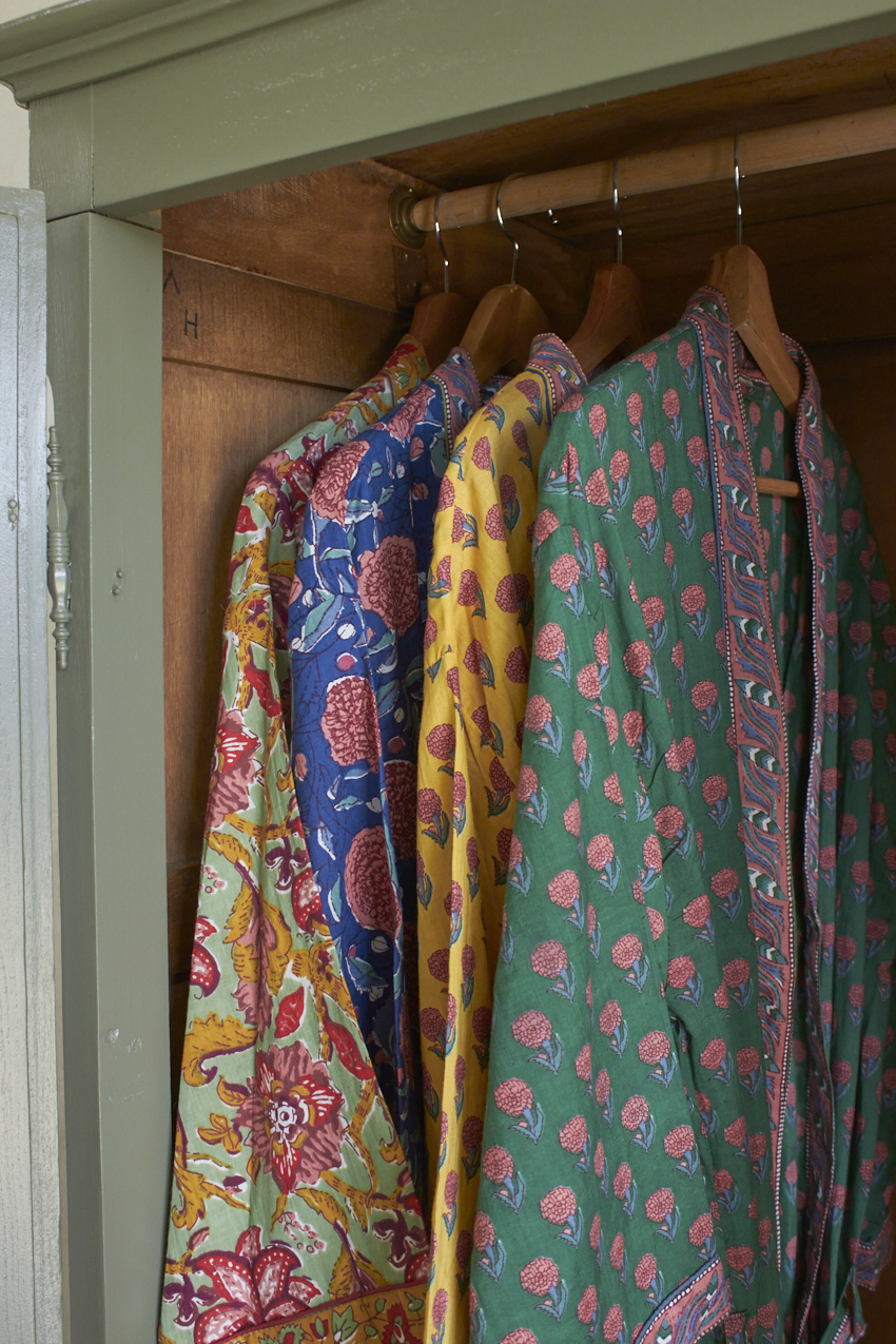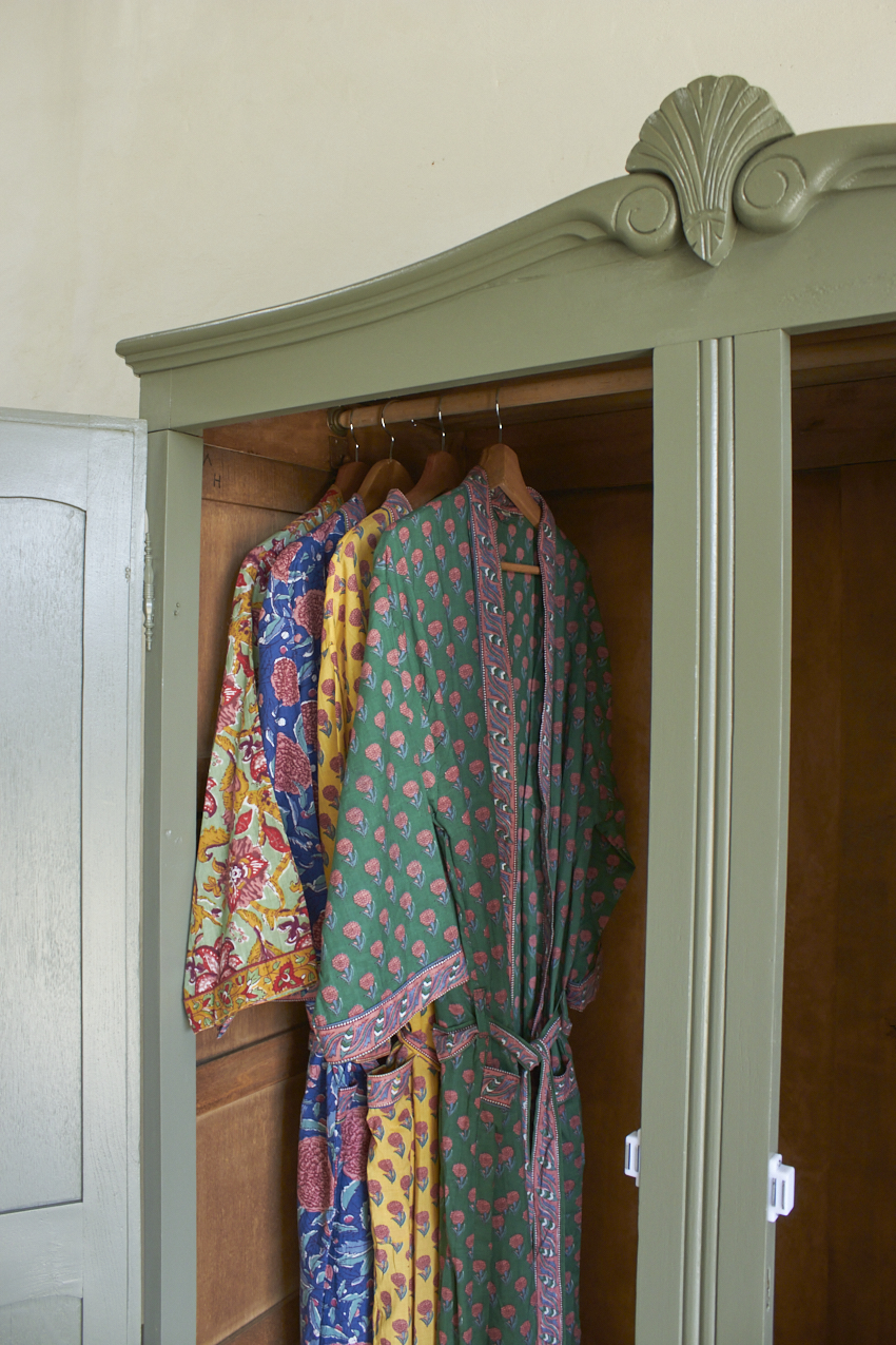 De ochtendjas is een prachtige mix van kleur, patronen en traditioneel vakmanschap. Elke ochtendjas is namelijk met de hand gemaakt in Jaipur, India waarbij een eeuwenoude techniek is gebruikt waar patronen worden gesneden in houten blokken en deze vervolgens op zachte, luchtige stoffen worden gedrukt.
